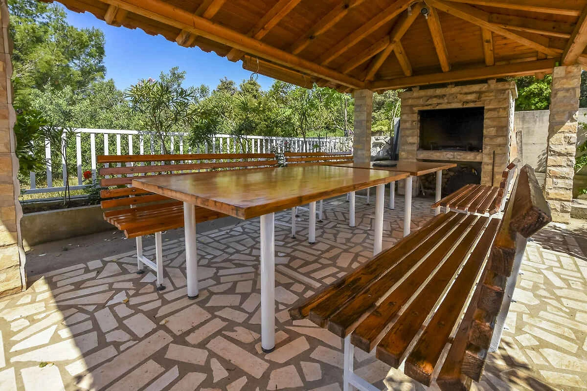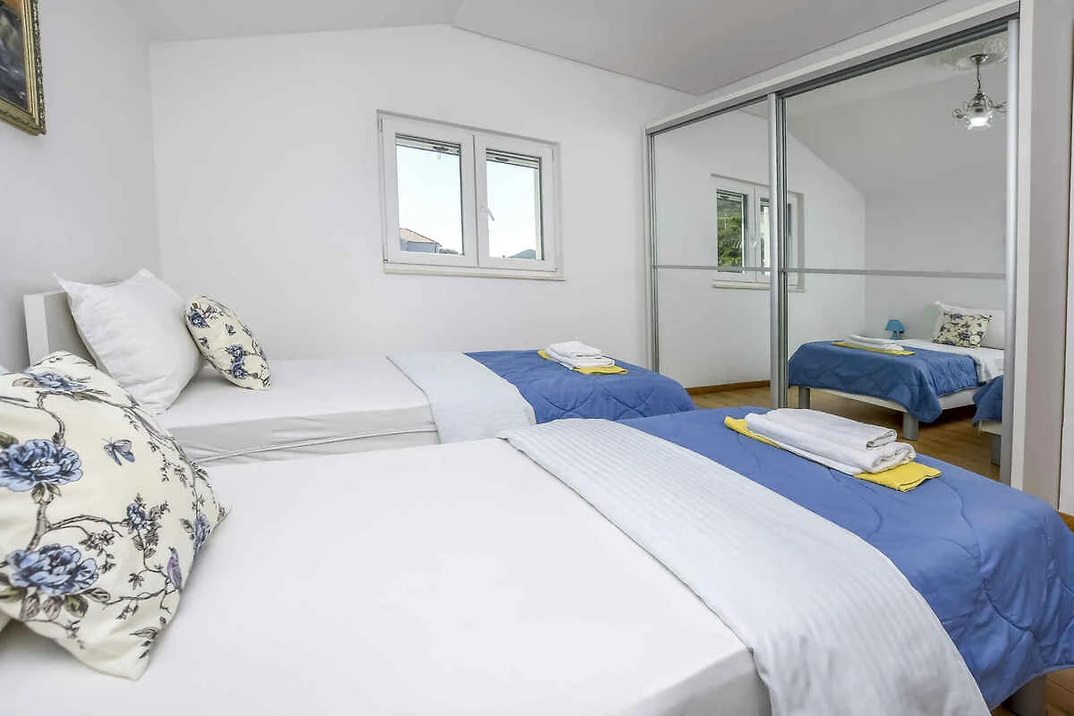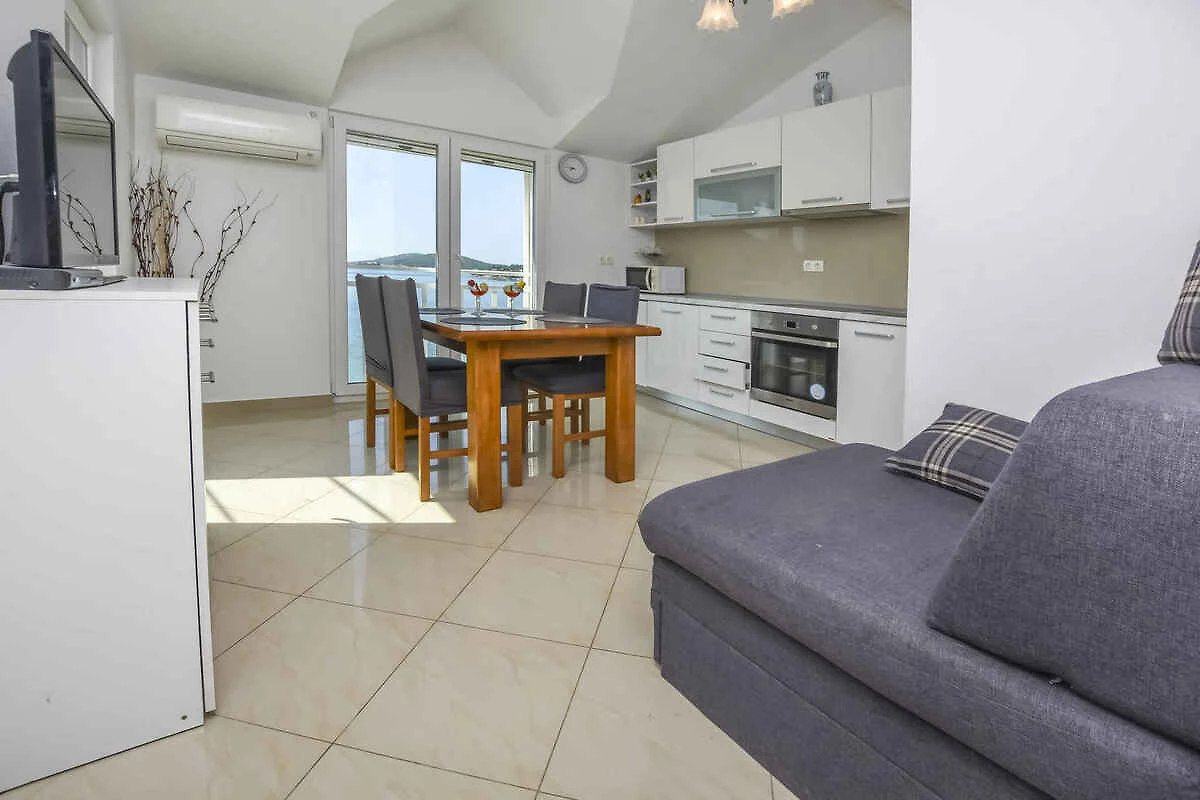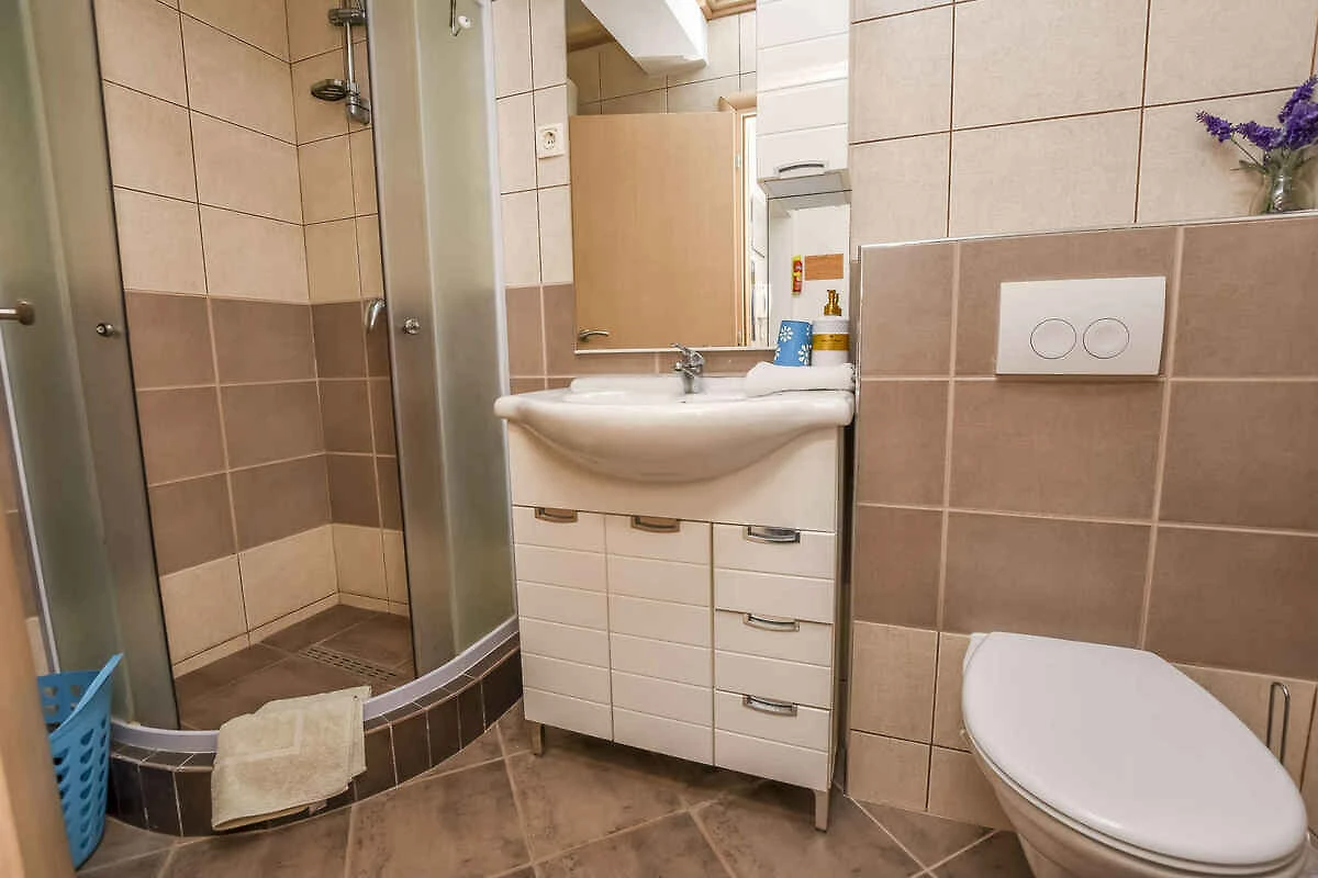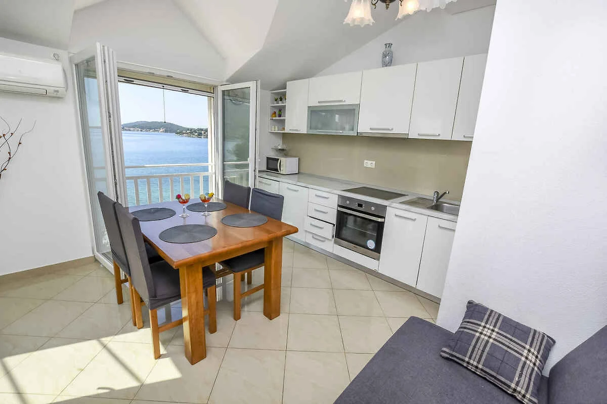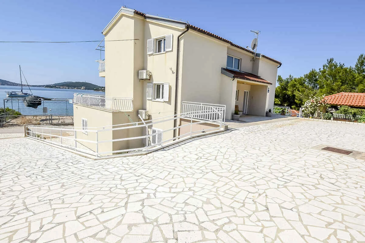 Rogoznica. Die Ferienwohnung befindet sich auf einem geschlossenen Gartengrundstück mit Bäumen, von einer Mauer begrenzt. Der Vermieter wohnt im Haus, nutzt jedoch einen separaten Eingang. Der grösste Vorteil ist die Nähe zum Strand, der nur 10 m entfernt ist. Die Zufahrt erfolgt direkt von der Hauptstrasse (asphaltiert). Parkplatz auf dem Grundstück.
