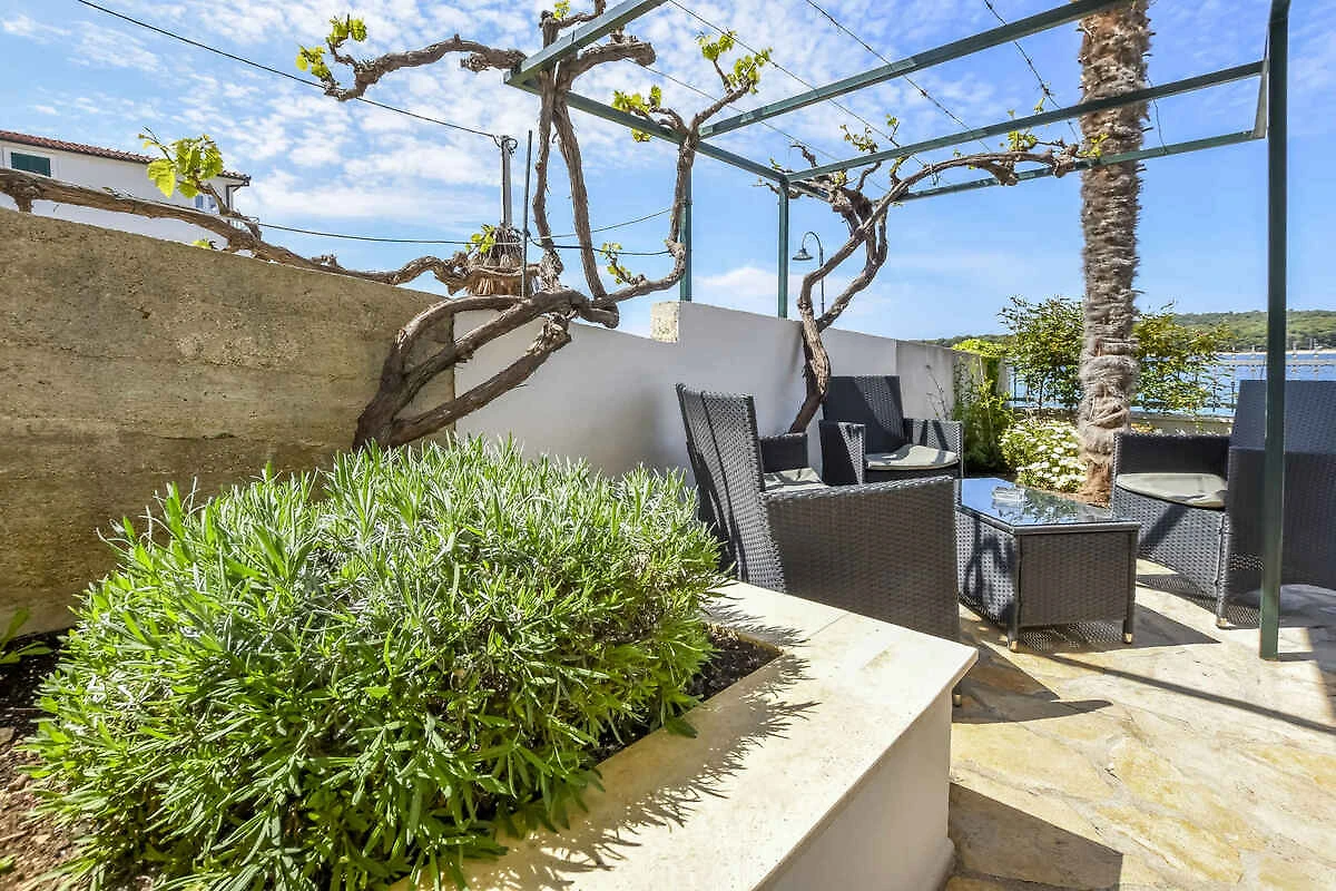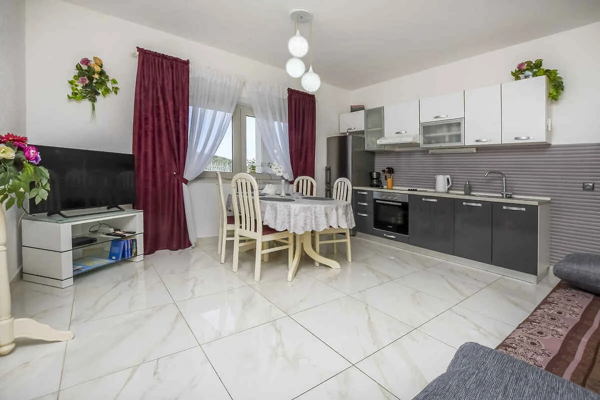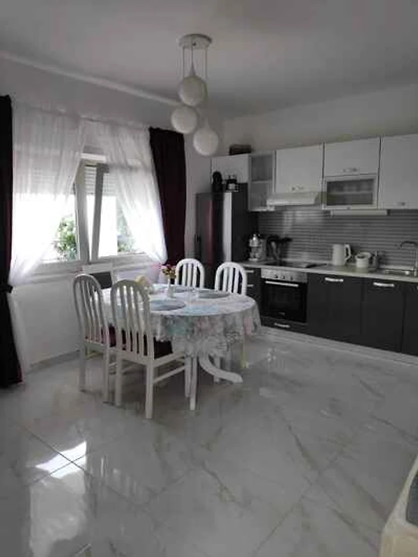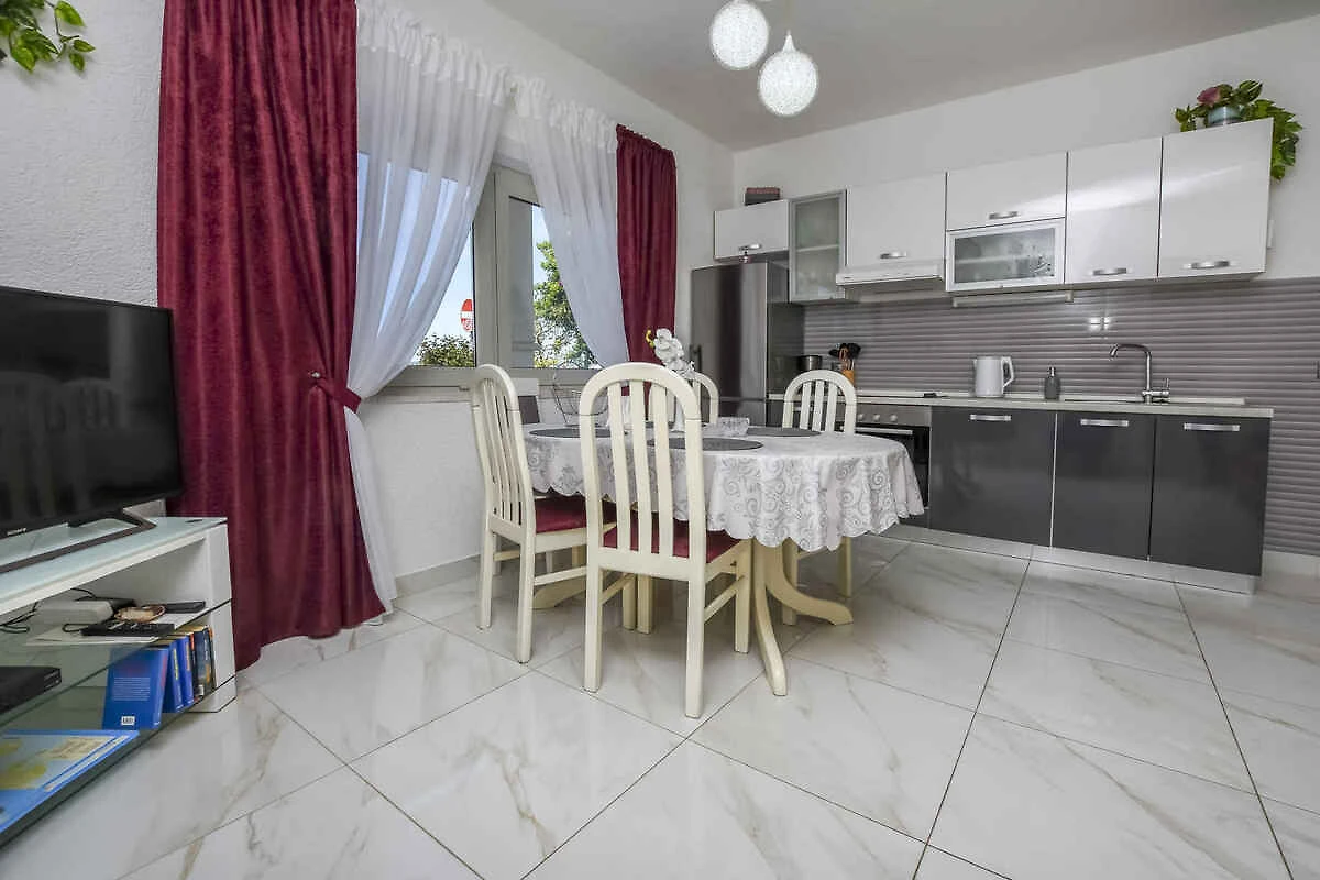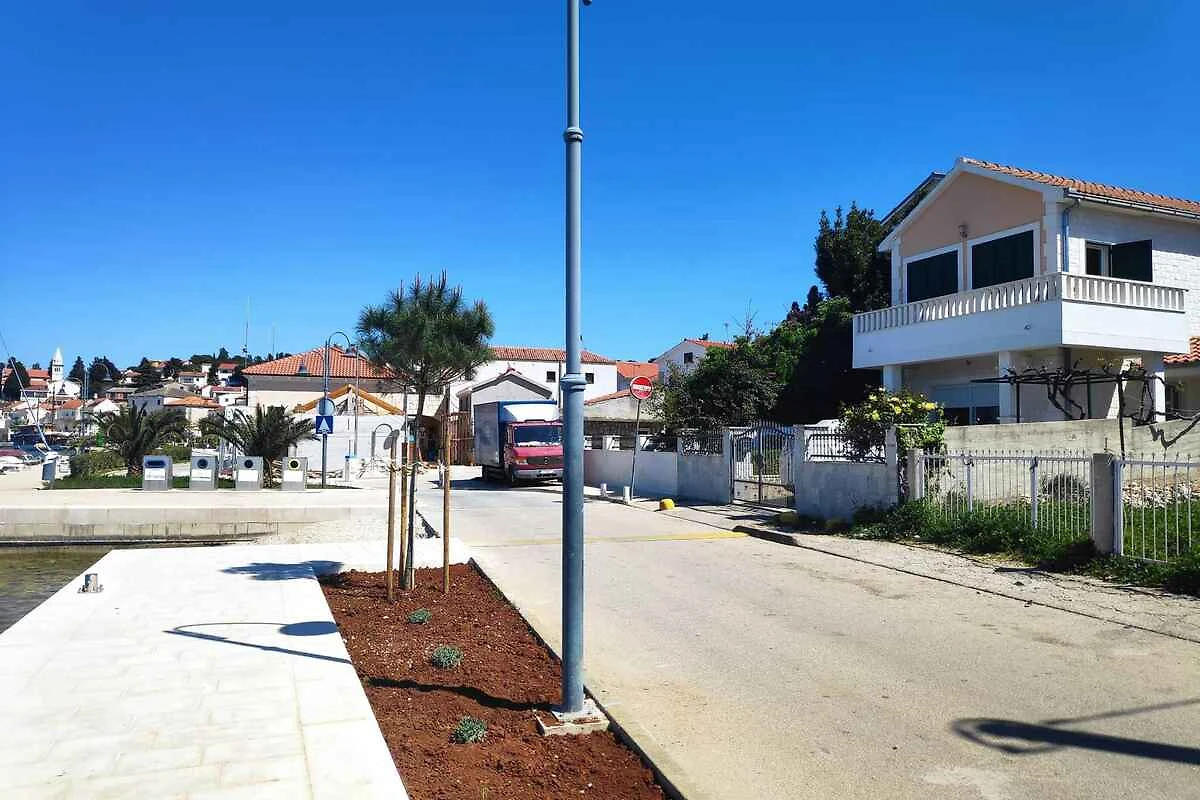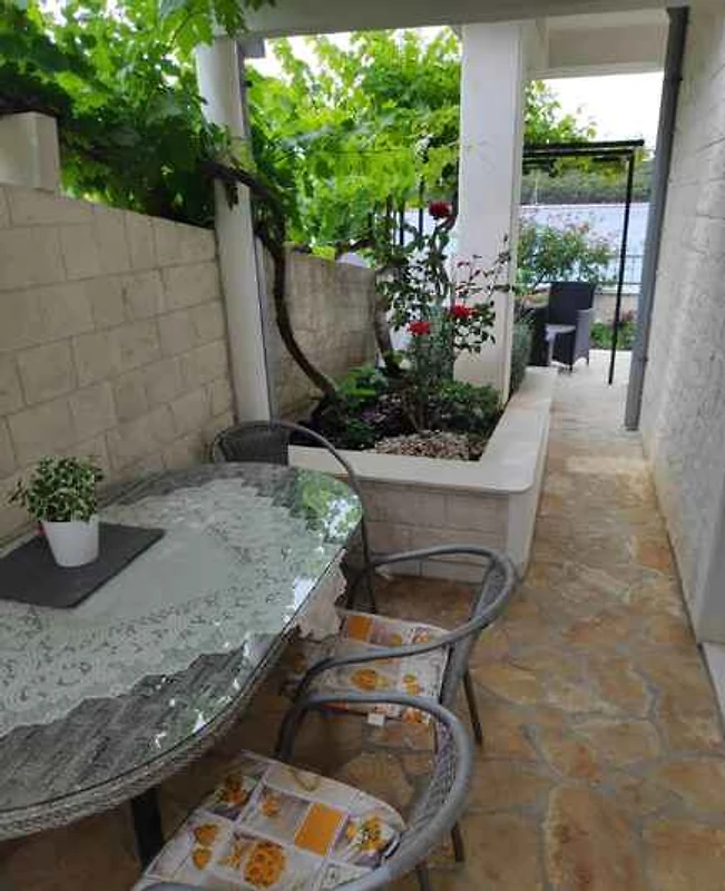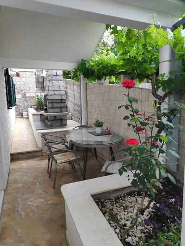 Rogoznica. Die Ferienwohnung befindet sich auf einem Gartengrundstück mit Wiese, Blumen und Bäumen. Die Zufahrt erfolgt über eine Nebenstrasse. Parkplatz (für 1 Pkw) auf der Strasse vor dem Haus.
