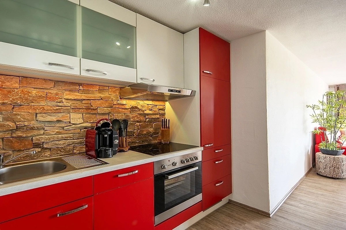 Die hell und freundlich eingerichtete Wohnung vermittelt einen naturverbundenen Flair mit viel Holz und Stein. Zudem verbreitet der Elektrokamin und ein eleganter Deckenventilator eine besondere, gemütliche Atmosphäre. So erhalten Sie auch an kalten und nassen Tagen eine besondere Urlaubsatmosphäre.