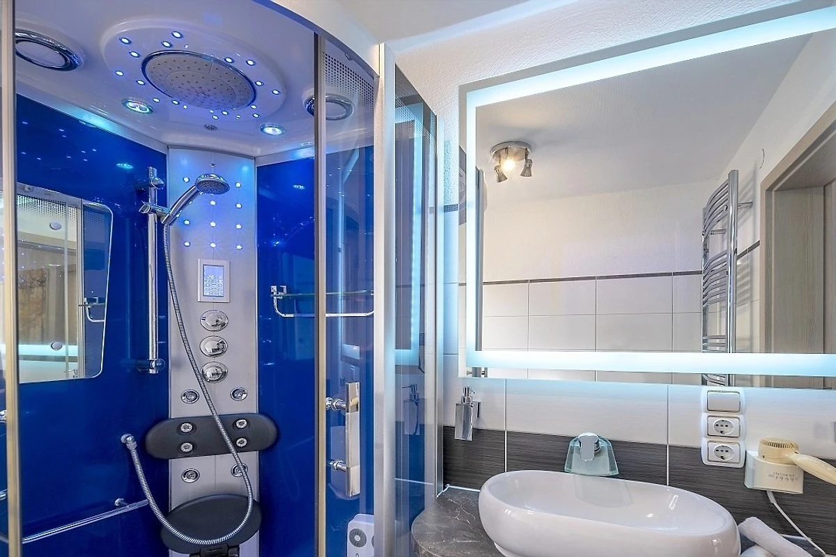 Die im gesamten Bad, blau leuchtenden Boden-LED´s bieten eine tolle Atmosphäre. Ein grosser, beleuchteter Spiegel, ein Hotelfön und eine Personenwaage sind vorhanden. Moderne, Chrom-Heizung mit Handtuchwärmer.