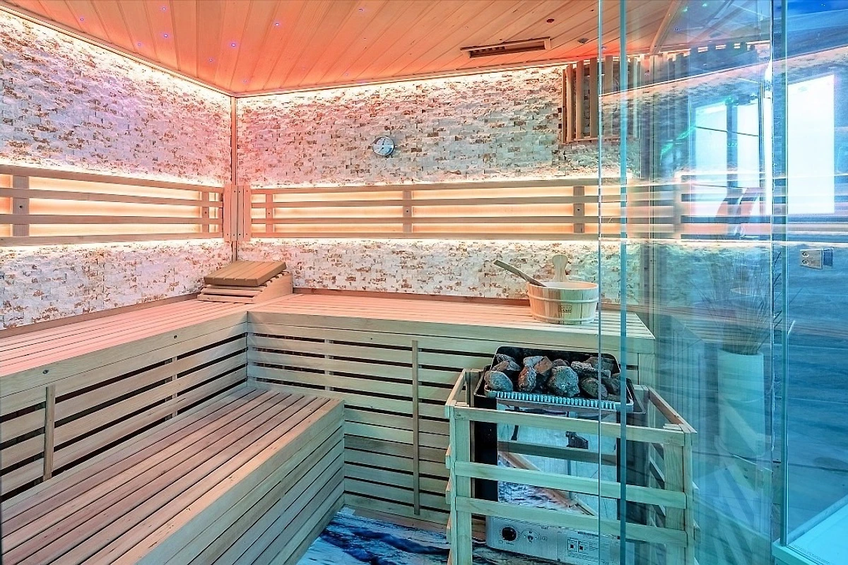 Die im gesamten Bad, blau leuchtenden Boden-LED´s bieten eine tolle Atmosphäre. Ein grosser, beleuchteter Spiegel und Schminkspiegel, ein Hotelfön und eine Personenwaage sind vorhanden. Moderne Heizung mit Handtuchwärmer.