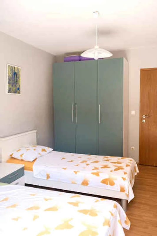 und führt direkt in das Wohn/Schlafzimmer. Wohn/Schlafzimmer mit 2 Zusatzbetten auf Sitzecke, TV und Essecke. Schlafzimmer (13 qm) mit 1 Doppelbett. Schlafzimmer (10 qm) mit 2 Einzelbetten, Zugang zum Balkon (10 qm, Gartenmöbel) und Leistung nach Bestellung: Kinderbett. Kochecke im Wohn/Schlafzimmer mit Gasherd, Backofen, Geschirrspüler, Kühlschrank (Eisfach), Mikrowelle, Kaffeemaschine und Toaster. Bad mit Dusche, 1 Waschbecken, WC, Föhn und Bettwäsche, Handtücher, Bügeleisen