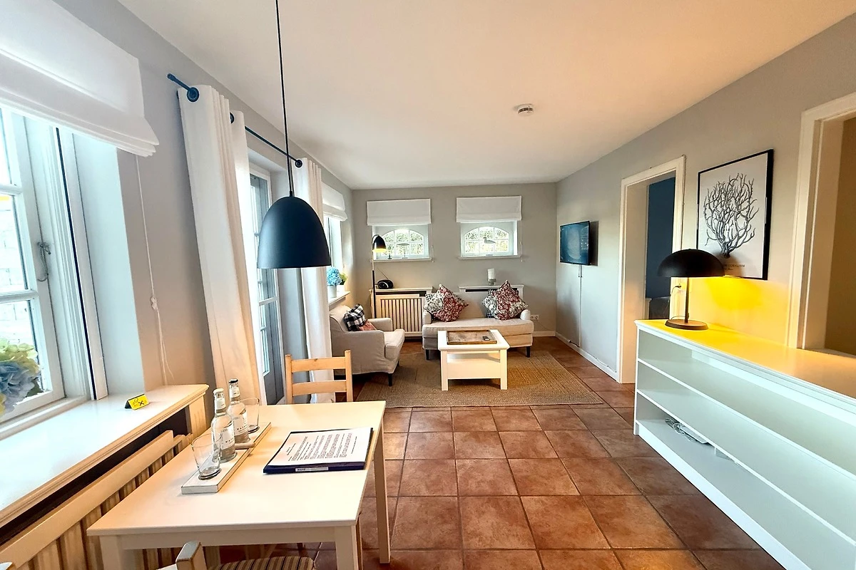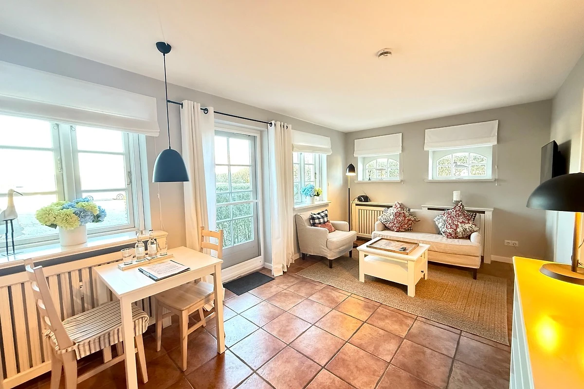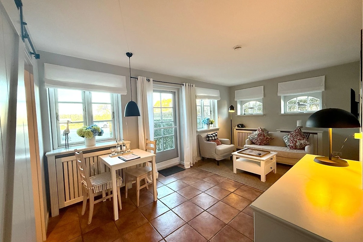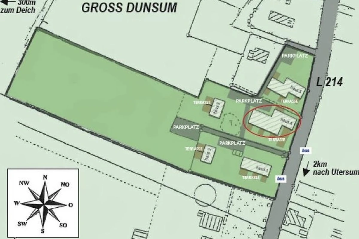 Zu dieser Wohnung gehört ein PKW Stellplatz am Haus. In wenigen Fussmetern erreichen Sie den Hauswirtschaftsraum mit Waschmaschinen und Trocknern, auch zu Ihrer Verfügung. Von hier aus haben Sie einen perfekten Ausgangspunkt für lange Spaziergänge am Strand und zur Wattwanderung nach Amrum, Fahrradtouren zu den Nachbarorten und in die Marsch und zu dem wohl schönsten Sonnenuntergang der Nordseeregion.Der Deichhof ist in der Gemeinde Dunsum angesiedelt, die im Westen der Insel Föhr liegt. Er liegt an der verkehrsberuhigte Ortsdurchfahrtstrasse und reicht an weitläufige Wiesenflächen, die direkt an den 500 m entfernt liegenden Deich der Nordsee reichen, mitten in die Natur eingebettet. Der Deichhof kann somit als Oase der Ruhe und Natürlichkeit betrachtet werden. Die Wohnung verfügt seit Juni 2024 über WLAN und wurde im Herbst 2024 umfassend renoviert.