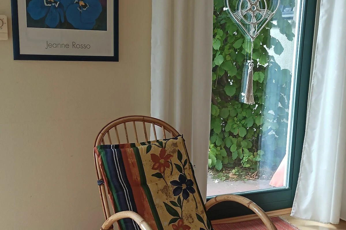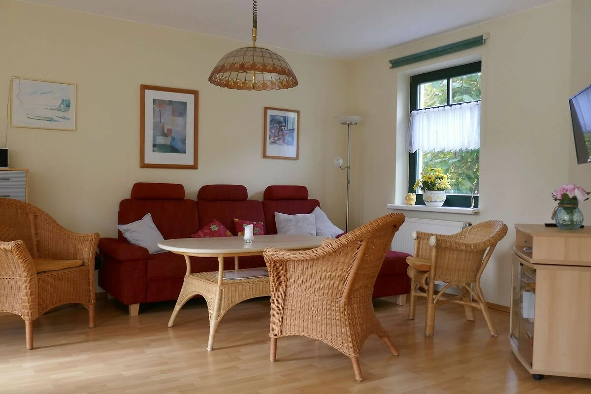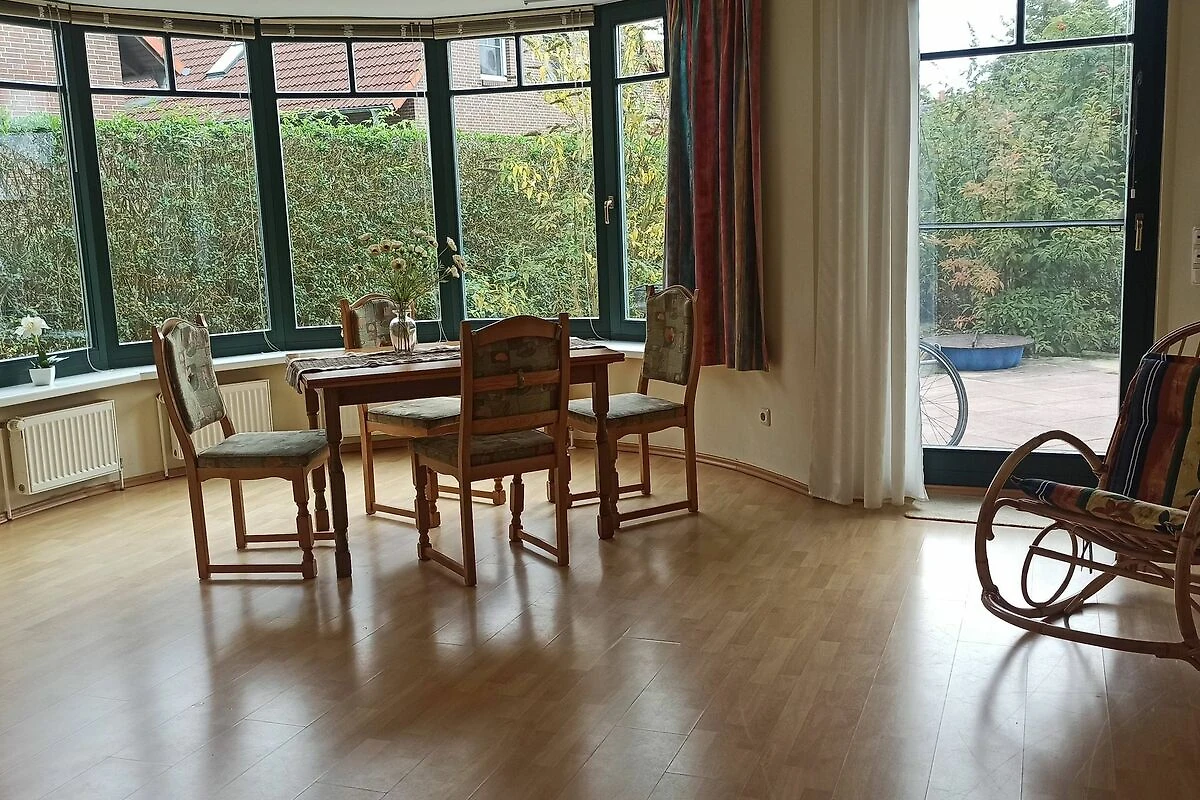 Im Erdgeschoss befindet sich das geräumige Wohnzimmer mit einem sehr schönen Essbereich in einem Halbrund aus Fenstern, so dass viel Licht die Sinne erfreut. Und sollte es wirklich einmal regnen, haben sie im Sitzbereich den Raum zum Nichtstun, Lesen oder was sie auch immer mögen. Ein Fernseher mit SAT-Anschluss sowie eine Stereoanlage mit CD-Player steht Ihnen ebenfalls zur Verfügung. Natürlich haben Sie überall im Haus WLAN-Verbindung.
