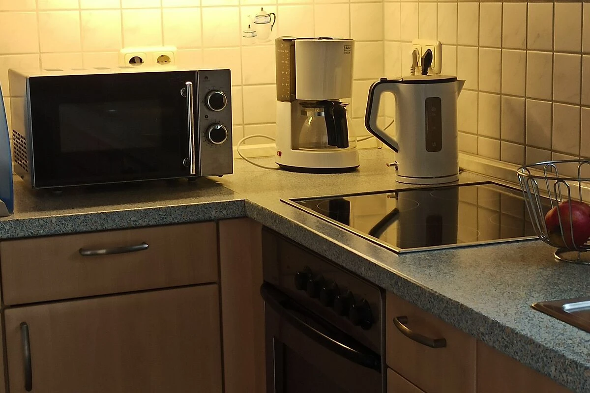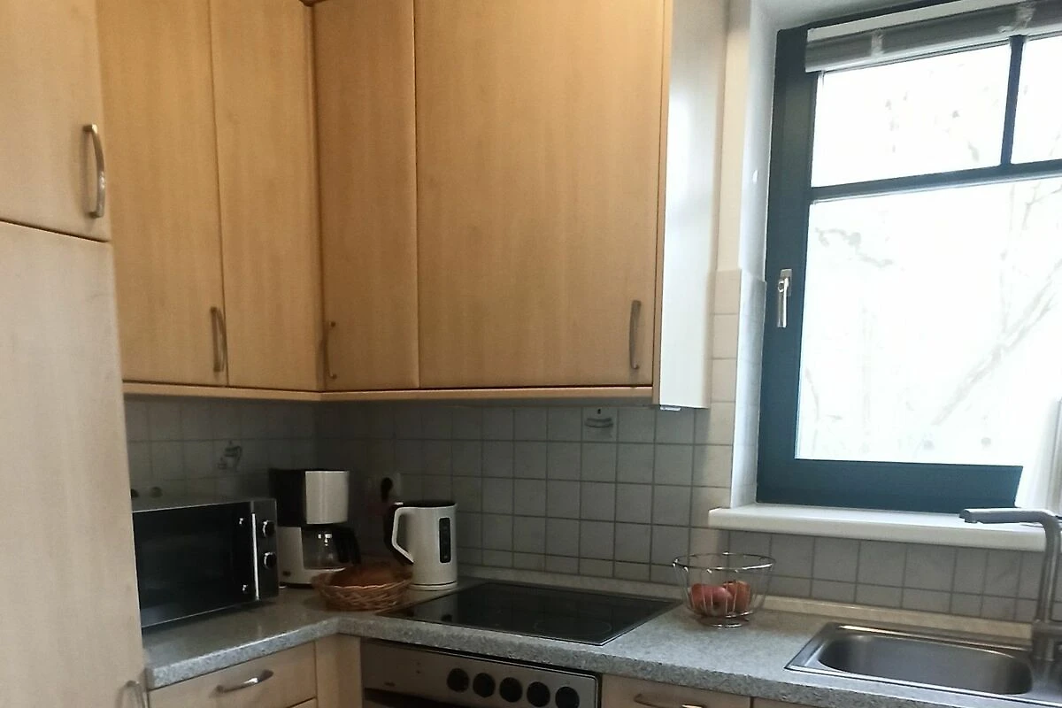 Nebenan, durch eine Tür getrennt, befindet sich die Küche, die über einen Herd, Backofen, Spülmaschine, Kühlschrank mit Gefrierfach, eine Mikrowelle und eine Kaffeemaschine verfügt. Auf dieser Etage steht Ihnen ausserdem ein Gäste-WC zur Verfügung.