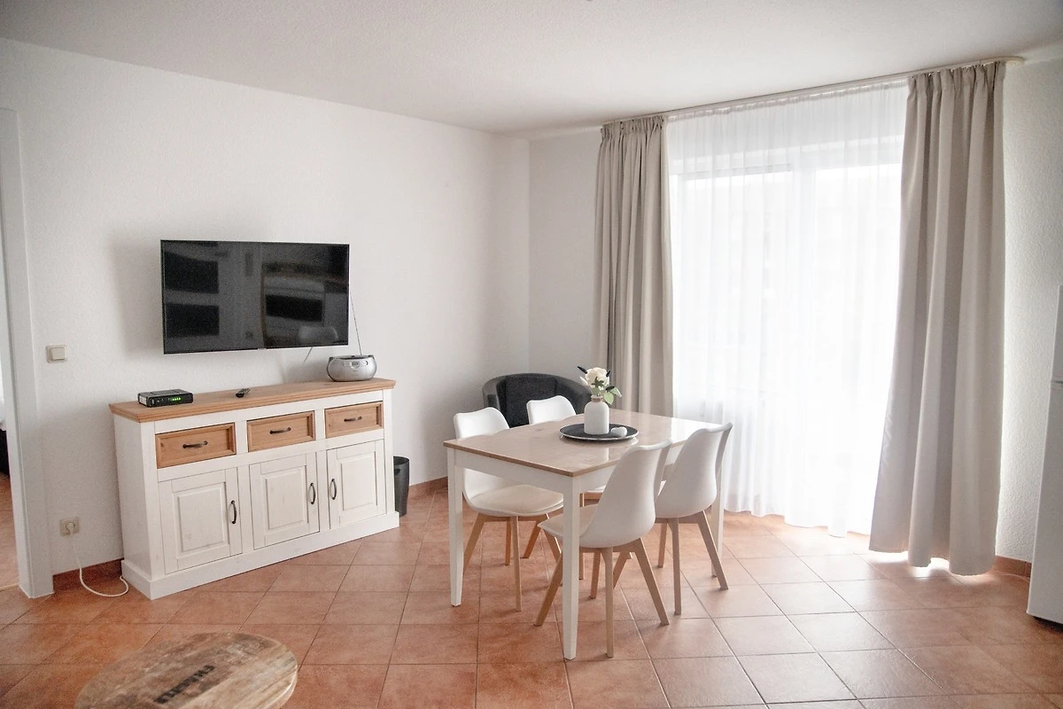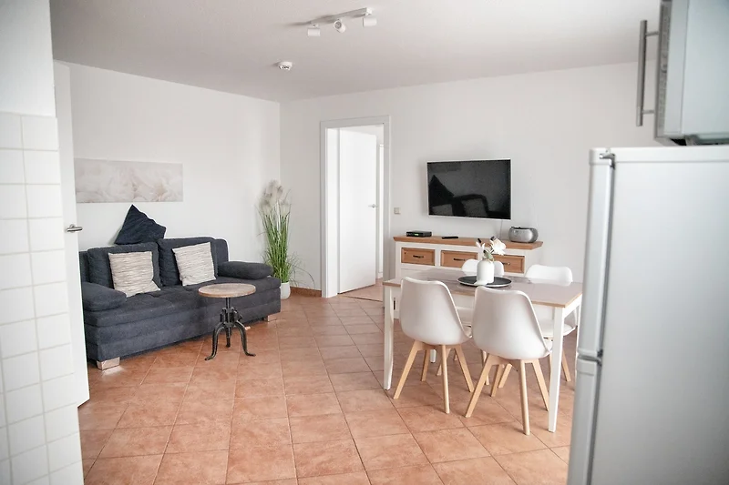 Das Wohnzimmer verfügt über einen Esstisch mit vier Stühlen, ein ausziehbares Schlafsofa mit einem Schlafplatz für zwei Personen und einen Sessel. Multimedial steht Ihnen hier ein Flachbildfernseher zur Verfügung. Ihre Ferienwohnung hat einen Kabelanschluss. Auch einige Gesellschaftsspiele dürfen hier im Bestand nicht fehlen. In Ihrem Schlafzimmer befindet sich ein Doppelbett. Nachtische und Leselampen möchten hier von Ihnen genutzt werden. Der Schrank wird Ihnen gute Dienste leisten und genügend Stauraum für Ihr Gepäck bieten. Die Küche ist zum Wohnzimmer hin offen, was den Raum noch grosszügiger erscheinen lässt. Ihre Küchenzeile ist voll ausgestattet. Bestandteile sind unter anderem ein Kochfeld, eine Kaffeemaschine, viel Geschirr, ein Geschirrspüler, einen Backofen eine Mikrowelle sowie eine Kühl- und Gefrierkombination. Kulinarisch sind hier also keine Grenzen gesetzt. Ihr Badezimmer ist mit einer ebenerdigen Duschkabine und ausreichend Ablageflächen ausgestattet. Ihr Flur beherbergt eine Garderobe und einen grossen Spiegel für Sie. Das Appartement Kai liegt im Erdgeschoss des Hauses Wikinger, im Eingang 2. In unmittelbarer Nähe dieses Appartements befinden sich weitere Ferienappartements unserer Gesellschaft. Eine gemeinsame Anmietung ist hier sehr gut möglich.