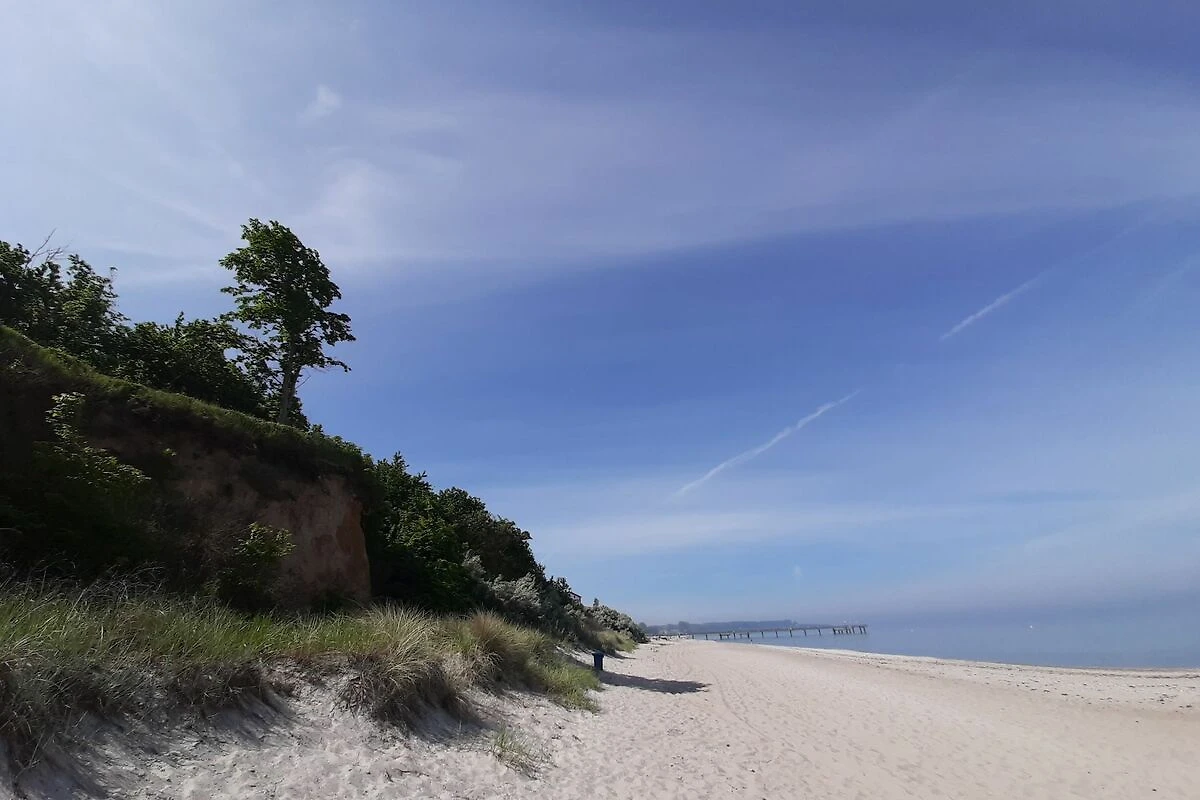 In 150 m Entfernung liegt der gepflegte Ostseestrand mit Strandkörben und einer Seebrücke.