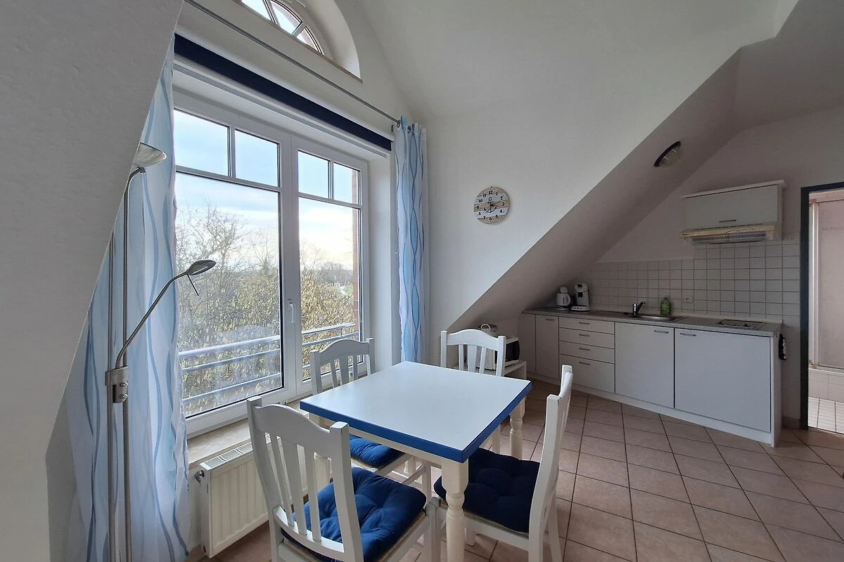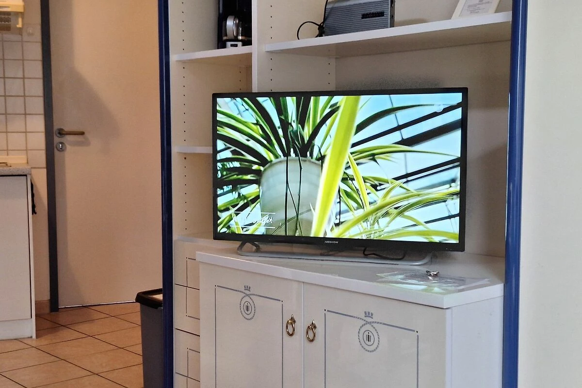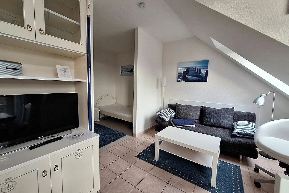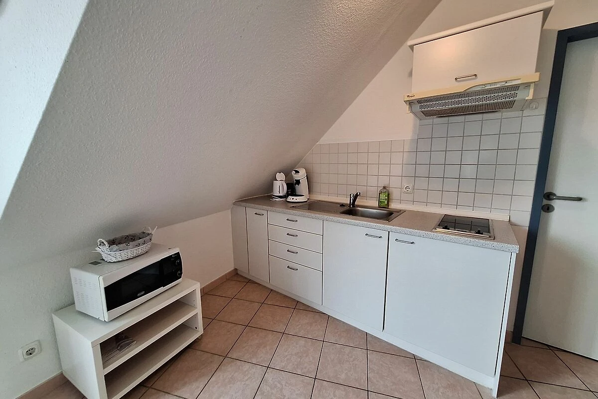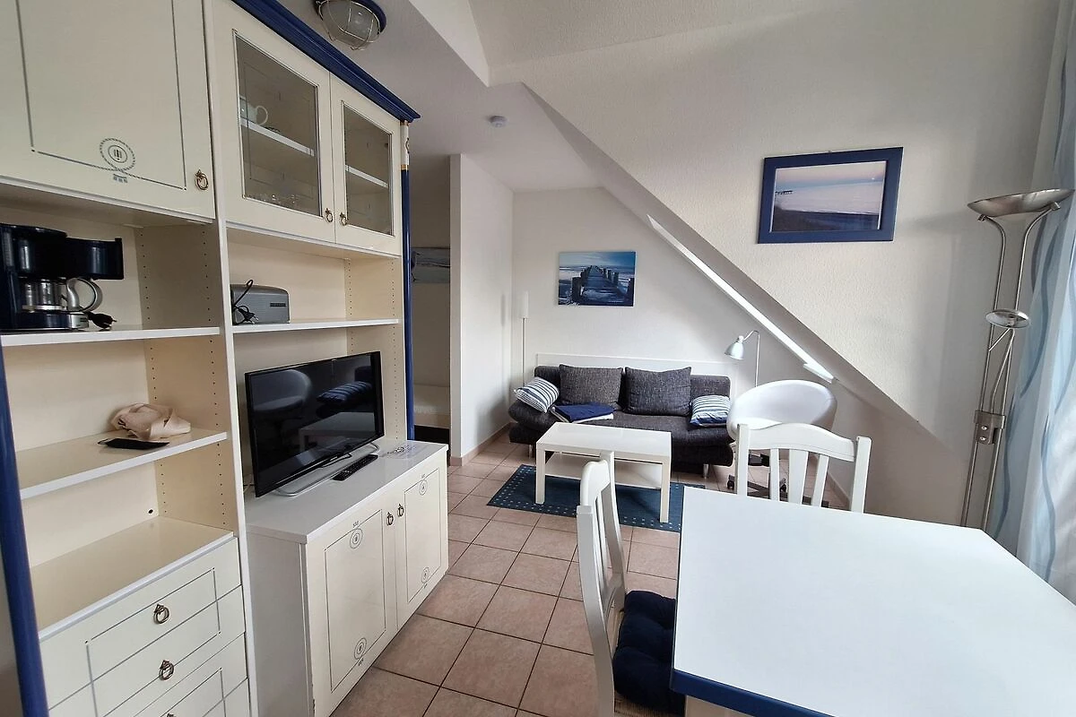 Das Wohnzimmer ist ausgestattet mit einer Schlafcouch, Sat-TV und integriertem Essbereich. Angrenzend ist eine Küchenzeile mit Kühlschrank und Gefrierfach, 2-Platten-Herd, Mikrowelle, Senseo- und Filter- Kaffemaschine, Wasserkocher u. Toaster.
