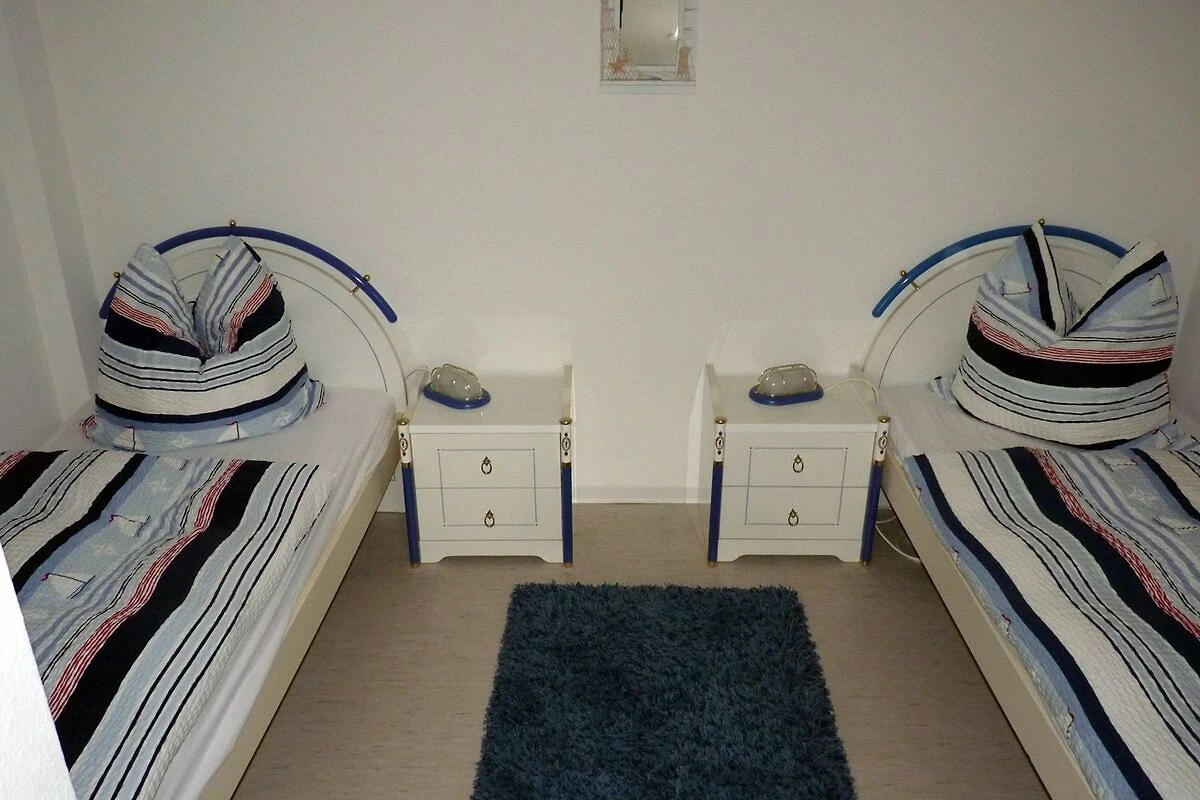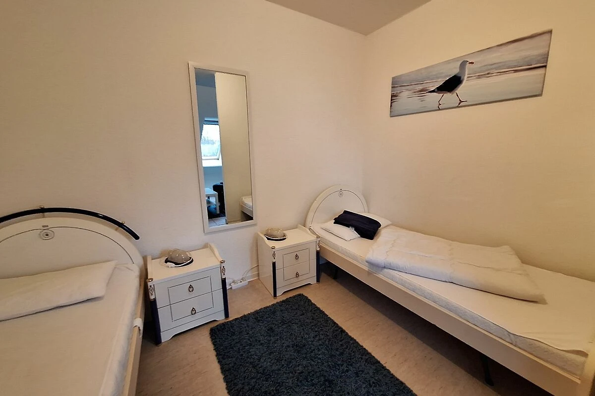 Das offene Schlafzimmer ist mit 2 Einzelbetten ausgestattet.