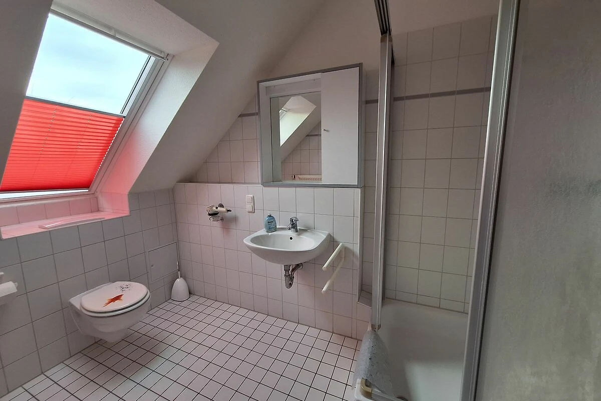 Sie finden ein geräumiges Tageslicht- Badezimmer mit Dusche u. WC vor.