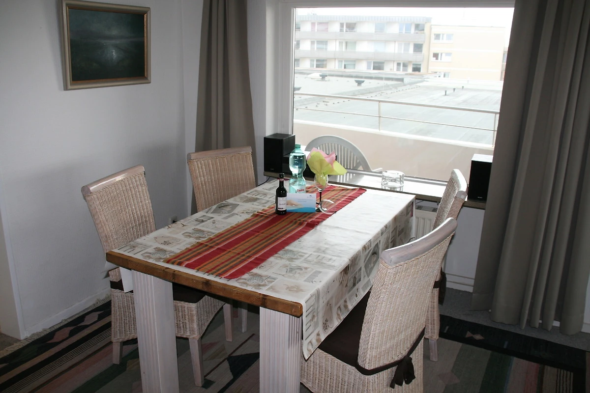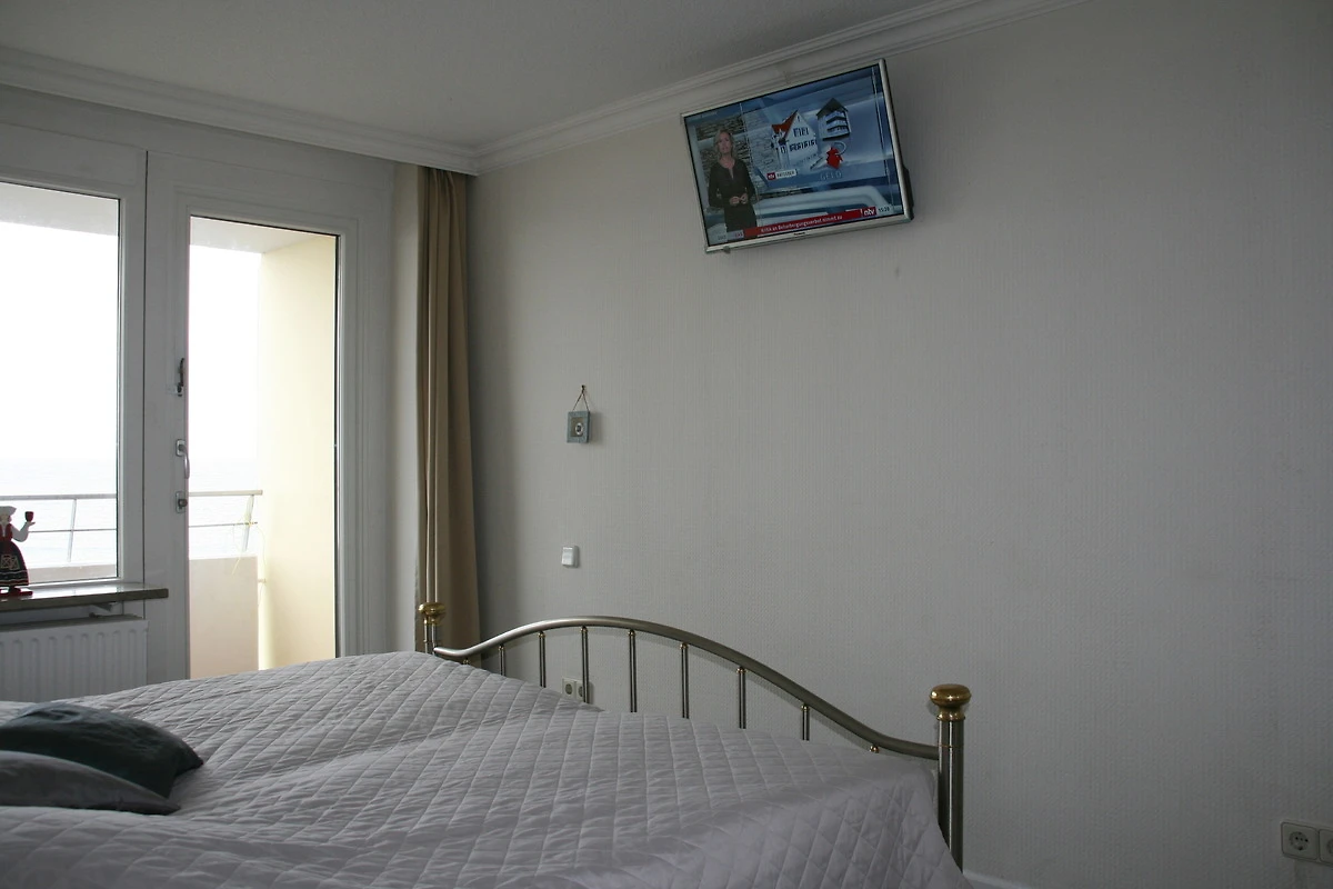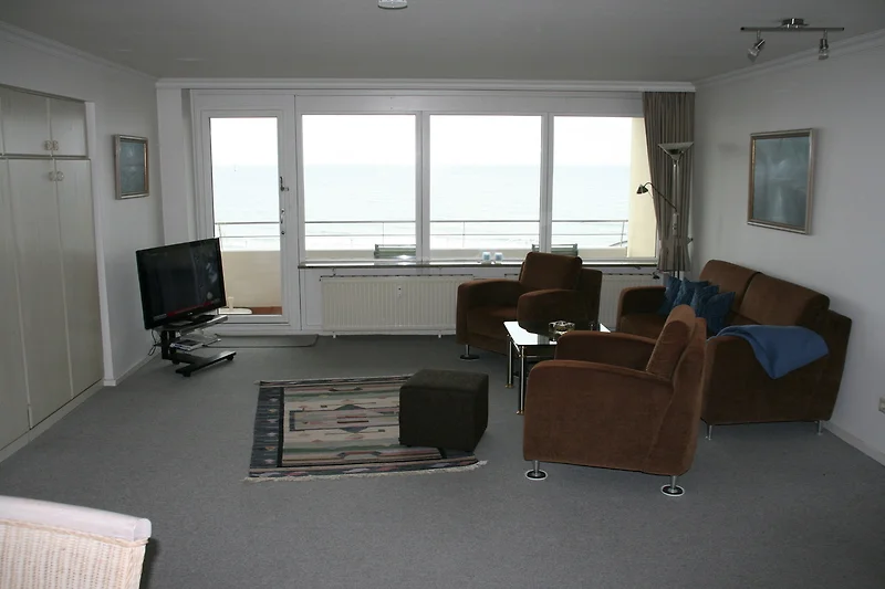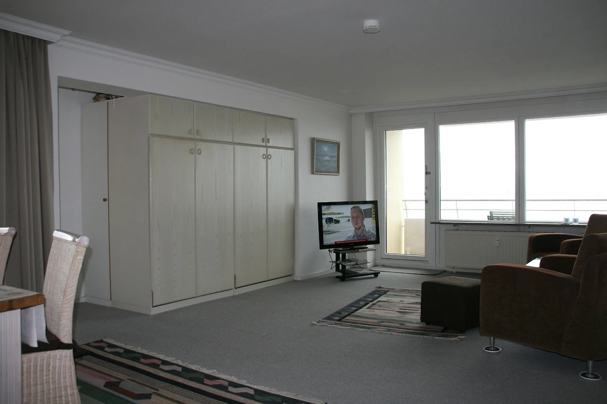 Grosses helles Wohnzimmer mit zwei einzeln ausklappbaren Schrankbetten, Sitzgarnitur (2 Sessel und Sofa), Flachbildfernseher, Esstisch direkt am Fenster mit Blickrichtung Süd. Die Wohnung verfügt insgesamt über drei Balkone, allesamt mit Meerblick. Hell gefliestes, grosses Badezimmer mit Dusche und WC, Doppelwaschtisch. Separate Küche mit Fenster, Geschirrspüler, Ceranfeld, Backofen und Mikrowelle. Das separate Schlafzimmer mit einem Doppelbett, Zweitfernseher und eigenem Balkon zur Meerseite runden das Bild dieses grosszügig geschnittenen Appartements ab. KEIN Teppichboden. Das hauseigene WLAN ist kostenfrei.