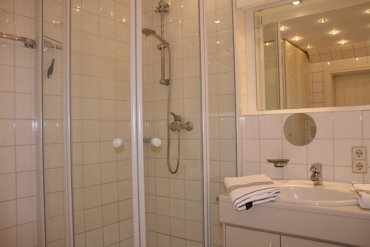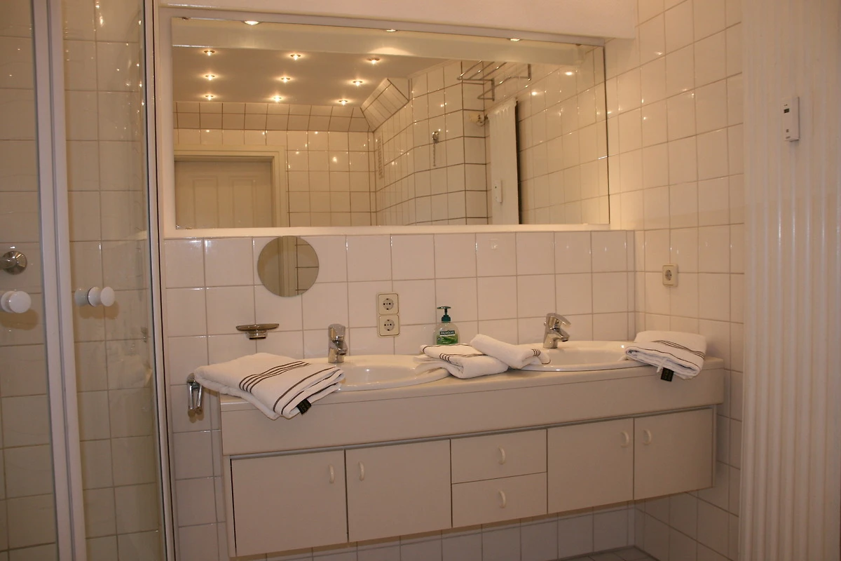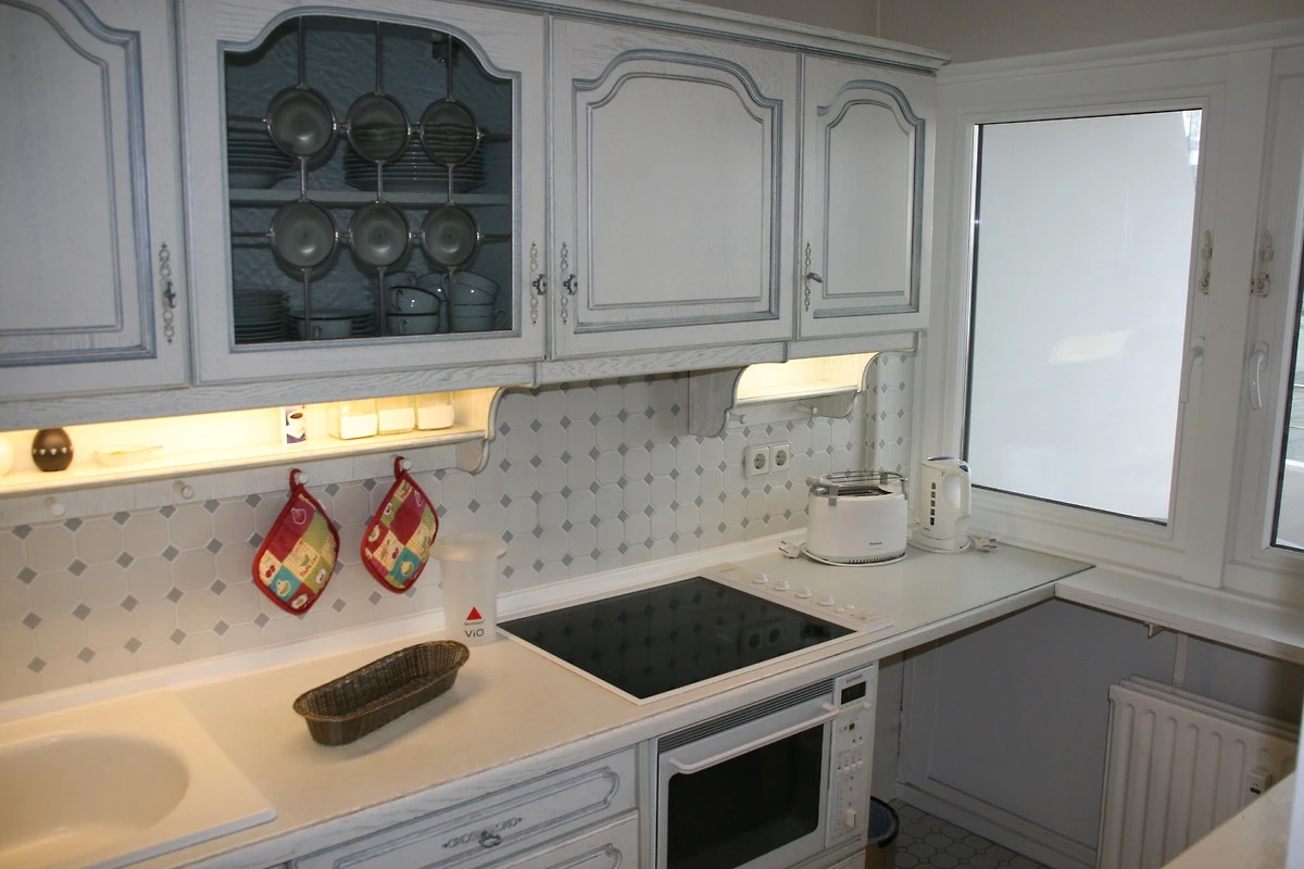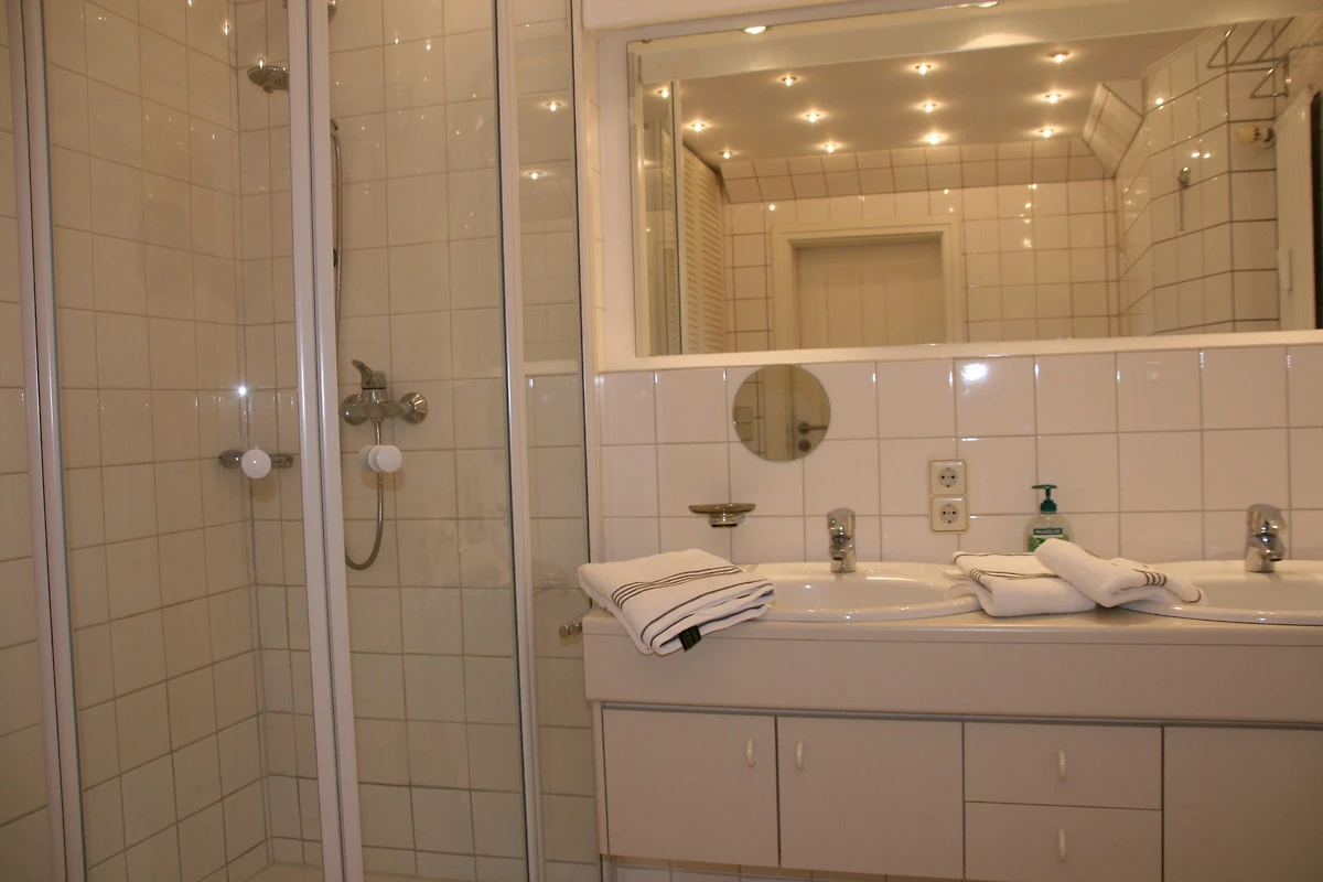 Grosses helles Wohnzimmer mit zwei einzeln ausklappbaren Schrankbetten, Sitzgarnitur (2 Sessel und Sofa), Flachbildfernseher, Esstisch direkt am Fenster mit Blickrichtung Süd. Die Wohnung verfügt insgesamt über drei Balkone, allesamt mit Meerblick. Hell gefliestes, grosses Badezimmer mit Dusche und WC, Doppelwaschtisch. Separate Küche mit Fenster, Geschirrspüler, Ceranfeld, Backofen und Mikrowelle. Das separate Schlafzimmer mit einem Doppelbett, Zweitfernseher und eigenem Balkon zur Meerseite runden das Bild dieses grosszügig geschnittenen Appartements ab. KEIN Teppichboden. Das hauseigene WLAN ist kostenfrei.