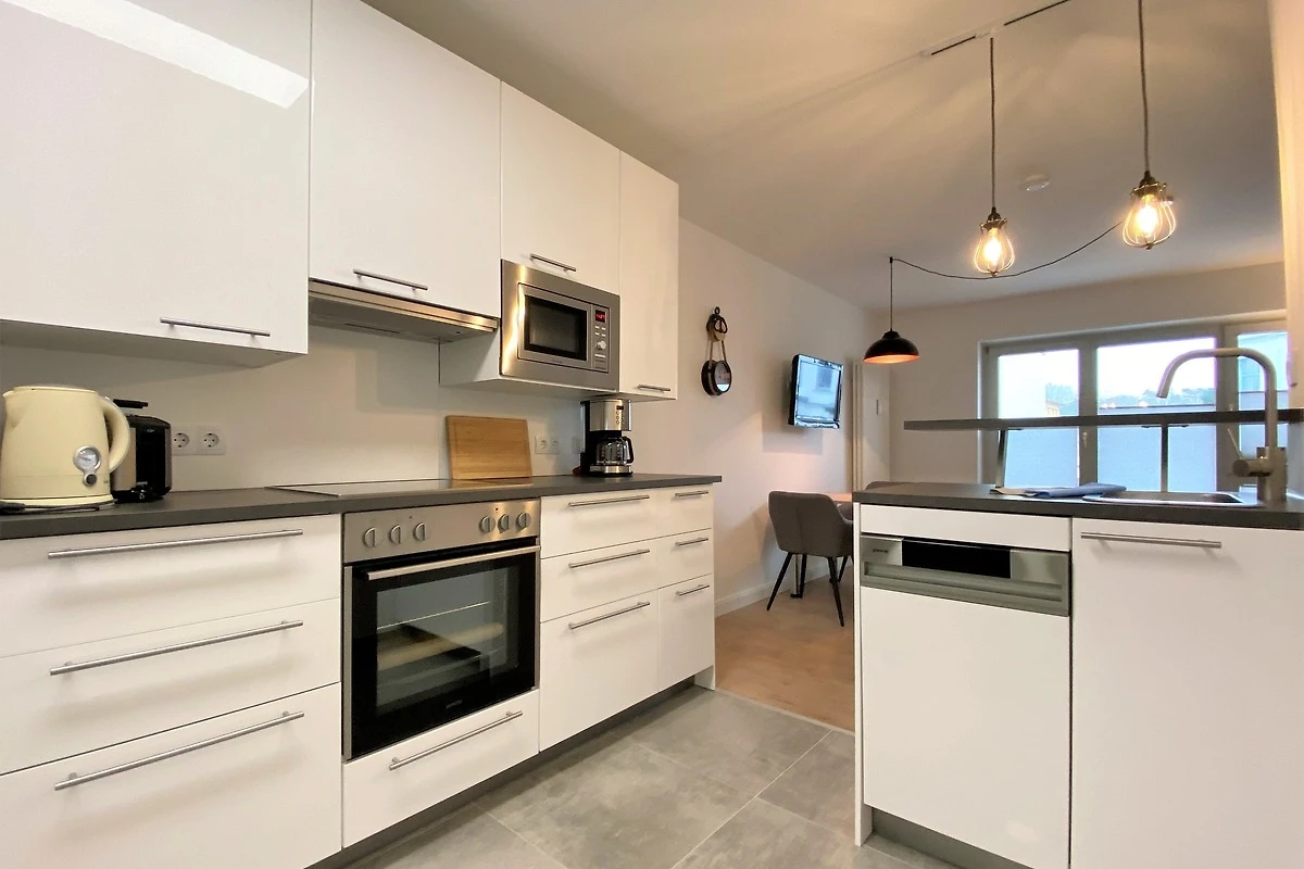 An den Wohnbereich schliesst sich die komplett eingerichtete, hochwertige Küchenzeile an: Nebst 4-Platten-Cerankochfeld mit Backofen und Mikrowelle, stehen Ihnen ausserdem Toaster, Wasserkocher, Kaffeemaschine, Geschirrspüler und Kühlschrank zur vollen Verfügung!