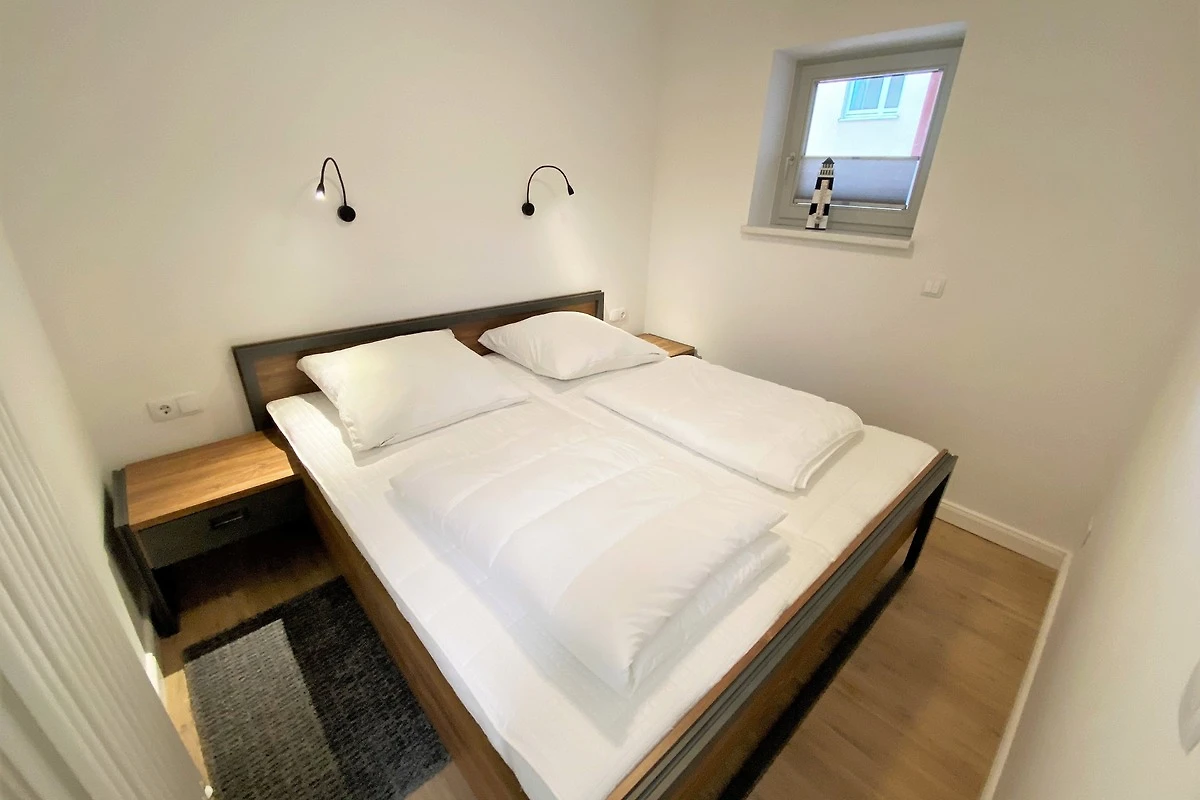Das separate Schlafzimmer sorgt mit einem gemütlichen Doppelbett (1,80m x 2m, 2 getrennte Matratzen) für erholsamen Schlaf und süsse Träume. Für die mitgebrachte Urlaubsgarderobe steht Ihnen genügend Stauraum im Flur zur Verfügung.