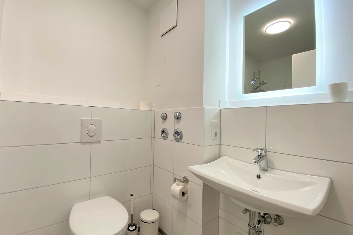Das geschmackvoll geflieste Badezimmer verfügt über eine ebenerdige Dusche, WC sowie über einen grossen beleuchteten Spiegel und genügend Ablagemöglichkeiten.