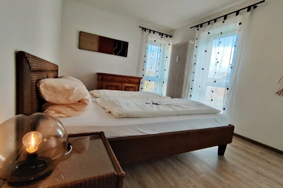 Das separate Schlafzimmer bietet Ihnen einen ruhigen Rückzugsort für erholsame Nächte. Hier finden Sie ein gemütliches Doppelbett (180x200).