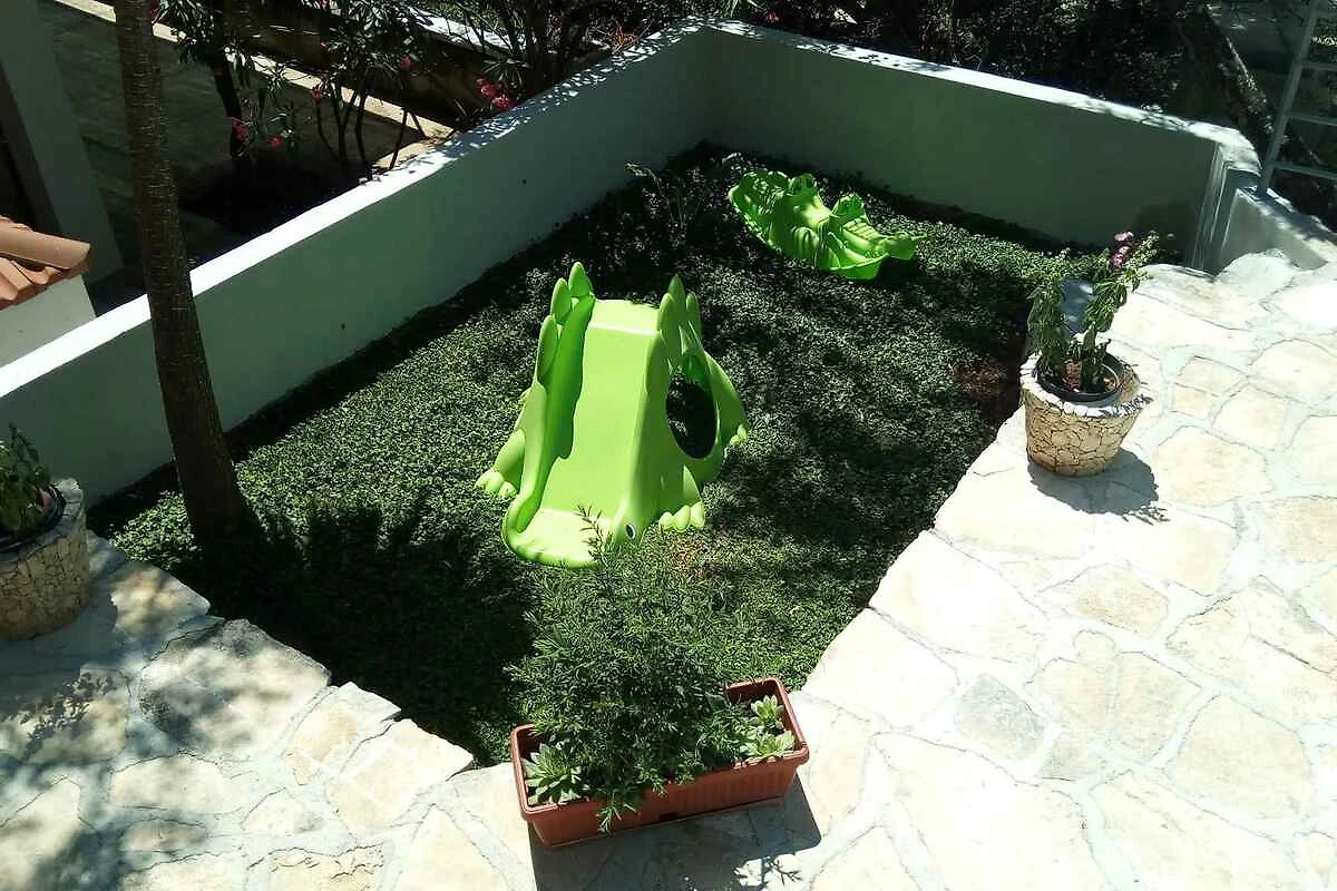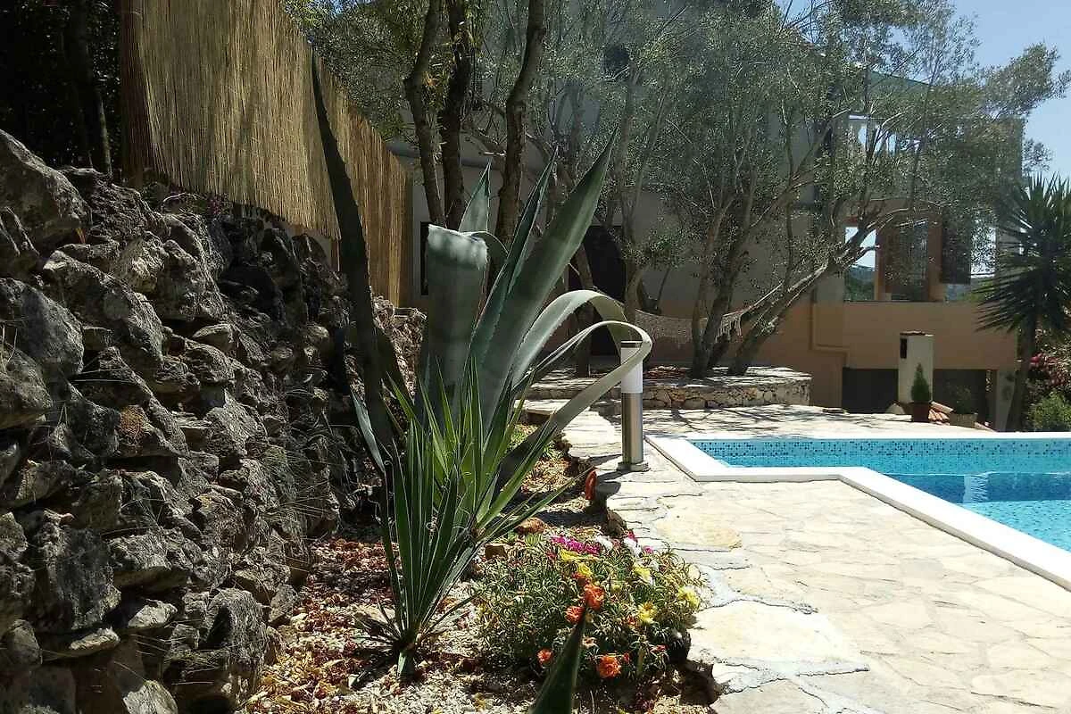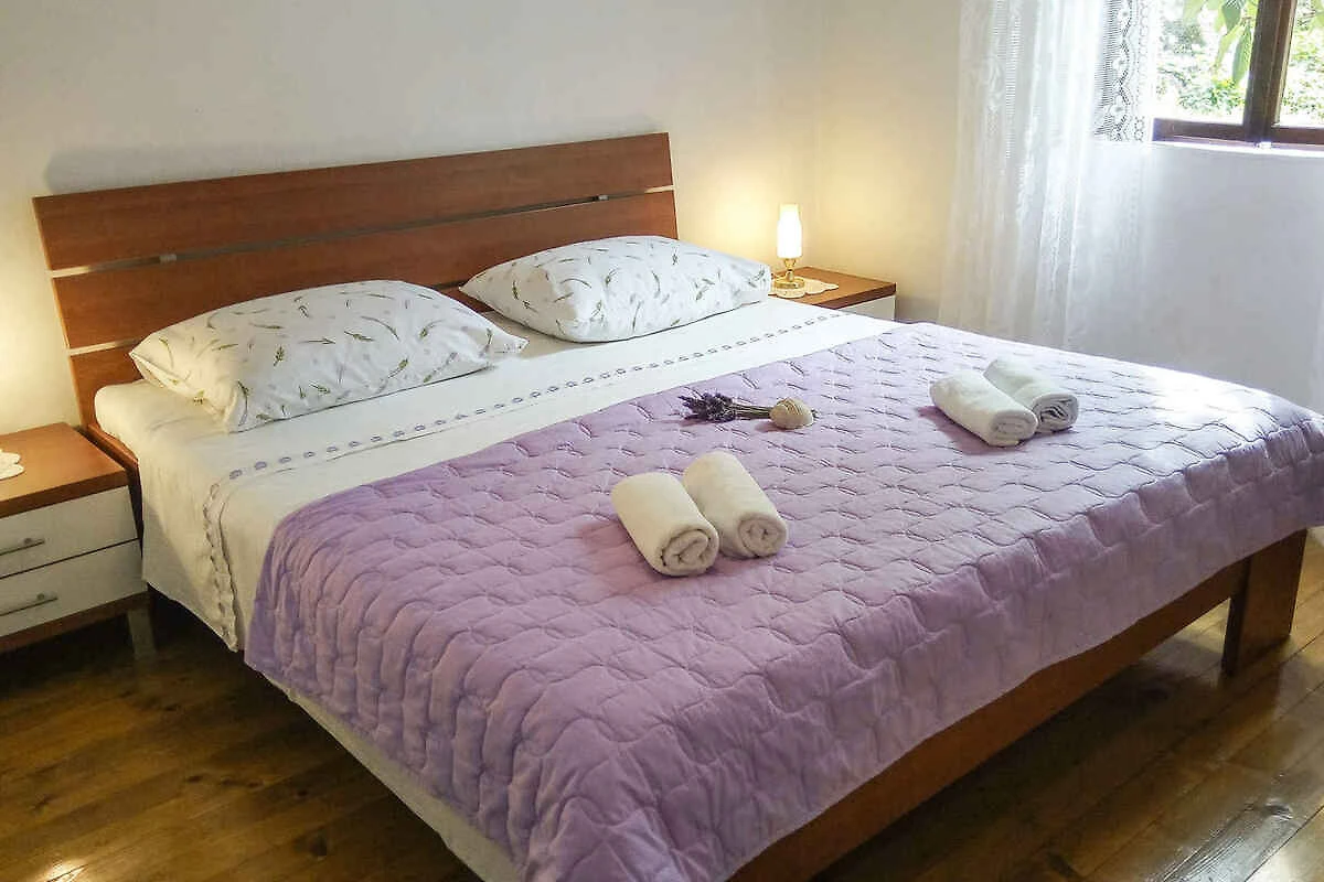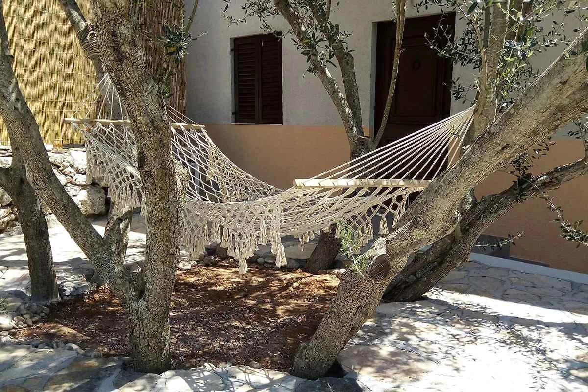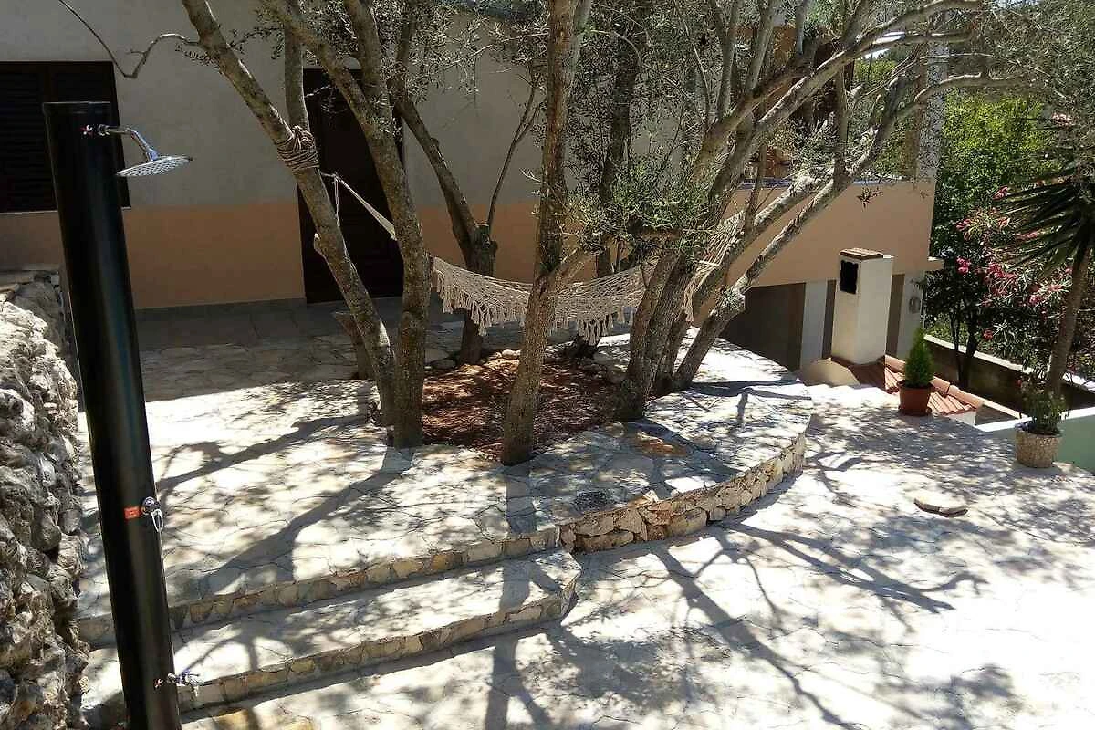 Vela Luka. Die Ferienwohnung befindet sich in einer Ferienanlage, auf einem geschlossenen Gartengrundstück mit Blumen und Bäumen, von einem Zaun begrenzt. Die Zufahrt erfolgt über eine Nebenstrasse (asphaltiert). Parkplatz auf der Strasse vor dem Haus.