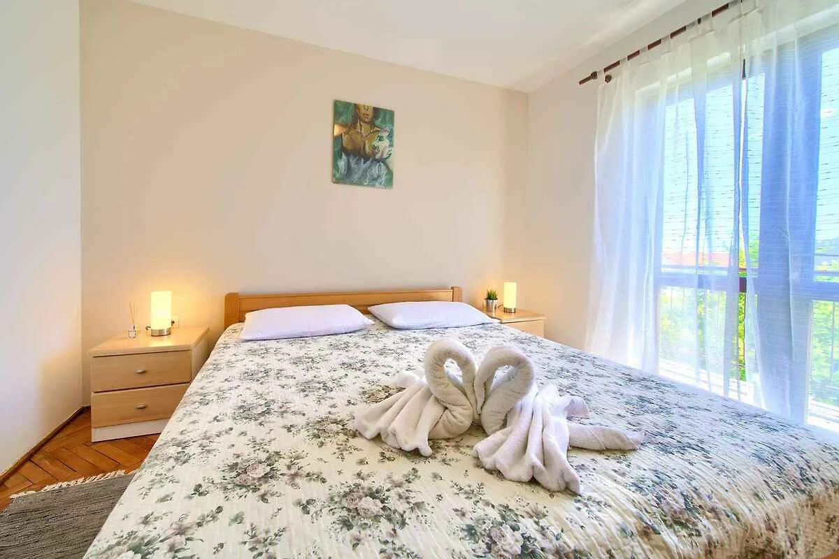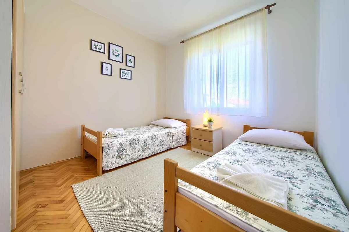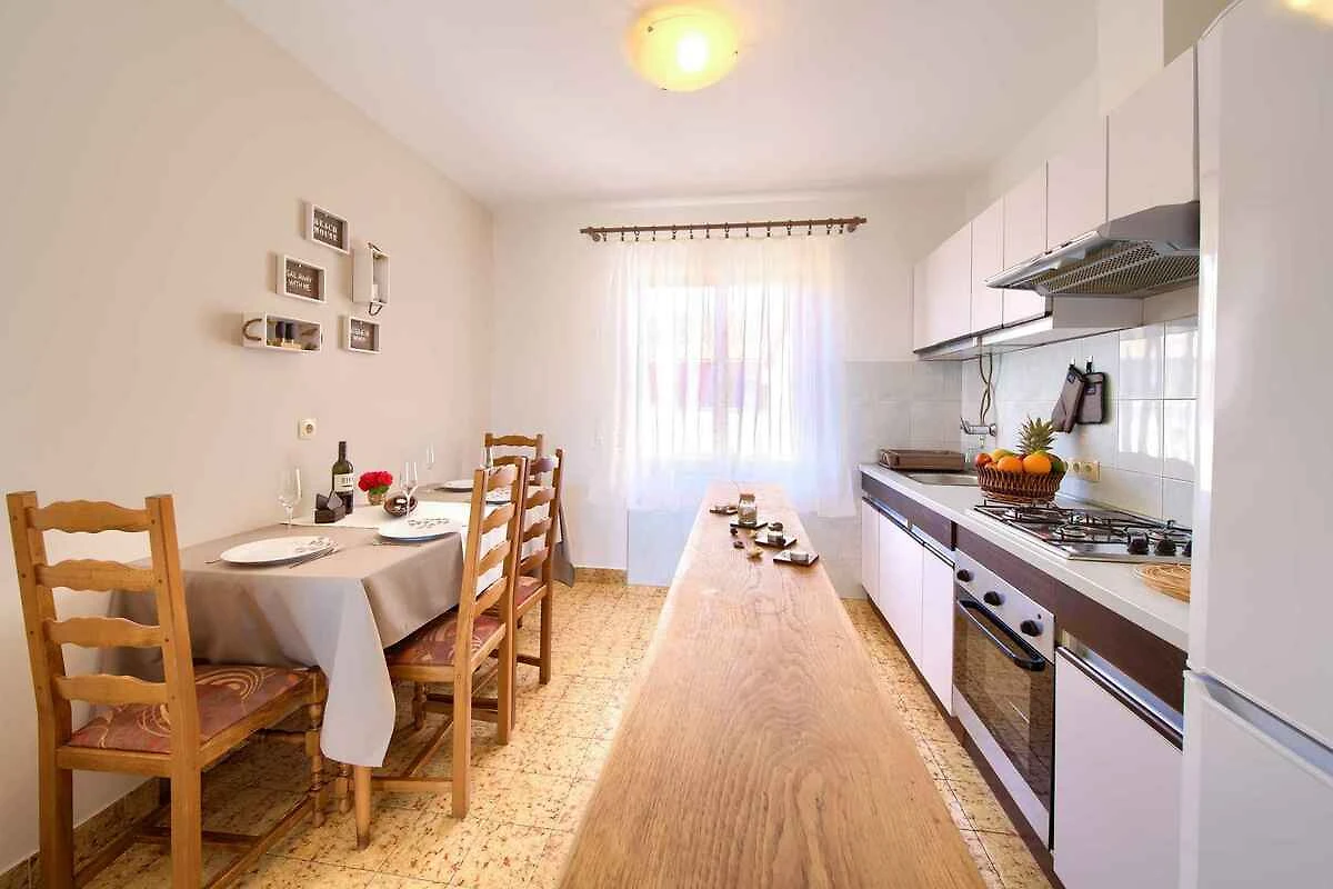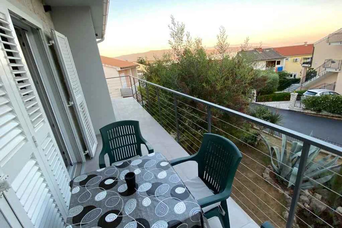Krk. Die Ferienwohnung befindet sich auf einem geschlossenen Grundstück mit Blumen. Der Vermieter wohnt ständig im Haus, nutzt jedoch einen separaten Eingang. Die Zufahrt erfolgt direkt von der Hauptstrasse (asphaltiert). Parkplatz (für 1 Pkw) auf dem Grundstück.