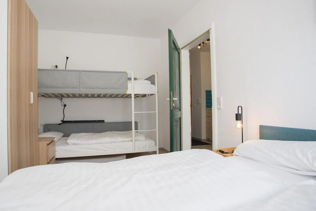 Im Schlafzimmer steht ein Doppelbett (140x200 cm) und ein Etagenbett mit zwei Matratzen (90x200 cm). Sie schlafen in dieser Unterkunft also zu viert in einem Zimmer. Außerdem gibt es Nachttische, Bettbeleuchtung und einen Kleiderschrank zur Aufbewahrung von Gepäck. Unter dem Bett finden Sie zwei Schubladen mit zusätzlichem Stauraum.