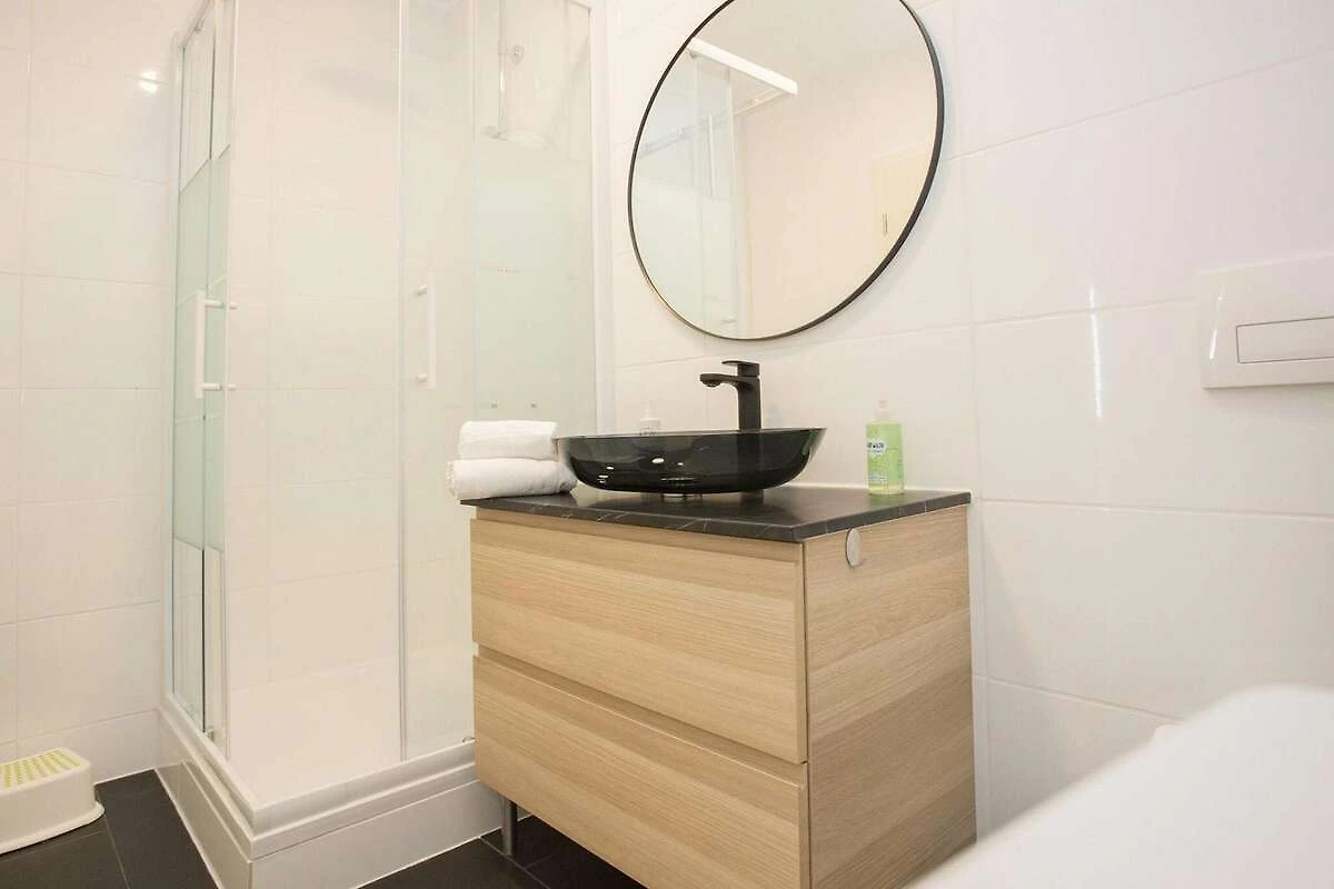Das Badezimmer ist mit einem Waschbecken mit Unterschrank und Spiegel, einer Duschkabine, einer Toilette und einer Waschmaschine/Trockner-Kombination ausgestattet, sodass Sie auch im Urlaub eine Wäsche waschen können.