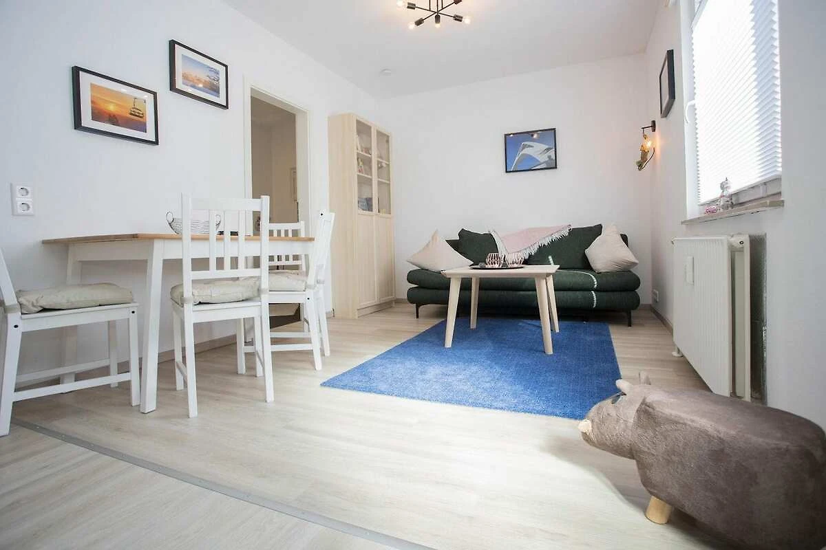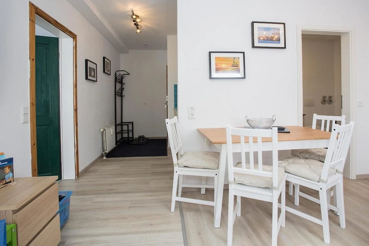 In dieser ebenerdigen Wohnung finden Sie ein Wohnzimmer, eine Küche, ein Badezimmer und ein Schlafzimmer. Das Wohnzimmer ist gemütlich eingerichtet mit einem Sofa für 2-3 Personen, einem Couchtisch und einem Fernseher. An der Wand steht ein Esstisch mit 4 Sitzplätzen. Für die Kleinsten gibt es eine gemütliche Spielecke mit etwas Spielzeug.