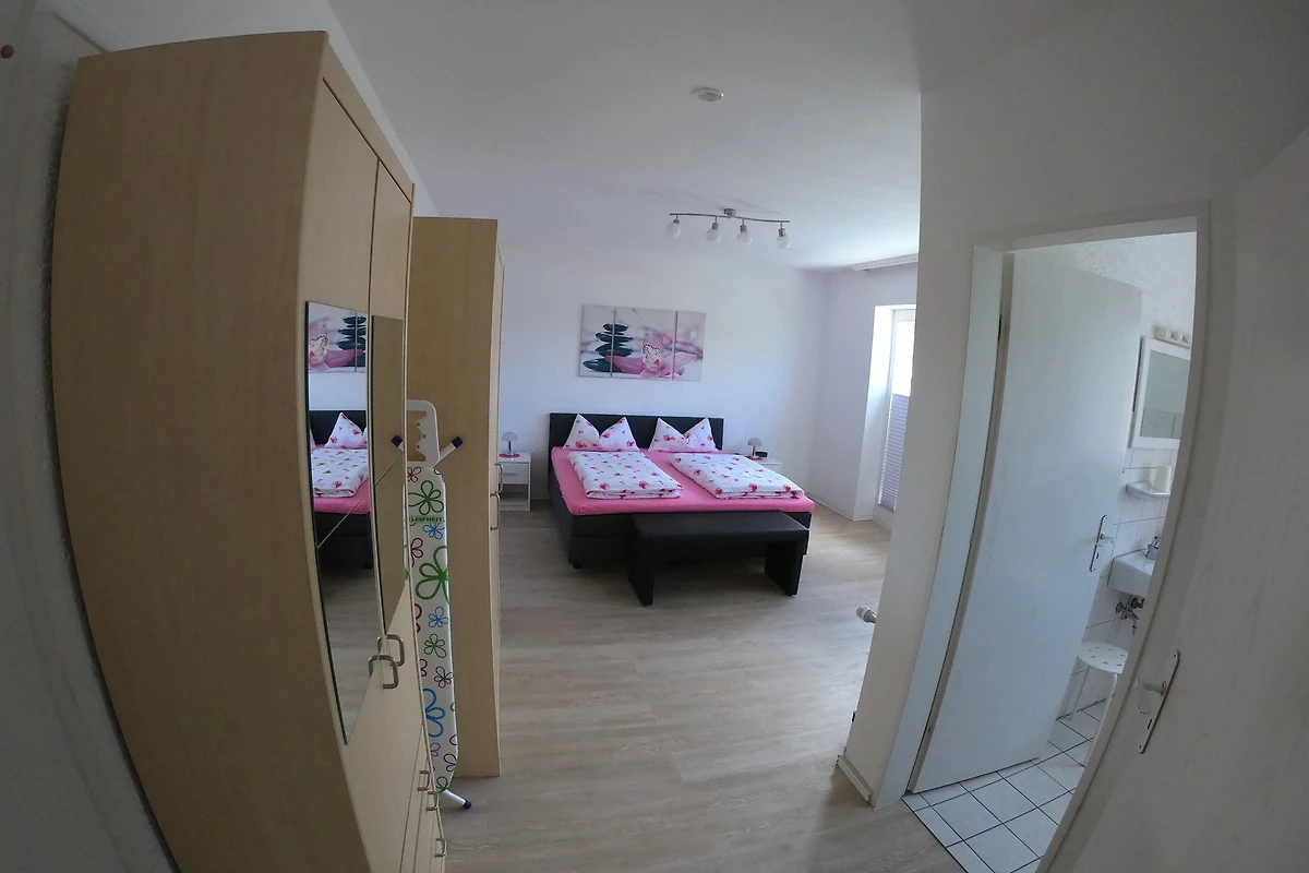 1. Etage. Es bietet Platz für bis zu 3 Personen. Die Wohnfläche der ca. 45 m² grossen Unterkunft verteilt sich auf ein Wohnzimmer, die Küche, 1 separates Schlafzimmer sowie dem Badezimmer. Das Wohnzimmer ist mit einer grossen gemütlichen Sitzecke, Musikanlage sowie einem TV ausgestattet, des weiteren befindet sich hier der Essplatz. Den Balkon können Sie vom Wohnbereich und vom Schlafzimmer betreten. Die Küche ist u.a. mit 2-Plattenherd, Eierkocher, Mikrowelle, Kaffeemaschine und vielen weiteren Küchengeräten ausgestattet. Das Schlafzimmer ist mit einem Doppelbett (180 x 200 cm - durchgehende Matratze) sowie einem Kleiderschrank versehen. Das Tageslicht-Badezimmer ist mit Waschbecken, Dusche & WC ausgestattet - (Fön vorhanden).