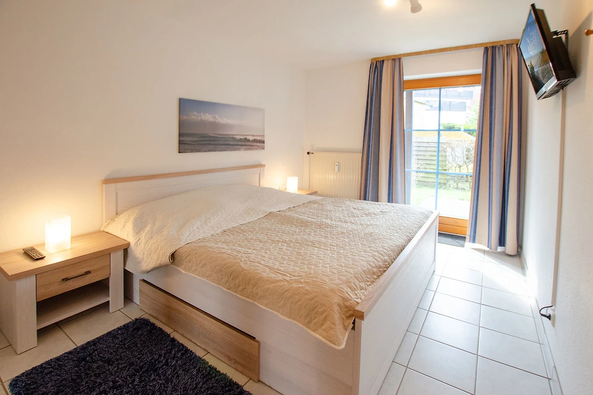 Zudem verfügt die Ferienwohnung über ein separates Schlafzimmer mit Doppelbett, Kleiderschrank und Terrassenzugang sowie über ein Bad mit Dusche/WC.