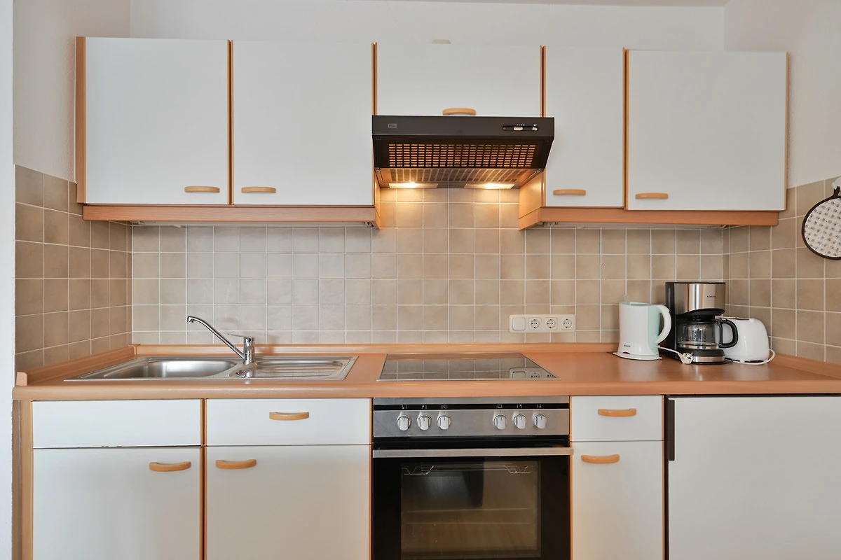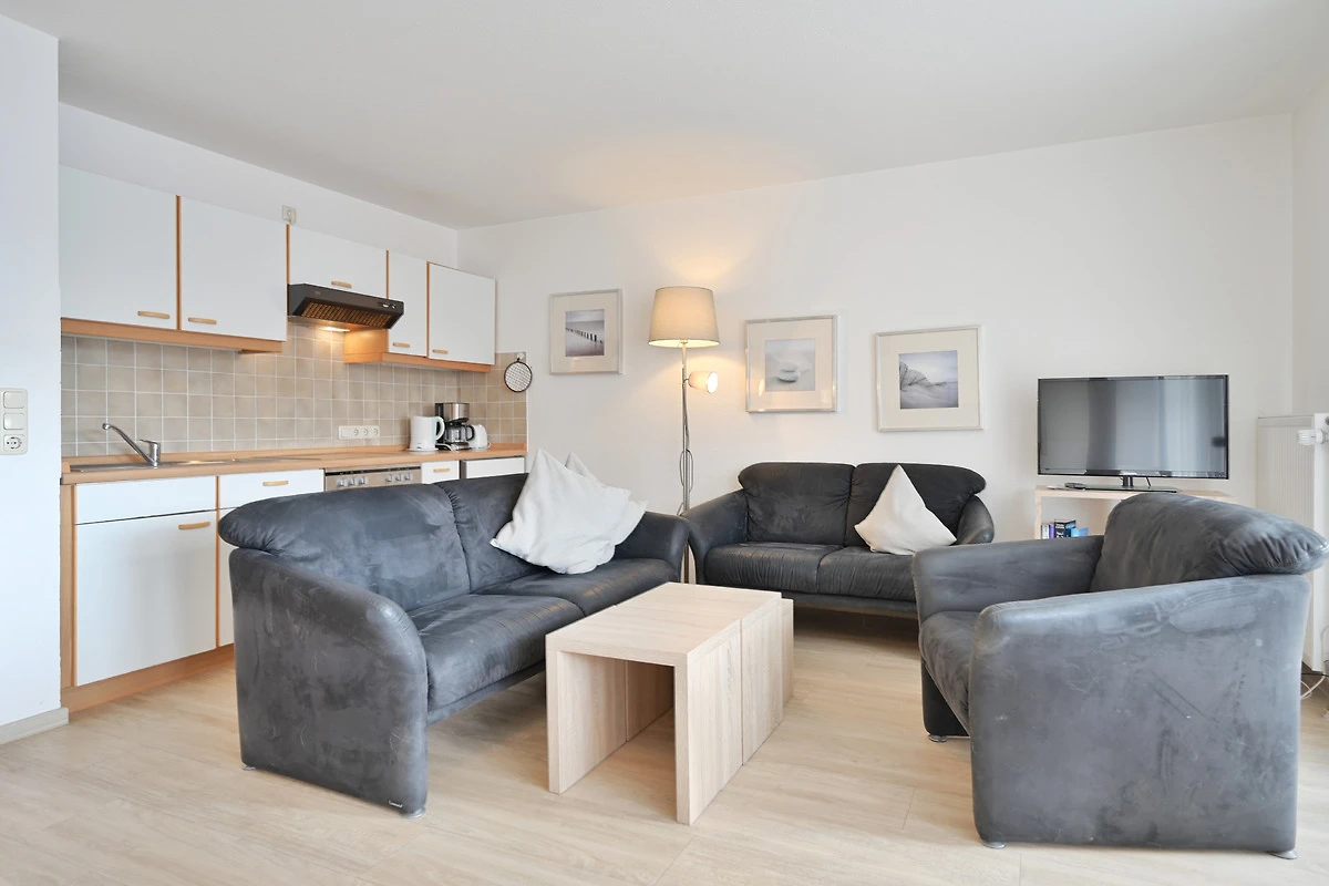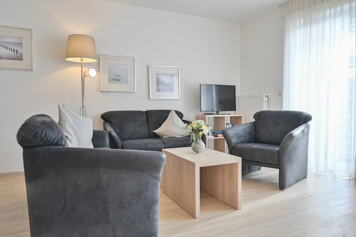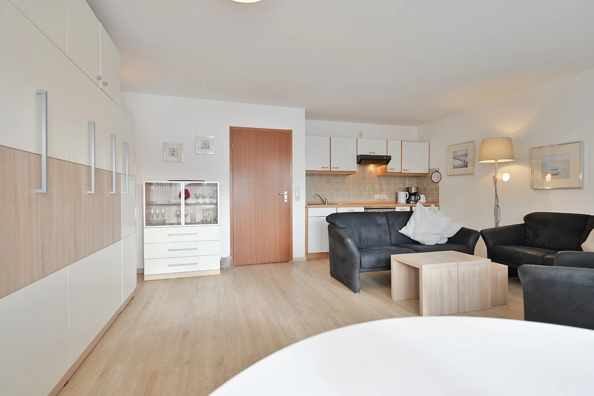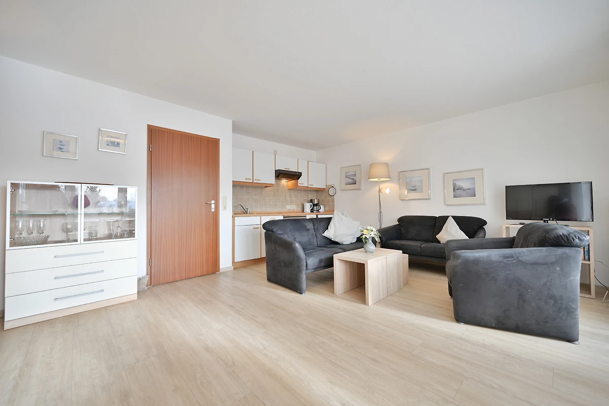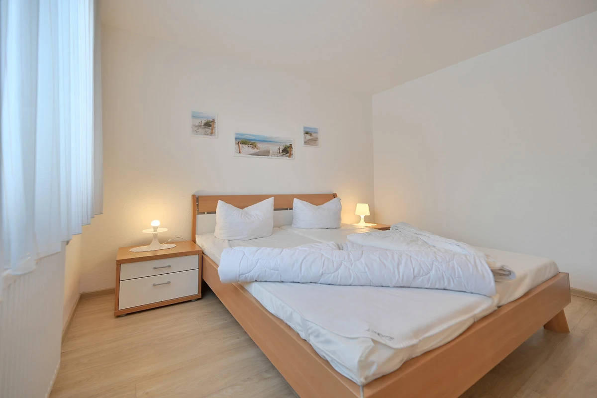 Die Ferienwohnung von Familie Grytz im Ostseebad Dahme verfügt über einen Wohnschlafraum mit Couch, Couchtisch, Schrankwand mit Schrankbett, integrierter Küchenzeile, Esstisch mit 4 Stühlen im hellen Erker sowie Zugang zum Balkon. Zur Ferienwohnung gehören darüber hinaus ein Flur mit Garderobe und Spiegel sowie ein Bad mit Dusche und WC. Ausserdem verfügt die Wohnung über ein separates Schlafzimmer mit Doppelbett, Kleiderschrank und 2 Stühlen.