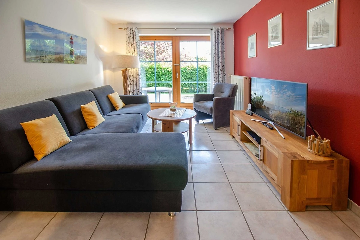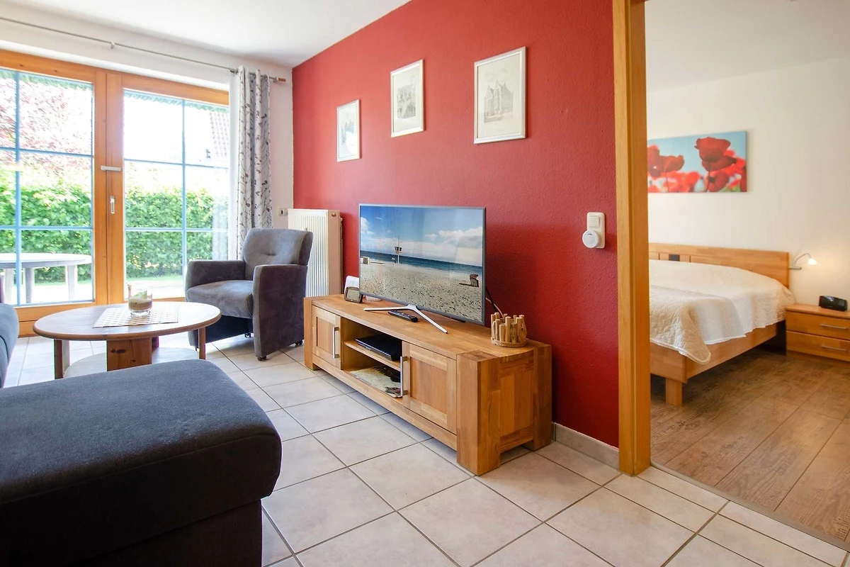 Die Ferienwohnung verfügt über zwei Zugänge zur Terrasse und einen direkten Gartenzugang.