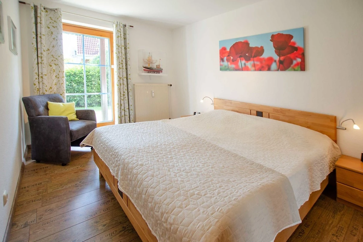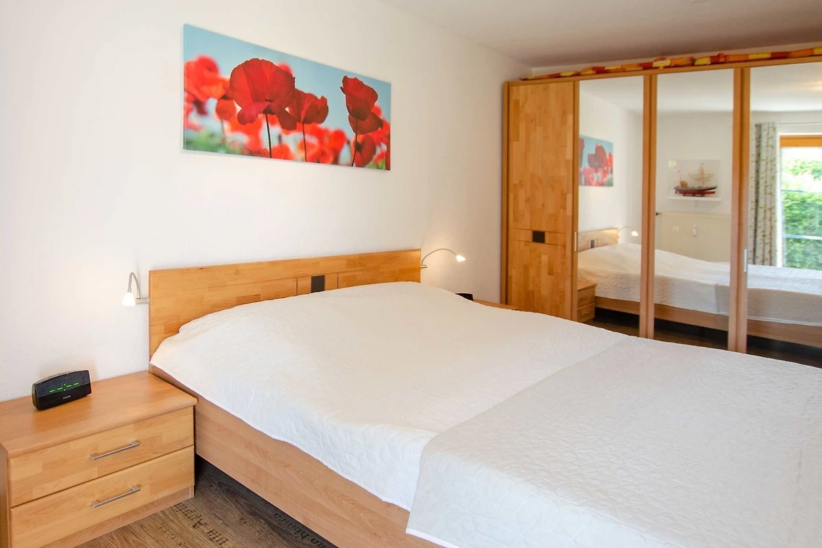Zudem gehören zur Ferienwohnung ein separates Schlafzimmer mit Doppelbett, Nachttischen, Kleiderschrank, Kofferablage und zweitem Terrassenzugang.