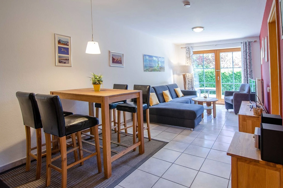 Die Fewo verfügt über ein Wohnschlafzimmer mit Schlafsofa (140 x200 cm), 1 Sessel, Couchtisch, Hocker, Bartisch mit 4 Barhockern, integrierte Küche, Garderobe und Zugang zur Terrasse.