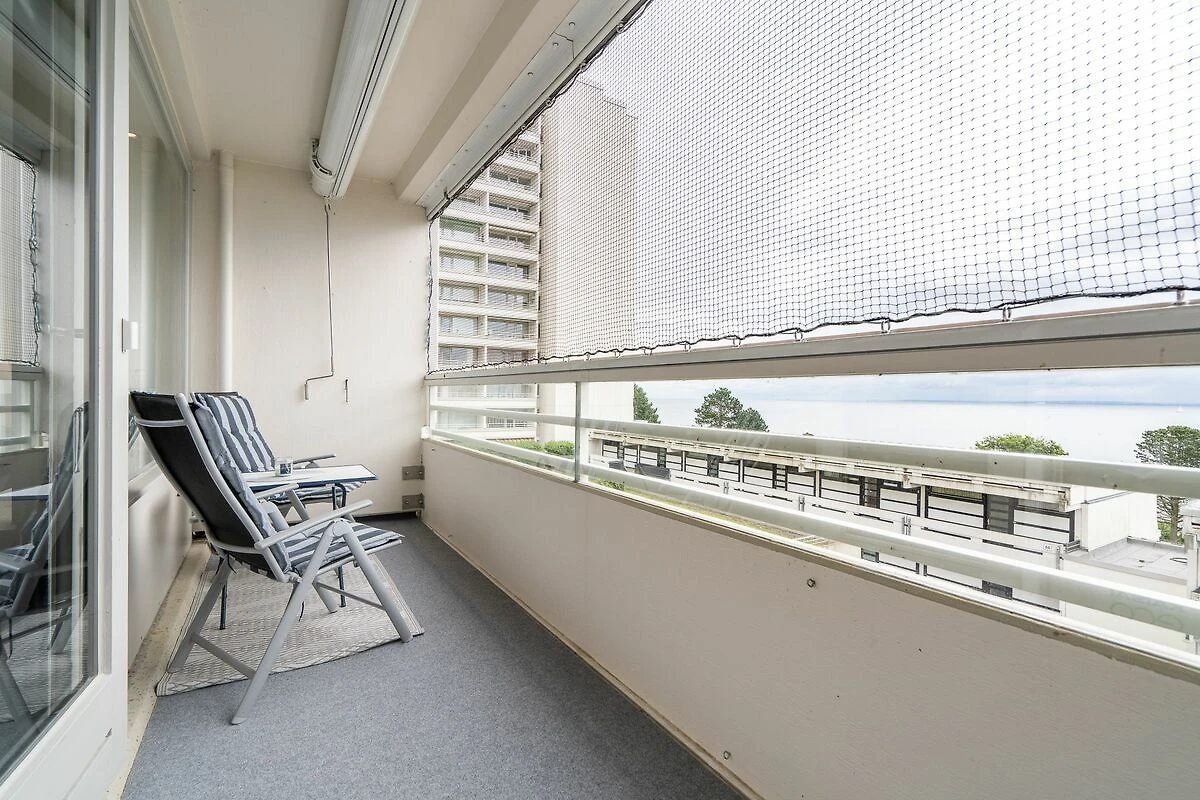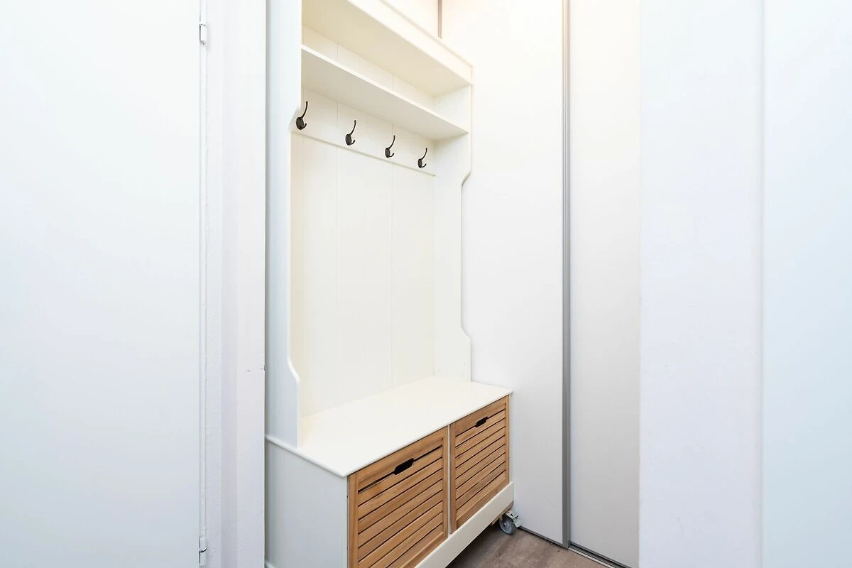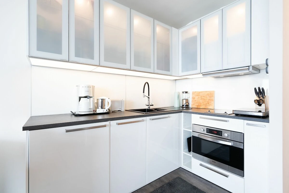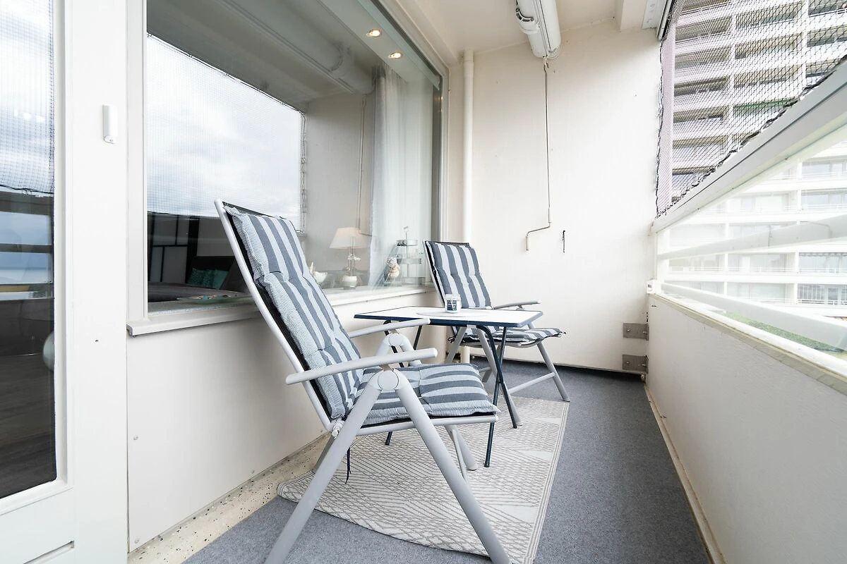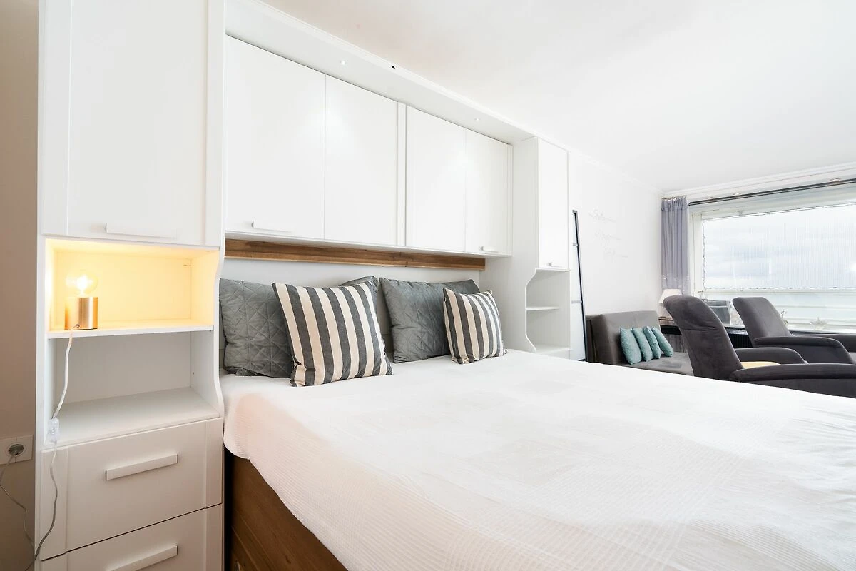 Diese schöne und helle Ferienwohnung ist ein wunderbares Feriendomizil für zwei Personen. Der Balkon bietet über andere Häuser hinweg Blick auf die Ostsee. Das bequeme Doppelbett (180 cm x 200 cm) ist in den Wohn- und Essbereich integriert und ist von beiden Seiten zugänglich. Mit einem Raumteiler kann das Bett optisch vom Wohnbereich getrennt werden. Die offene und moderne Küche ist mit einer Spülmaschine und einem Mikrowellen-Backofen-Kombigerät voll ausgestattet. Die dort zubereiteten Mahlzeiten können Sie ganz bequem am Esstisch einnehmen und den Abend im Anschluss auf den komfortablen Sesseln ausklingen lassen. Das Duschbad ist innenliegend. Ohne eine Straße überqueren zu müssen, sind es zum flach abfallenden Sandstrand nur wenige Fußschritte. PKW-Stellplatz inklusive.