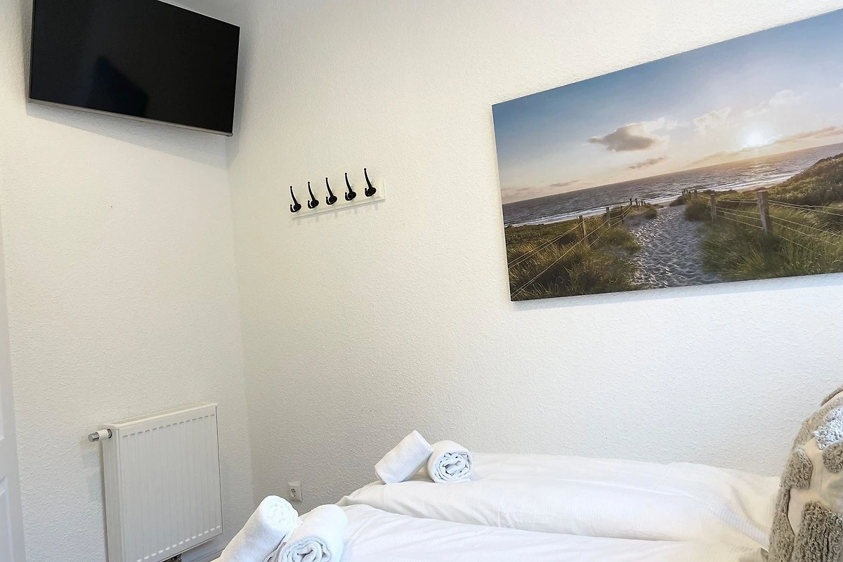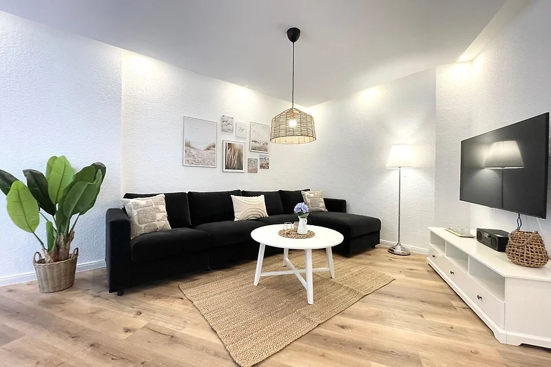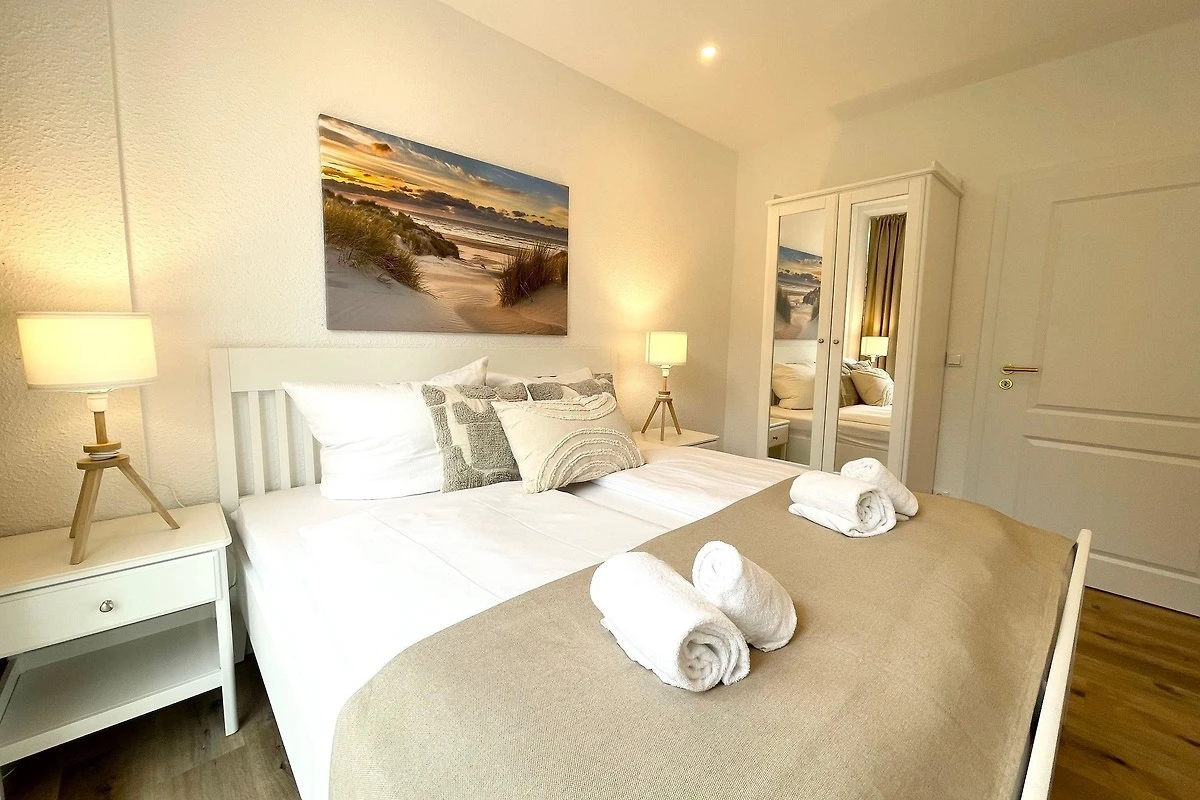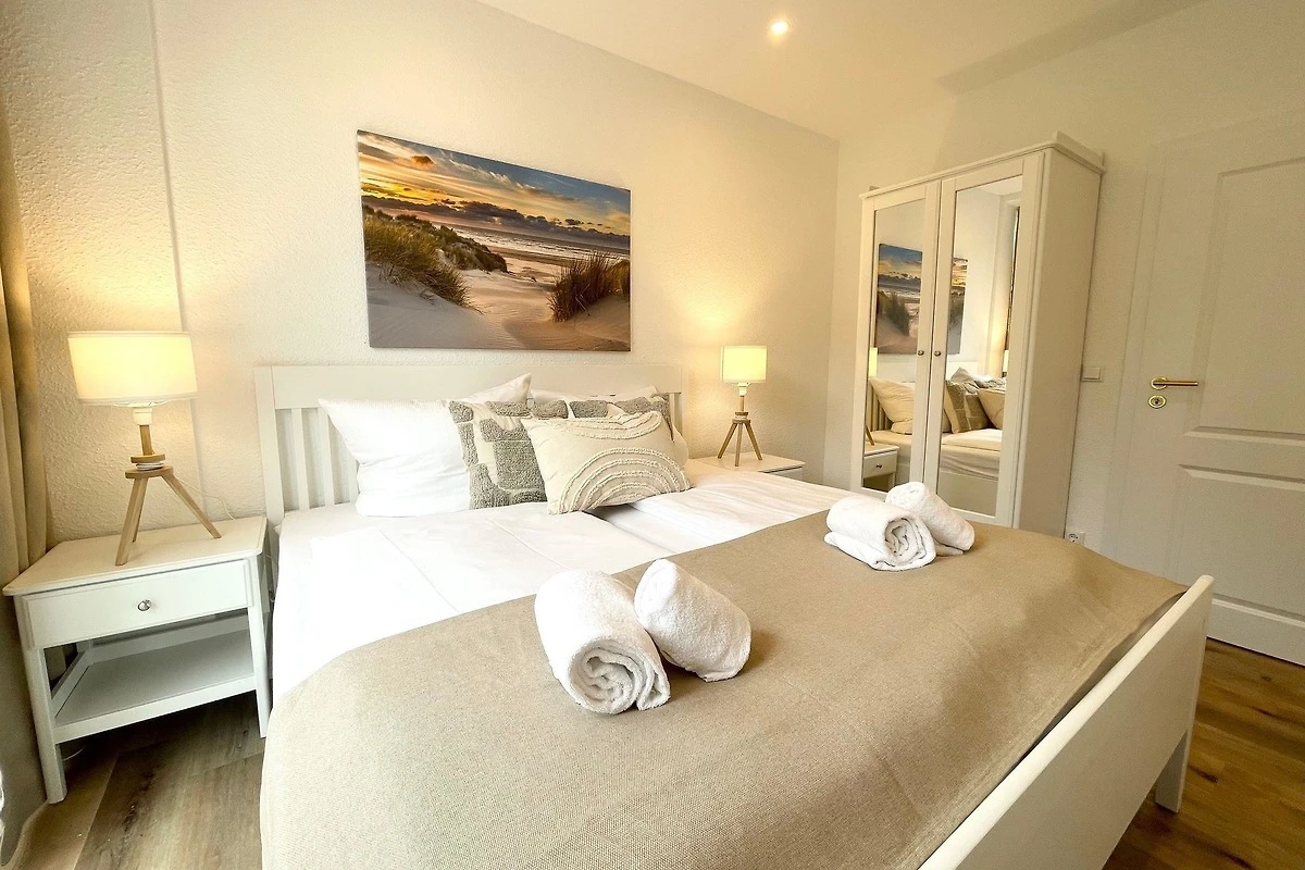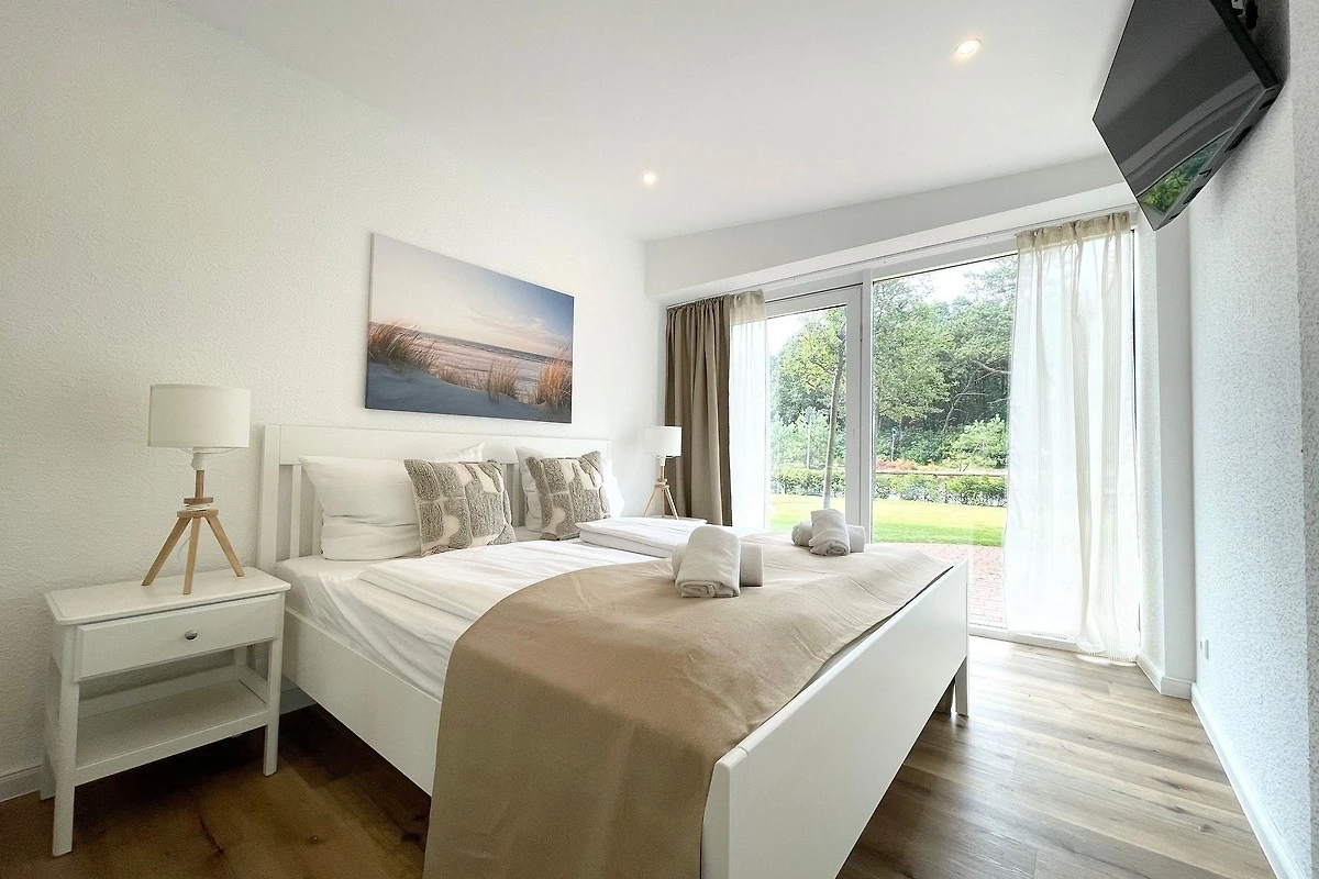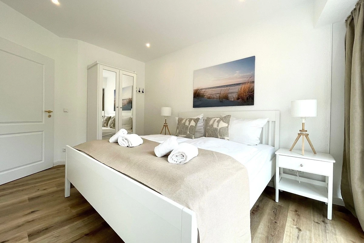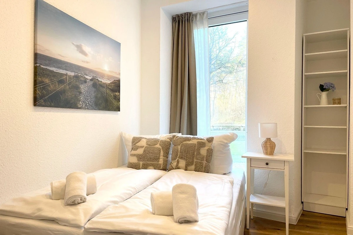Die grosszügige Ferienwohnung bietet Platz für bis zu 8 Personen und verfügt über 3 Schlafzimmer sowie ein komfortables Schlafsofa im Wohnzimmer. Zwei Schlafzimmer sind mit Doppelbetten (180 cm) ausgestattet, während das dritte Schlafzimmer ein Einzelbett (140 cm) bereithält. Die beiden Badezimmer, inklusive einer kleinen Wellness-Oase mit Whirlpool-Badewanne und Sauna, garantieren Entspannung pur. Die gut ausgestattete Küche bietet optimale Bedingungen für gemeinsame Kochabende. Im stilvoll eingerichteten Wohnzimmer mit grossem Sofa lässt es sich gemütlich verweilen. Die Wohnung im Erdgeschoss gewährleistet einen barrierearmen Zugang und schafft mit grossen Fenstern eine freundliche Atmosphäre. Gemeinschaftlich nutzbar sind Waschmaschinen, Trockner und ein Fahrradkeller im Haus. Ein kleiner Spielplatz für Kinder ist ebenfalls vorhanden. Ein Bäcker im Haus sorgt saisonal für frische Backwaren.