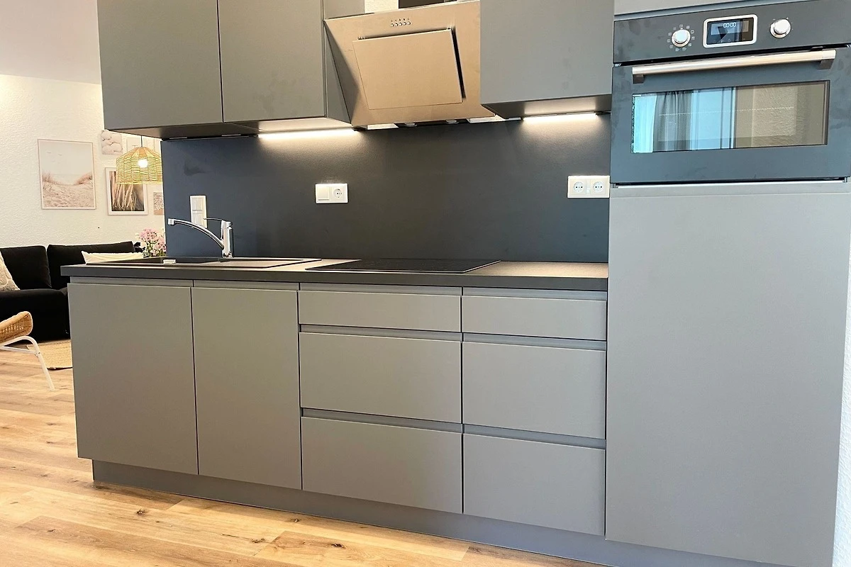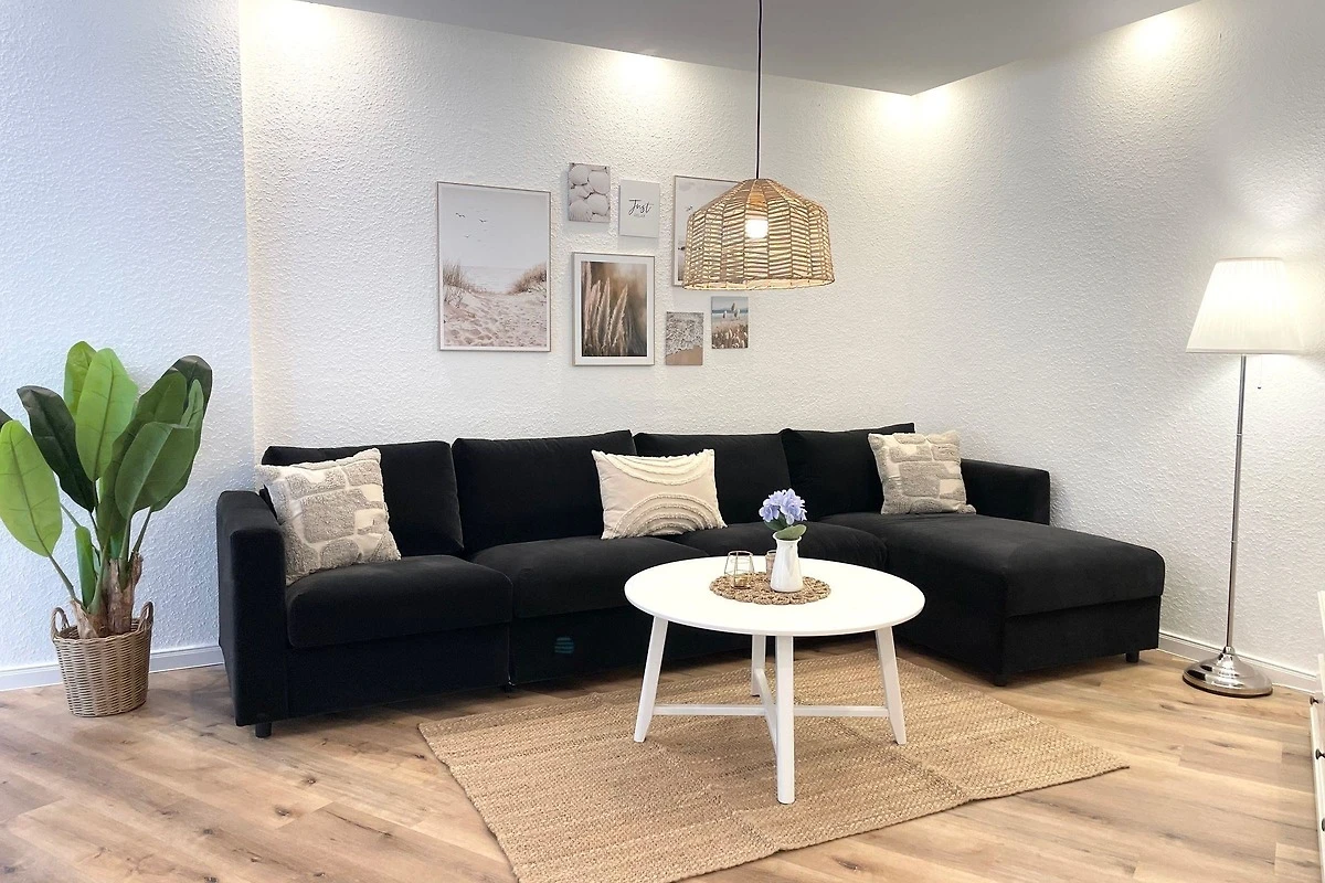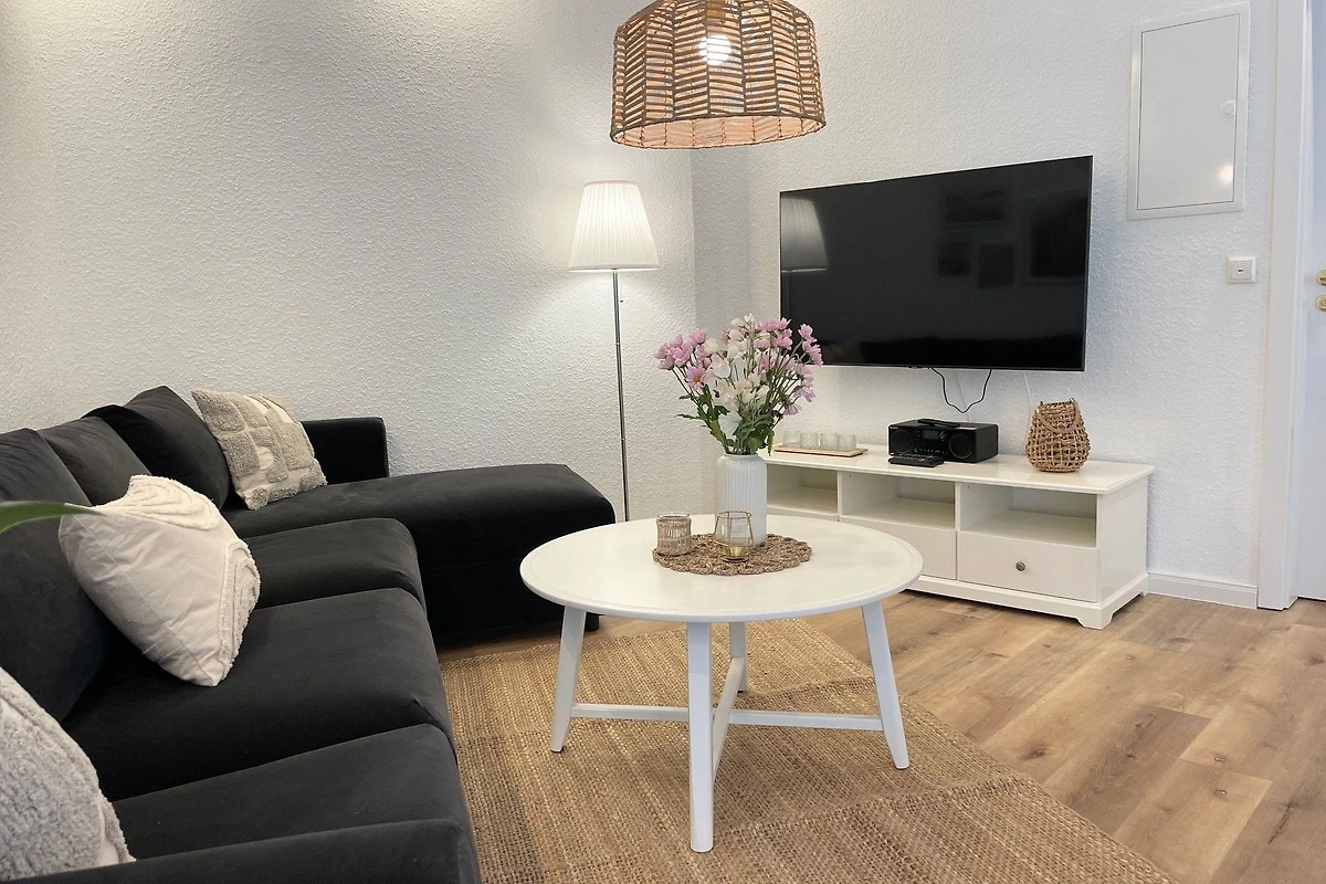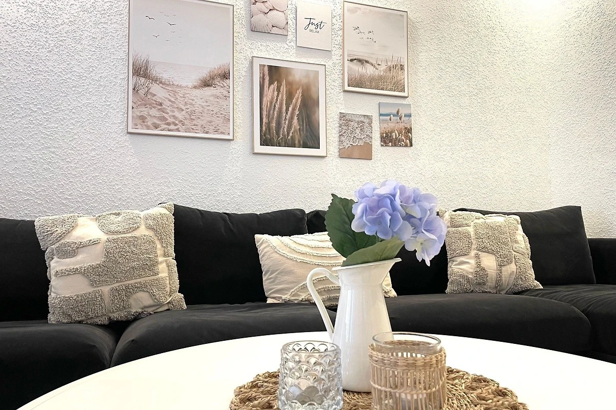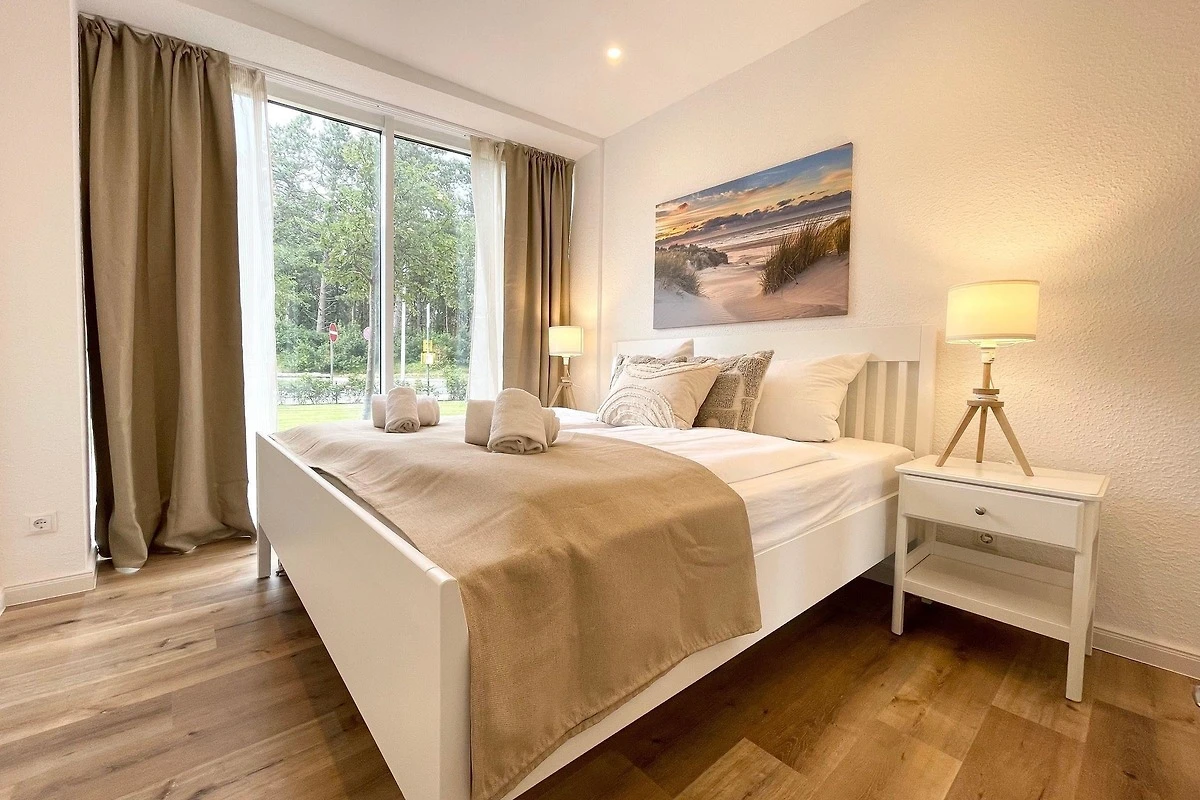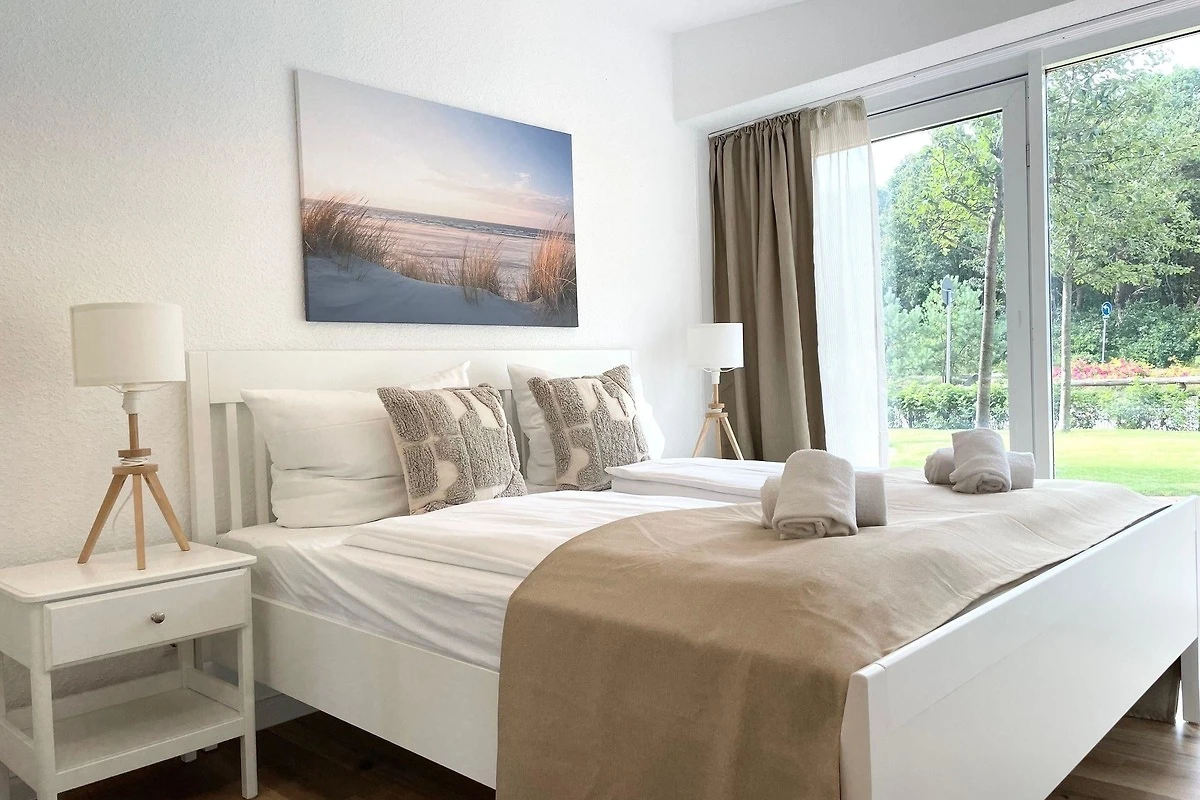 Die grosszügige Ferienwohnung bietet Platz für bis zu 8 Personen und verfügt über 3 Schlafzimmer sowie ein komfortables Schlafsofa im Wohnzimmer. Zwei Schlafzimmer sind mit Doppelbetten (180 cm) ausgestattet, während das dritte Schlafzimmer ein Einzelbett (140 cm) bereithält. Die beiden Badezimmer, inklusive einer kleinen Wellness-Oase mit Whirlpool-Badewanne und Sauna, garantieren Entspannung pur. Die gut ausgestattete Küche bietet optimale Bedingungen für gemeinsame Kochabende. Im stilvoll eingerichteten Wohnzimmer mit grossem Sofa lässt es sich gemütlich verweilen. Die Wohnung im Erdgeschoss gewährleistet einen barrierearmen Zugang und schafft mit grossen Fenstern eine freundliche Atmosphäre. Gemeinschaftlich nutzbar sind Waschmaschinen, Trockner und ein Fahrradkeller im Haus. Ein kleiner Spielplatz für Kinder ist ebenfalls vorhanden. Ein Bäcker im Haus sorgt saisonal für frische Backwaren.