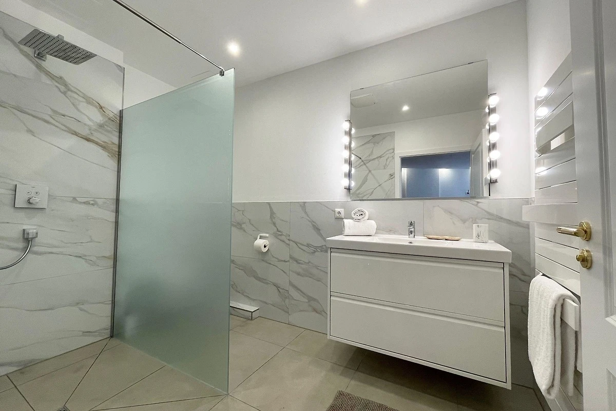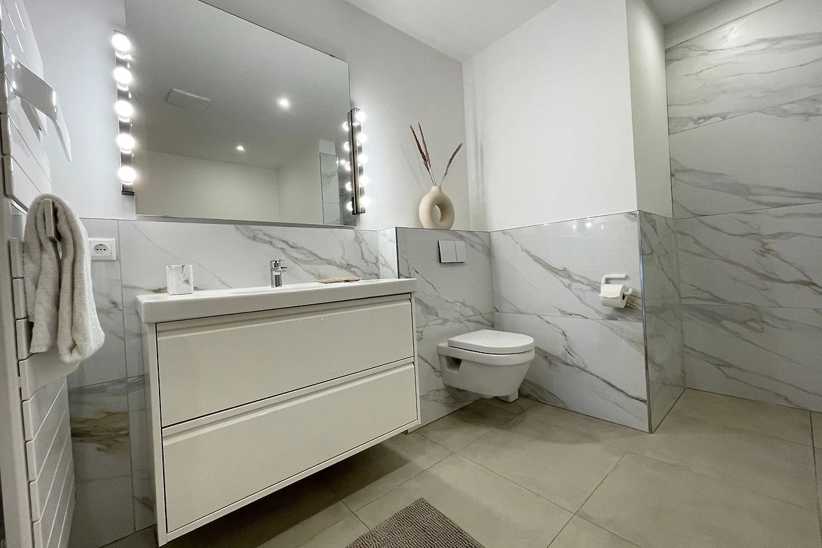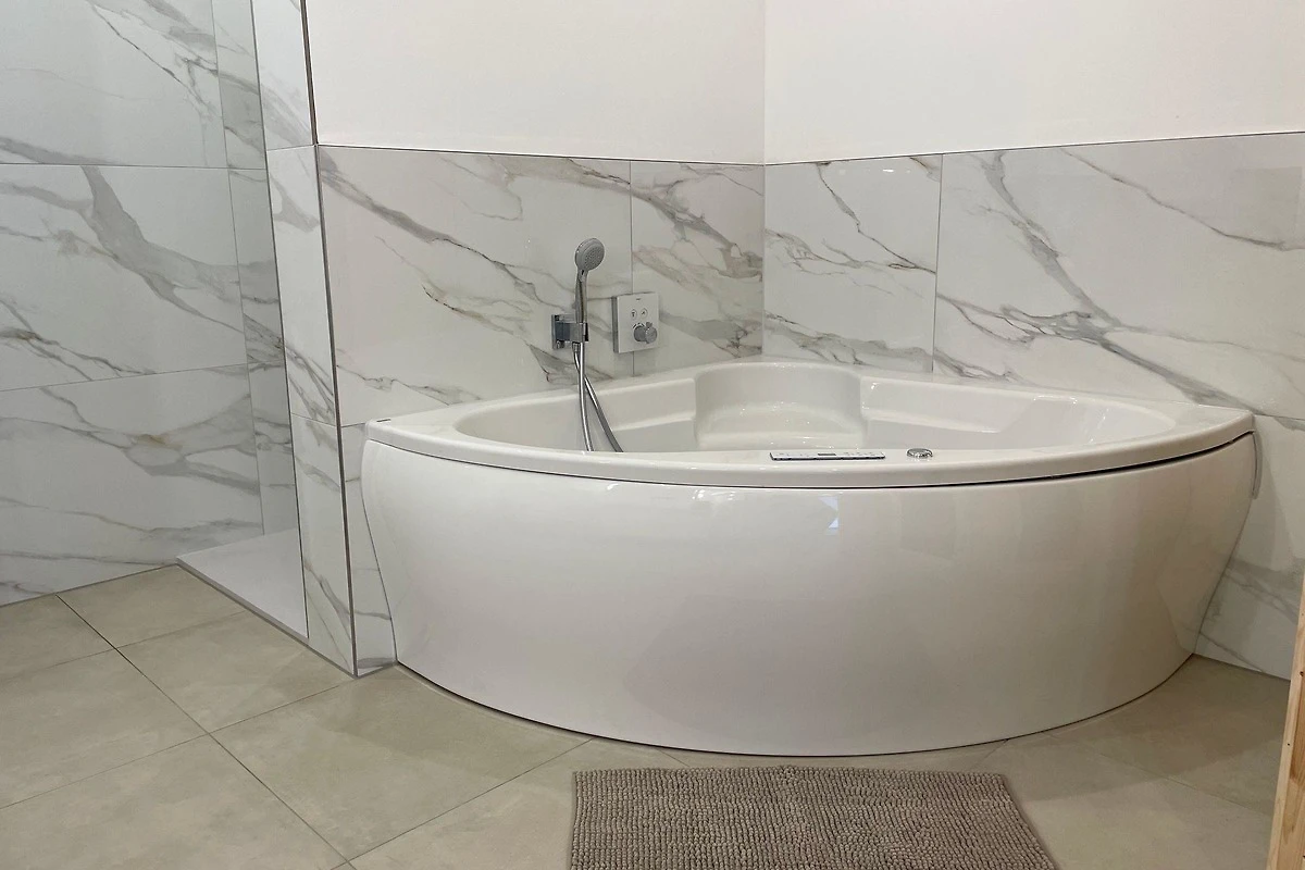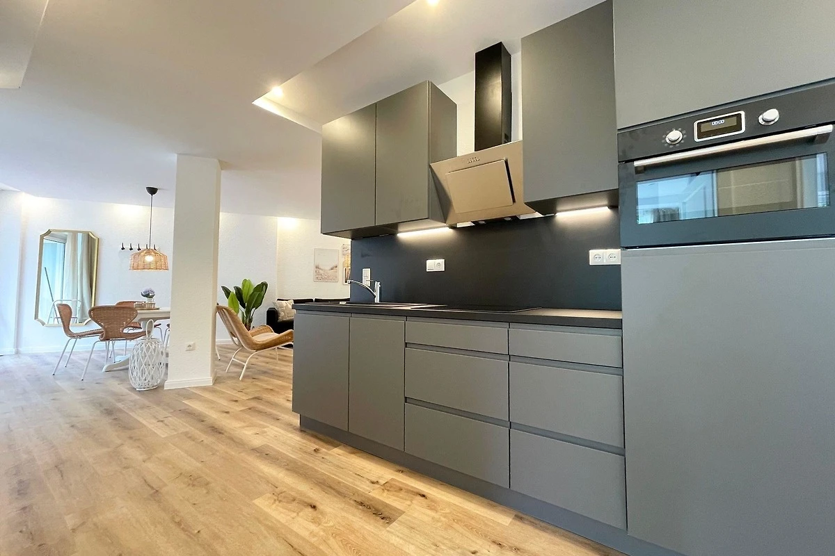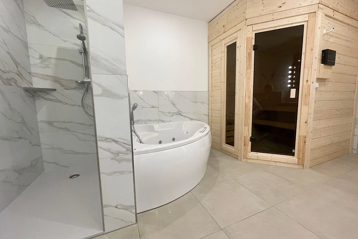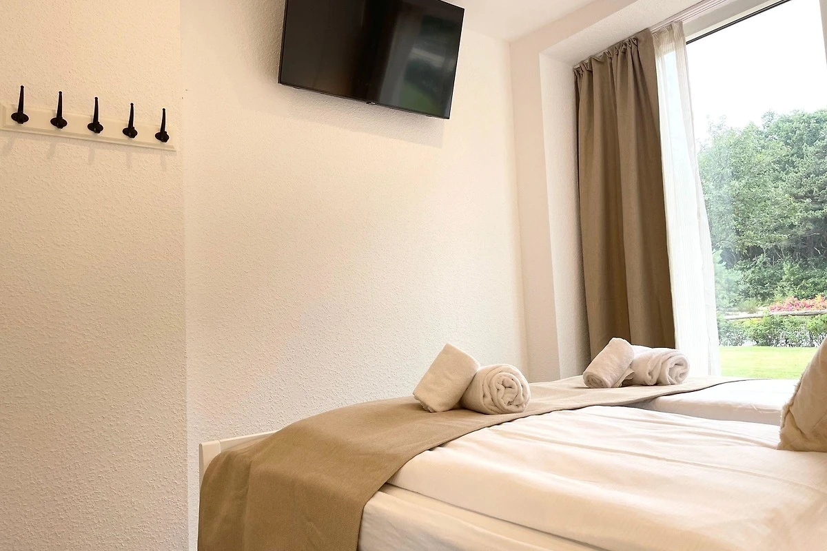 Die grosszügige Ferienwohnung bietet Platz für bis zu 8 Personen und verfügt über 3 Schlafzimmer sowie ein komfortables Schlafsofa im Wohnzimmer. Zwei Schlafzimmer sind mit Doppelbetten (180 cm) ausgestattet, während das dritte Schlafzimmer ein Einzelbett (140 cm) bereithält. Die beiden Badezimmer, inklusive einer kleinen Wellness-Oase mit Whirlpool-Badewanne und Sauna, garantieren Entspannung pur. Die gut ausgestattete Küche bietet optimale Bedingungen für gemeinsame Kochabende. Im stilvoll eingerichteten Wohnzimmer mit grossem Sofa lässt es sich gemütlich verweilen. Die Wohnung im Erdgeschoss gewährleistet einen barrierearmen Zugang und schafft mit grossen Fenstern eine freundliche Atmosphäre. Gemeinschaftlich nutzbar sind Waschmaschinen, Trockner und ein Fahrradkeller im Haus. Ein kleiner Spielplatz für Kinder ist ebenfalls vorhanden. Ein Bäcker im Haus sorgt saisonal für frische Backwaren.
