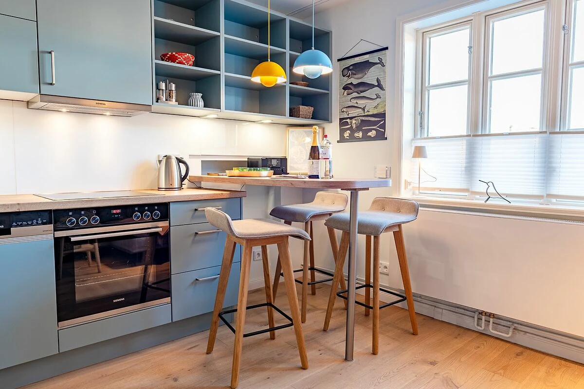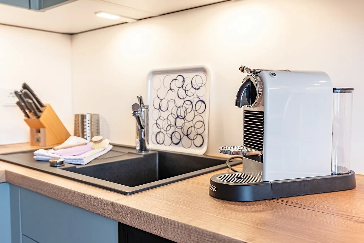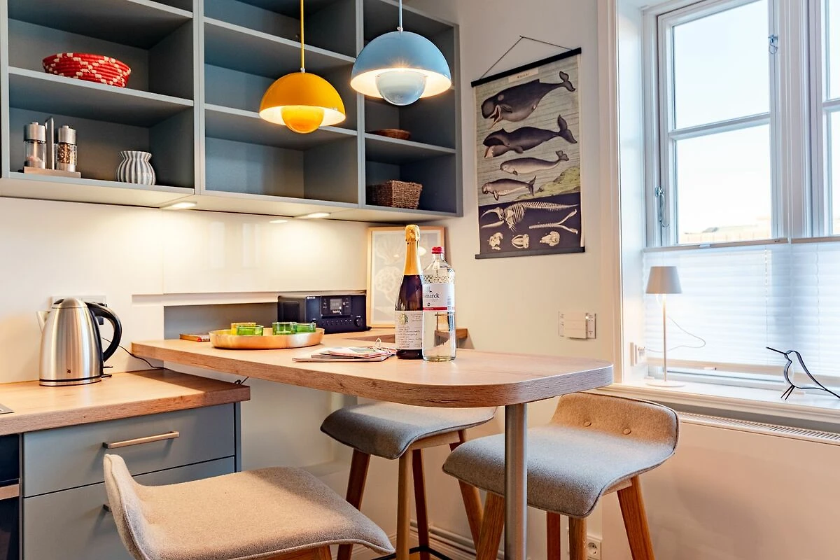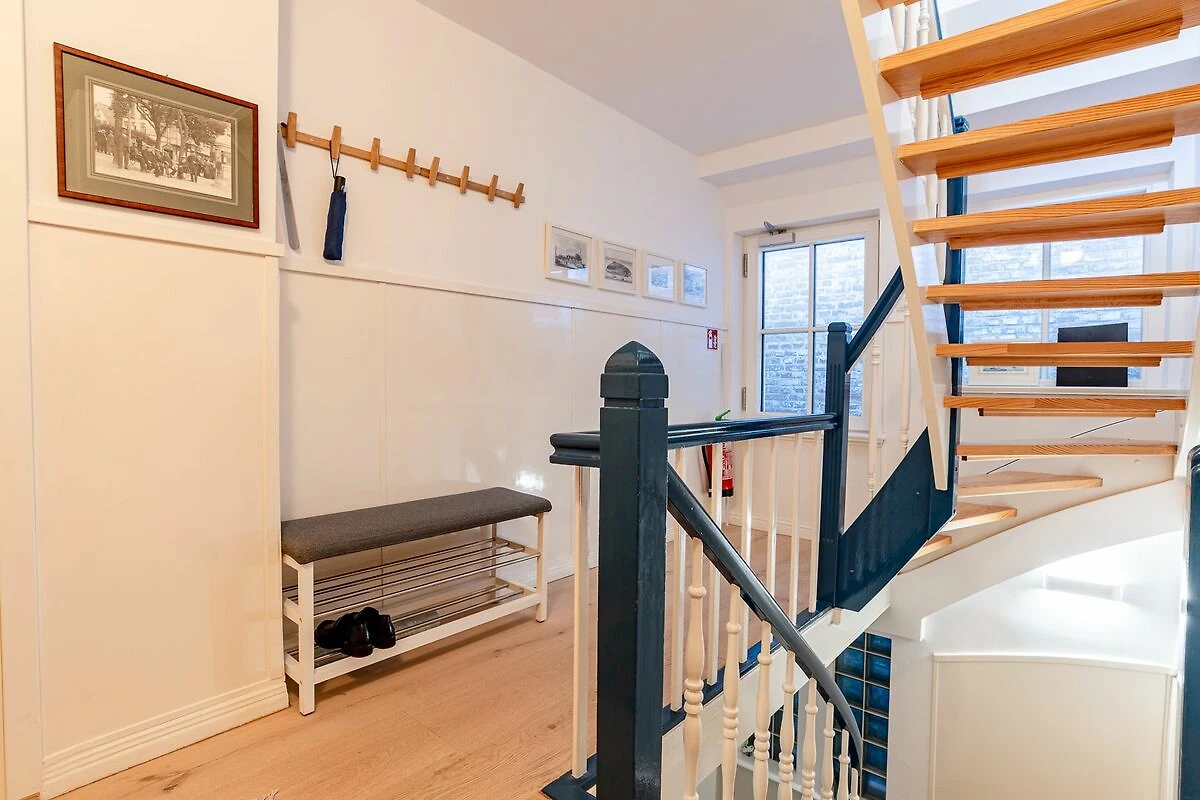 Die Ferienwohnung ist komplett im Obergeschoss gelegen und verfügt über einen Wohn- und Essbereich mit offener Küche, ein Schlafzimmer mit einem Doppelbett und einem Alkoven, sowie ein Bad mit Raindance-Dusche. Ältere Kinder können es sich im „Versteck“ gemütlich machen, einem kleinen Raum mit Schlafsessel, der der Wohnung seinen Namen gibt. Zu den Gemeinschaftsbereichen des Alten Kapitänshauses zählen eine eigene Sauna, ein Fitnessraum sowie ein Fahrradunterstand mit E-Bike-Ladestationen im Innenhof.