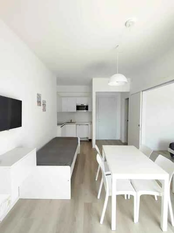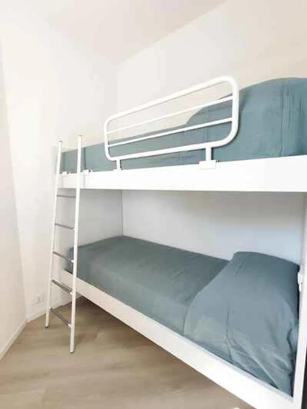 Wohn/Schlafzimmer mit 1 Zusatzbett auf Couch/Sofa, TV und Zugang zum Balkon. Schlafzimmer mit 1 Etagenbett. Schlafzimmer mit 1 Doppelbett. Kochnische mit Essecke, Gasherd, Kühlschrank und Küchenutensilien. Bad mit Dusche, WC und Bidet.