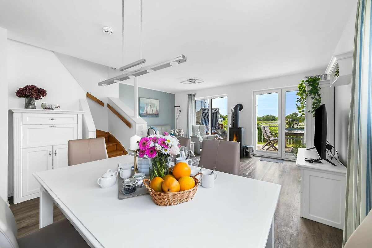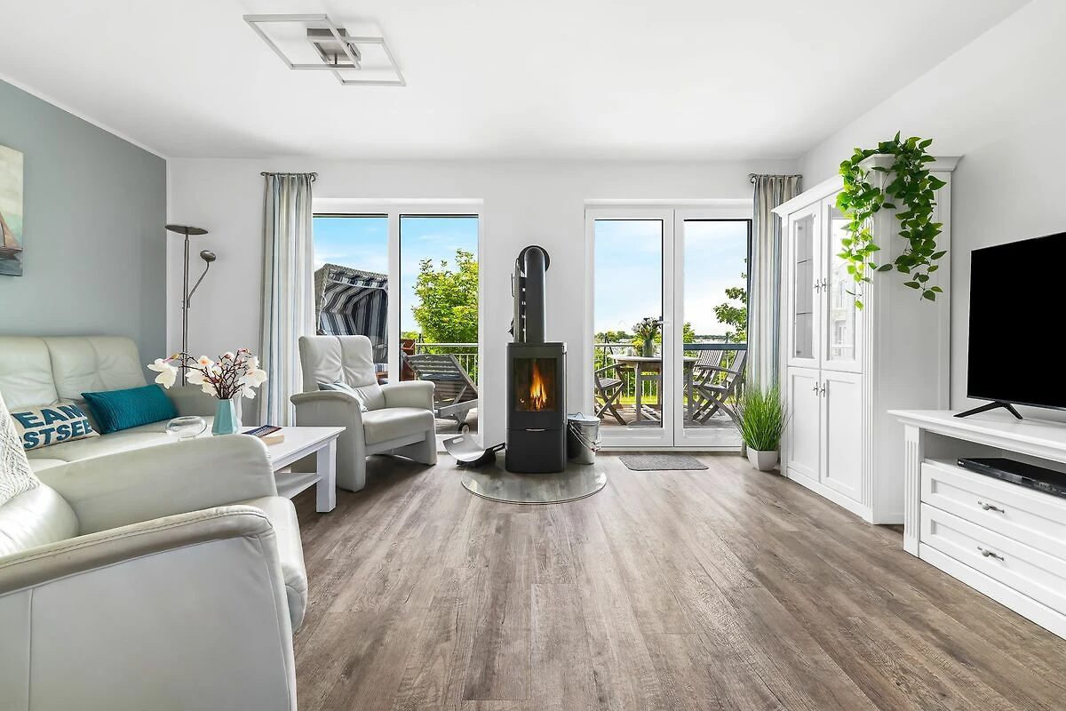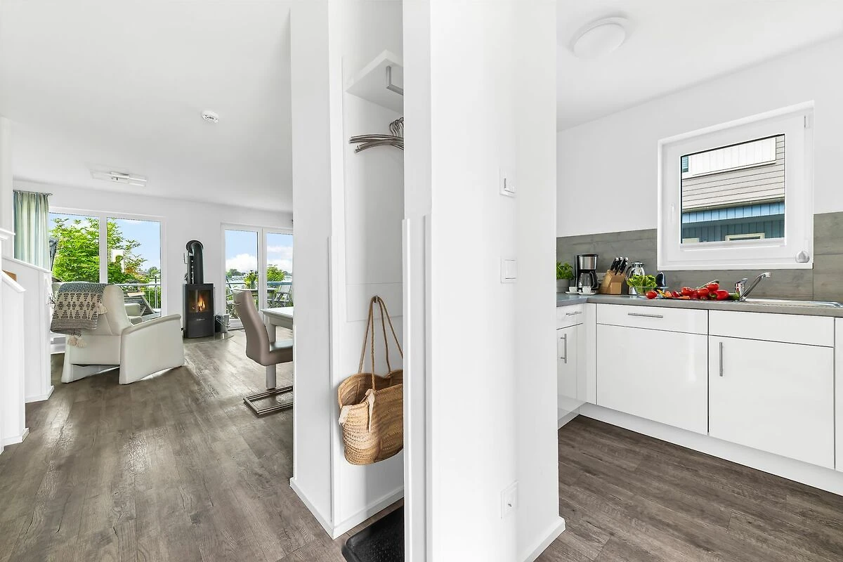 Nach Betreten befindest Du Dich im lichtdurchfluteten Wohn- und Essbereich, der modern und gemütlich eingerichtet ist. Dank der bodentiefen Panoramafenster hast Du einen atemberaubenden Ausblick über die Schlei.
