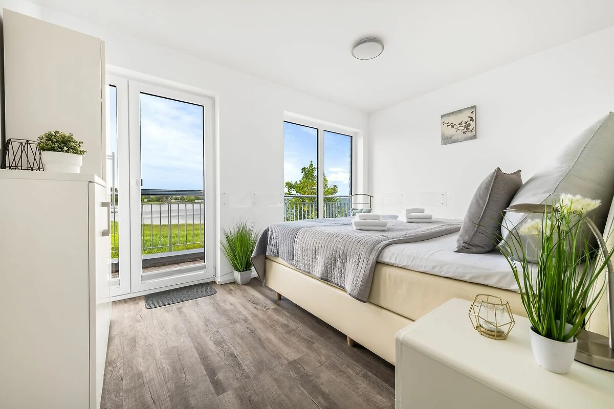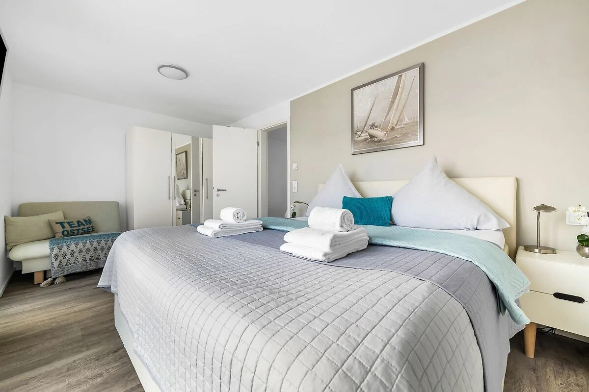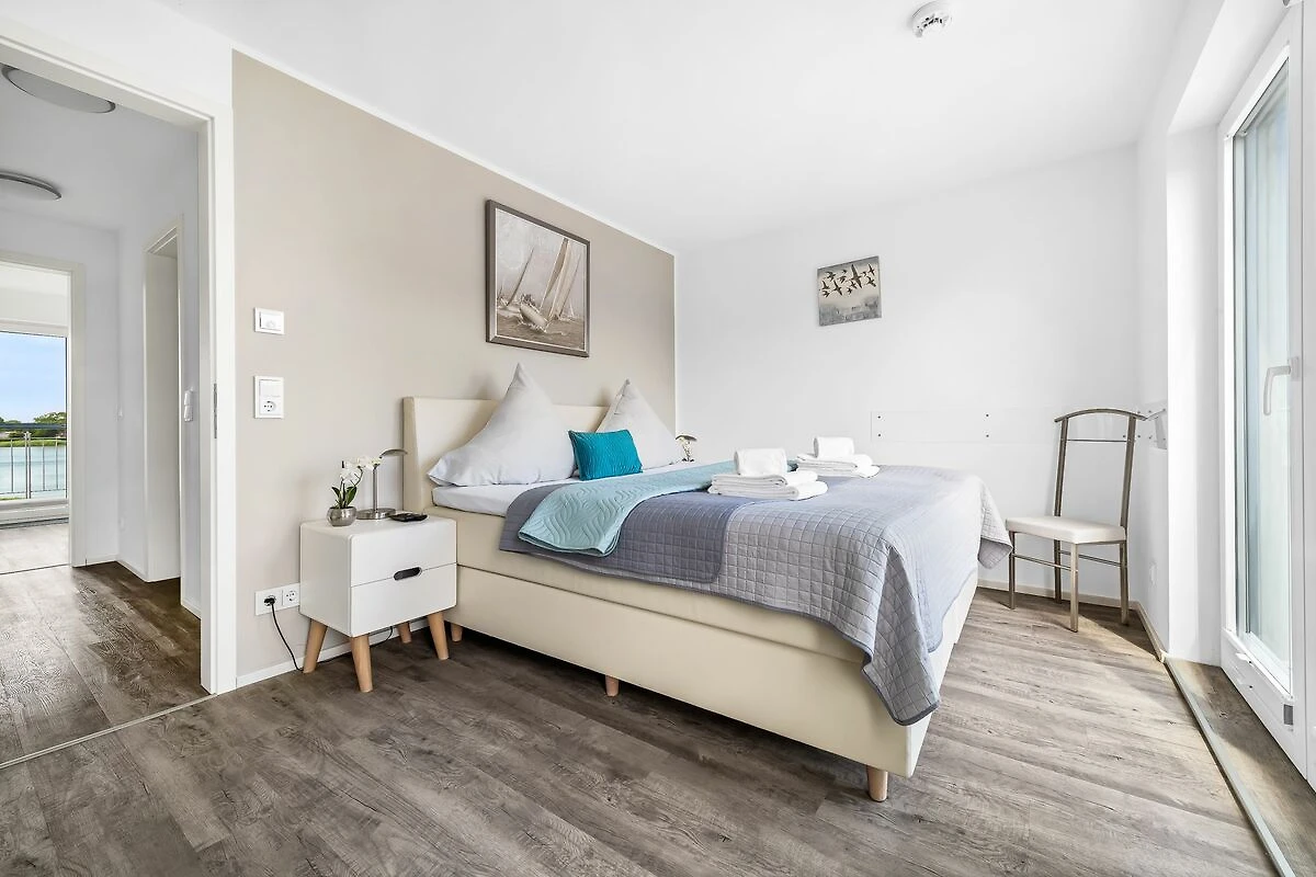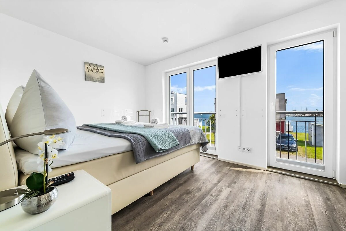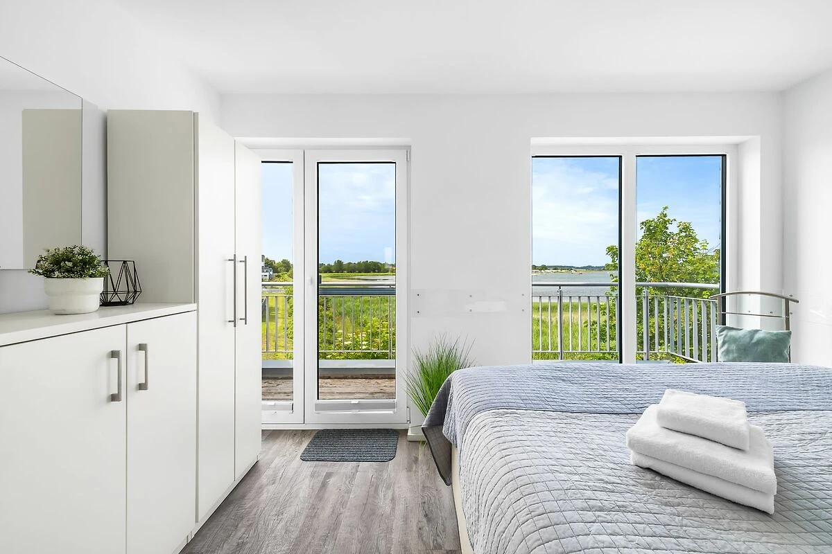 Im Obergeschoss befinden sich die beiden Schlafzimmer. Das eine Schlafzimmer ist mit einem gemütlichen Boxspring-Doppelbett ausgestattet und bietet Dir einen traumhaften Blick auf die Schlei. Das andere Schlafzimmer verfügt ebenfalls über ein Boxspring-Doppelbett (180 x 200 cm) und bietet Dir einen weiteren Schlafplatz auf einem Schlafsessel (100 x 200 cm). In diesem Schlafzimmer befindet sich zusätzlich ein Flachbild-Fernseher, zudem hast Du von hier aus einen wunderbaren Blick auf die Marina des Resorts.