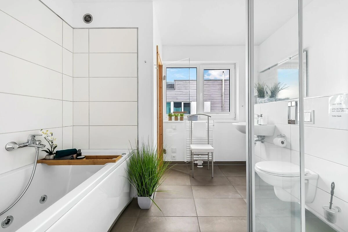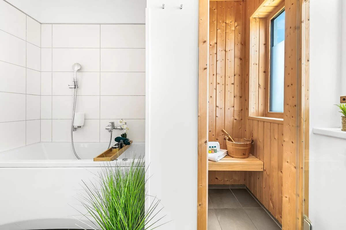 Das große Wellnessbad mit eigener finnischer Sauna ist ein absolutes Highlight. Entspanne hier wahlweise in der Whirlwanne oder unter der Dusche.