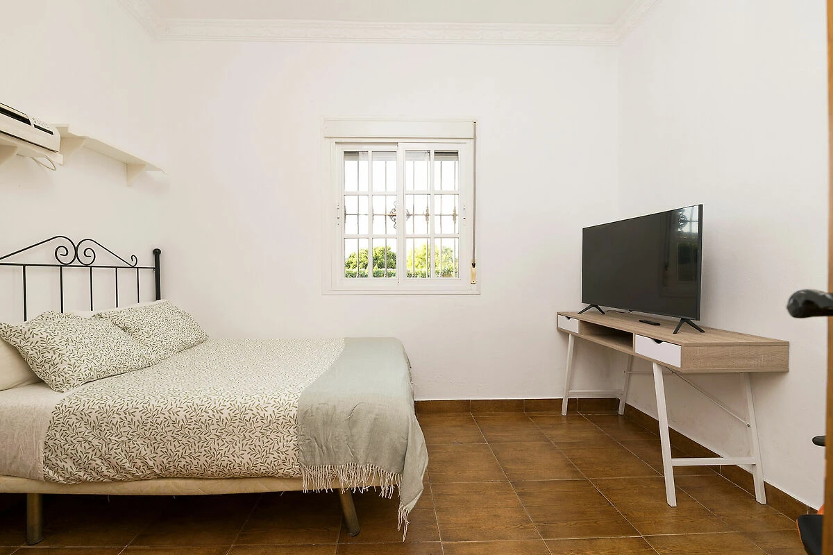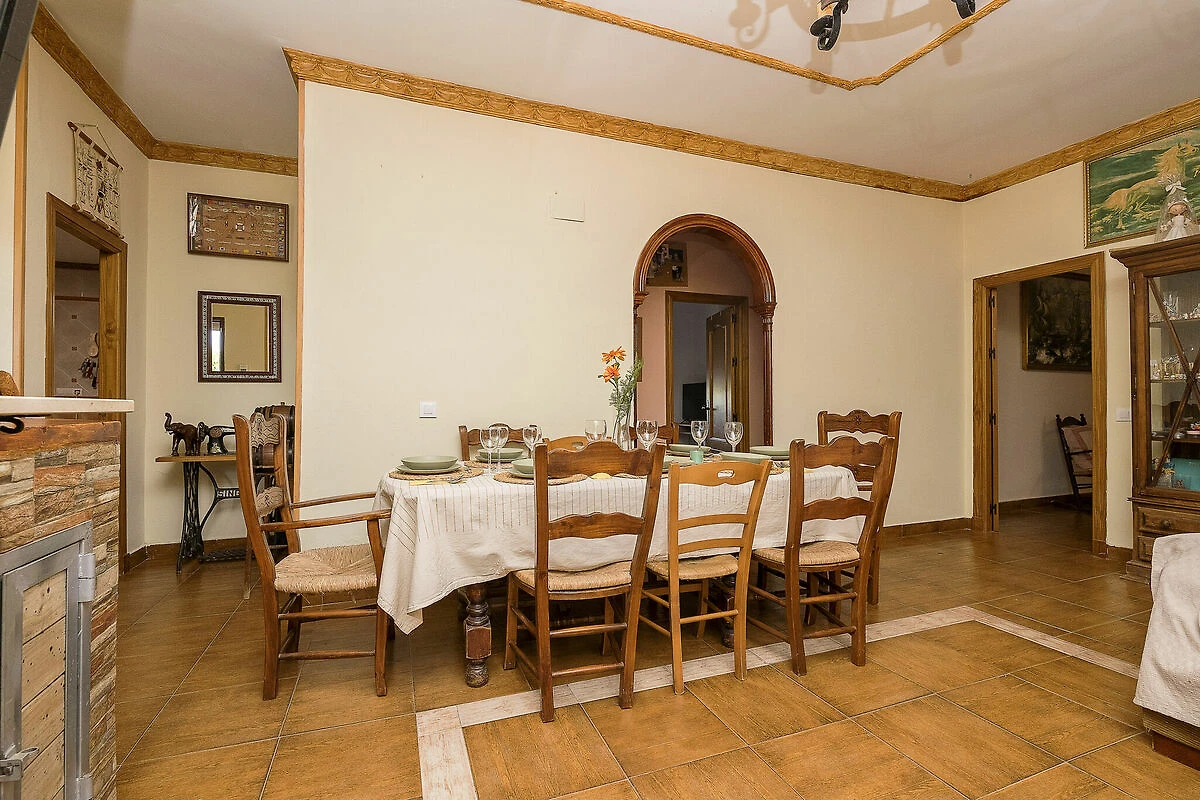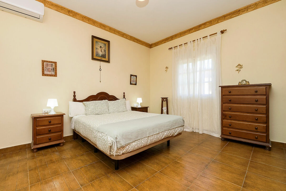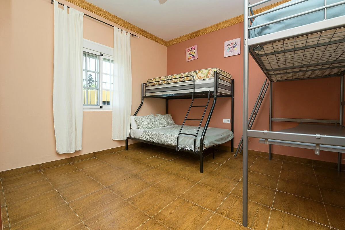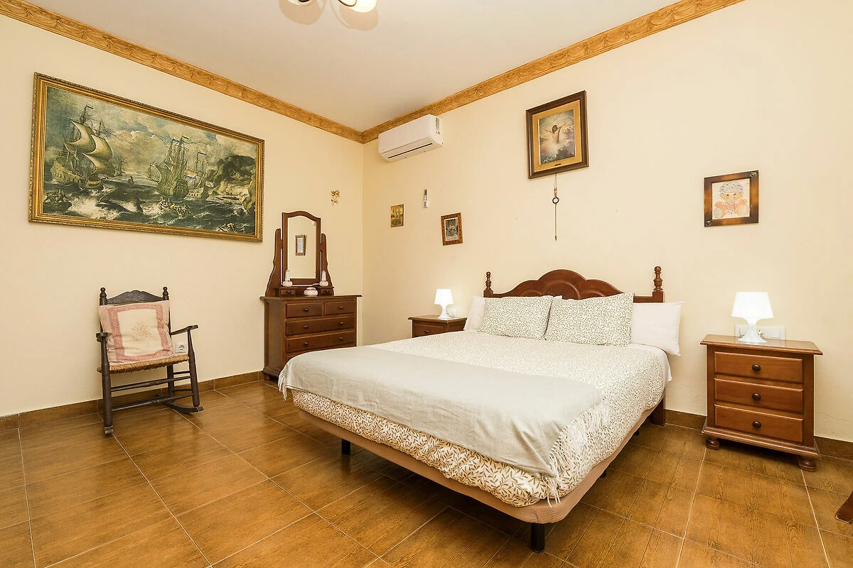 Alle Räume verteilen sich auf einer Etage. Sie kommen in ein geräumiges Wohn-Esszimmer mit Fernseher (spanische Kanäle) und Kamin, von hier aus geht es in die Küche mit Cerankochfeld, die mit allen notwendigen Utensilien ausgestattet ist, damit Sie bequem kochen können. Es gibt eine Waschmaschine, ein Bügeleisen und ein Bügelbrett. Insgesamt sind drei Schlafzimmer vorhanden. Das erste Schlafzimmer hat ein Doppelbett, eine Klimaanlage und einen Kleiderschrank. Das zweite Schlafzimmer hat ein Etagenbett für 3 Personen, ein Hochbett für 1 Person und einen Kleiderschrank und das dritte Schlafzimmer hat ein Doppelbett und einen Kleiderschrank. Wenn Sie mit Ihrem Baby reisen, können wir auf Anfrage ein Kinderbett und einen Hochstuhl zur Verfügung stellen. Es gibt zwei Bäder, eines mit Dusche und Badewanne und das andere, im Außenbereich, nur über die Terrasse zu erreichen, ebenfalls mit Dusche. Im Bad im Außenbereich steht kein warmes Wasser zur Verfügung.