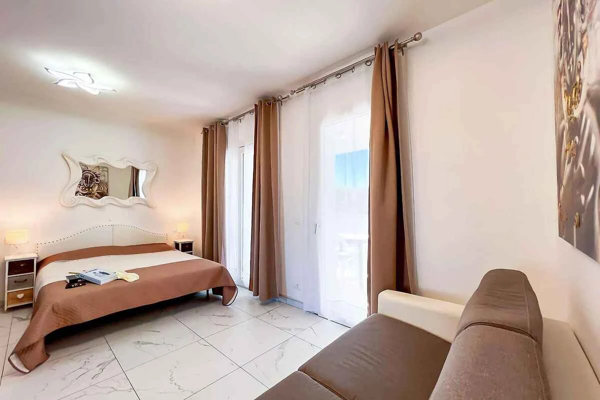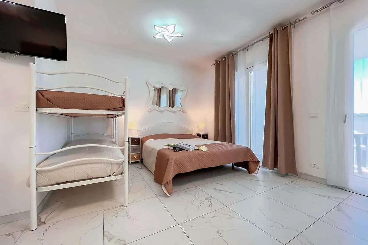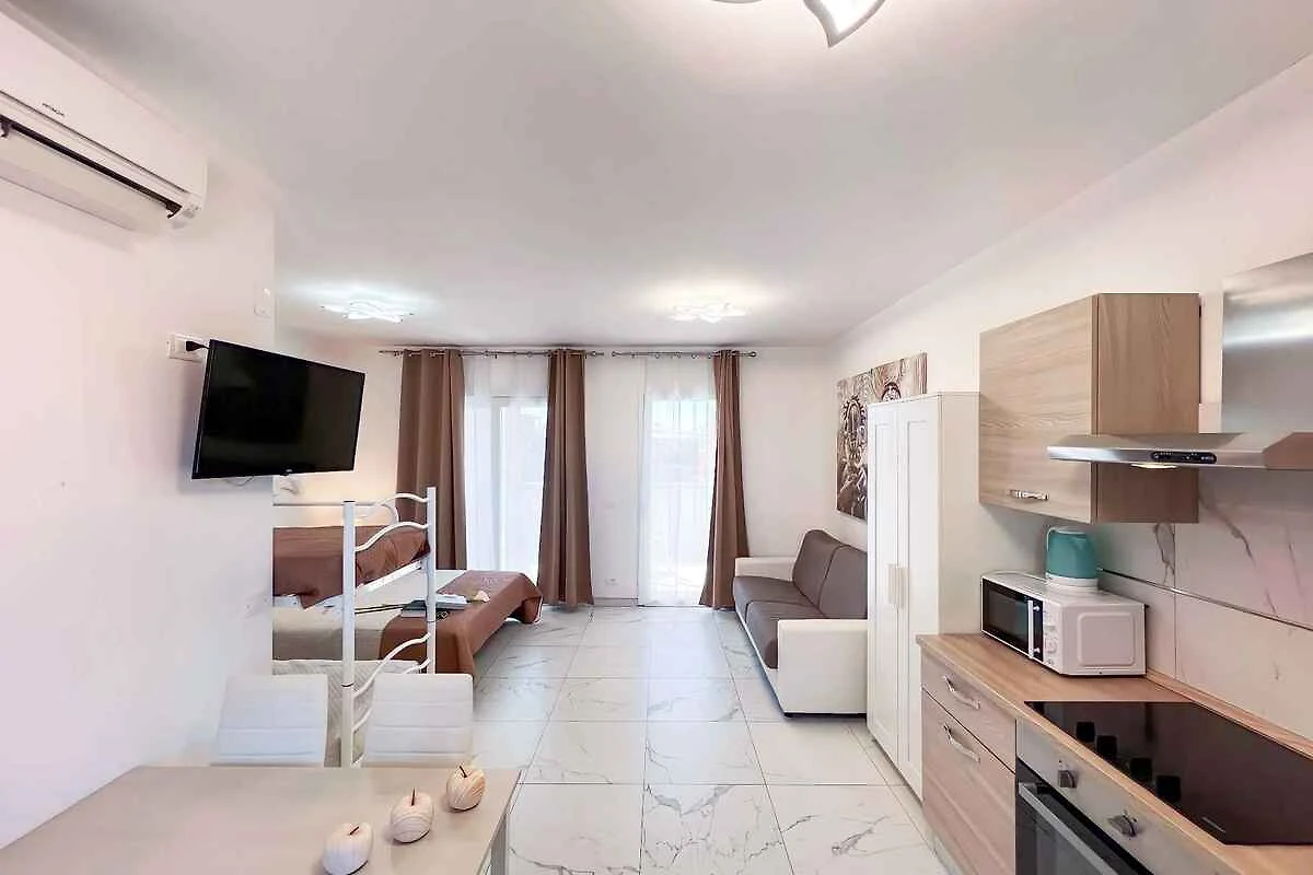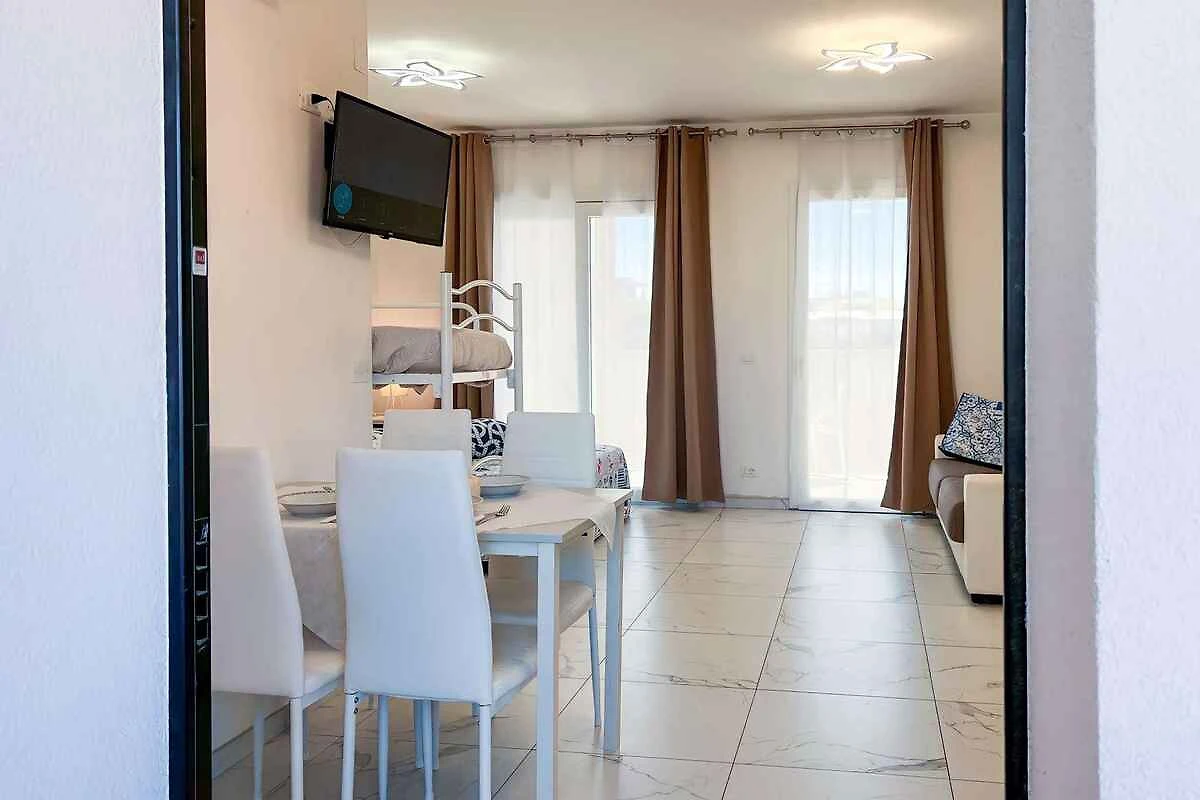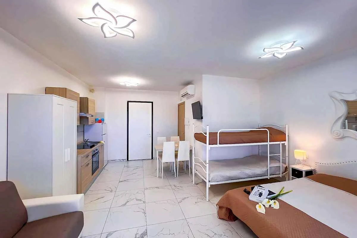 Der Eingang in Ihr Studio befindet sich im Obergeschoss und führt direkt in die Wohnküche. Kochnische im Wohn/Schlafzimmer mit Essecke (4 Plätze), Elektroherd (4 Platten), Kühlschrank und Mikrowelle. Bad mit Dusche, 1 Waschbecken, WC und Bidet. Wohn/Schlafzimmer mit 1 Doppelbett, 2 Zusatzbetten auf Doppelausziehcouch und 1 Etagenbett.