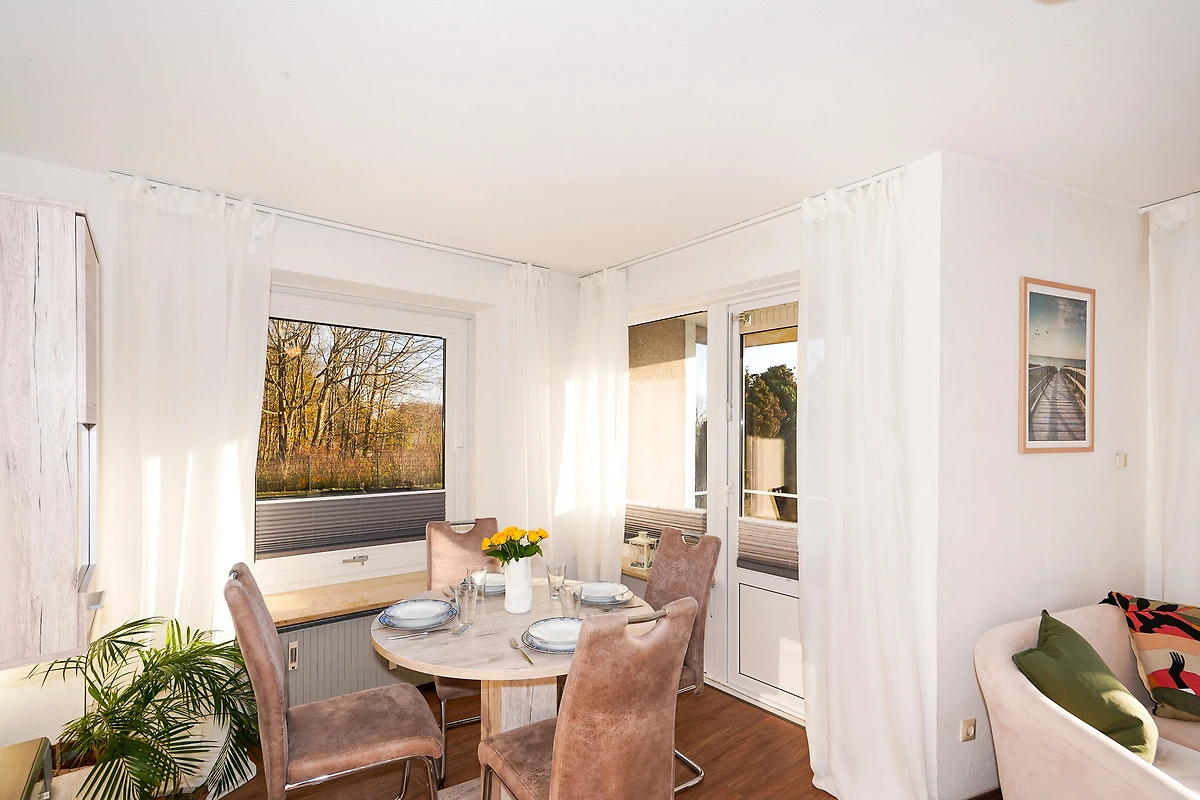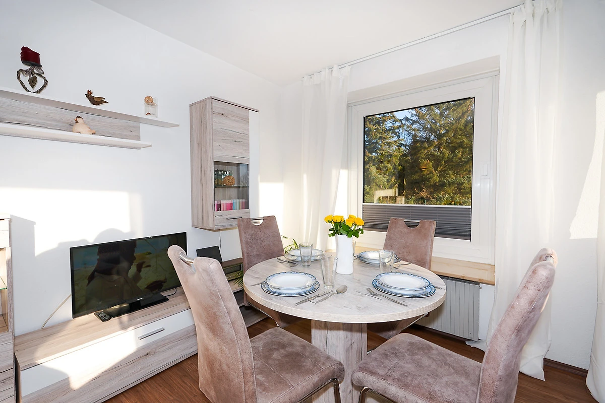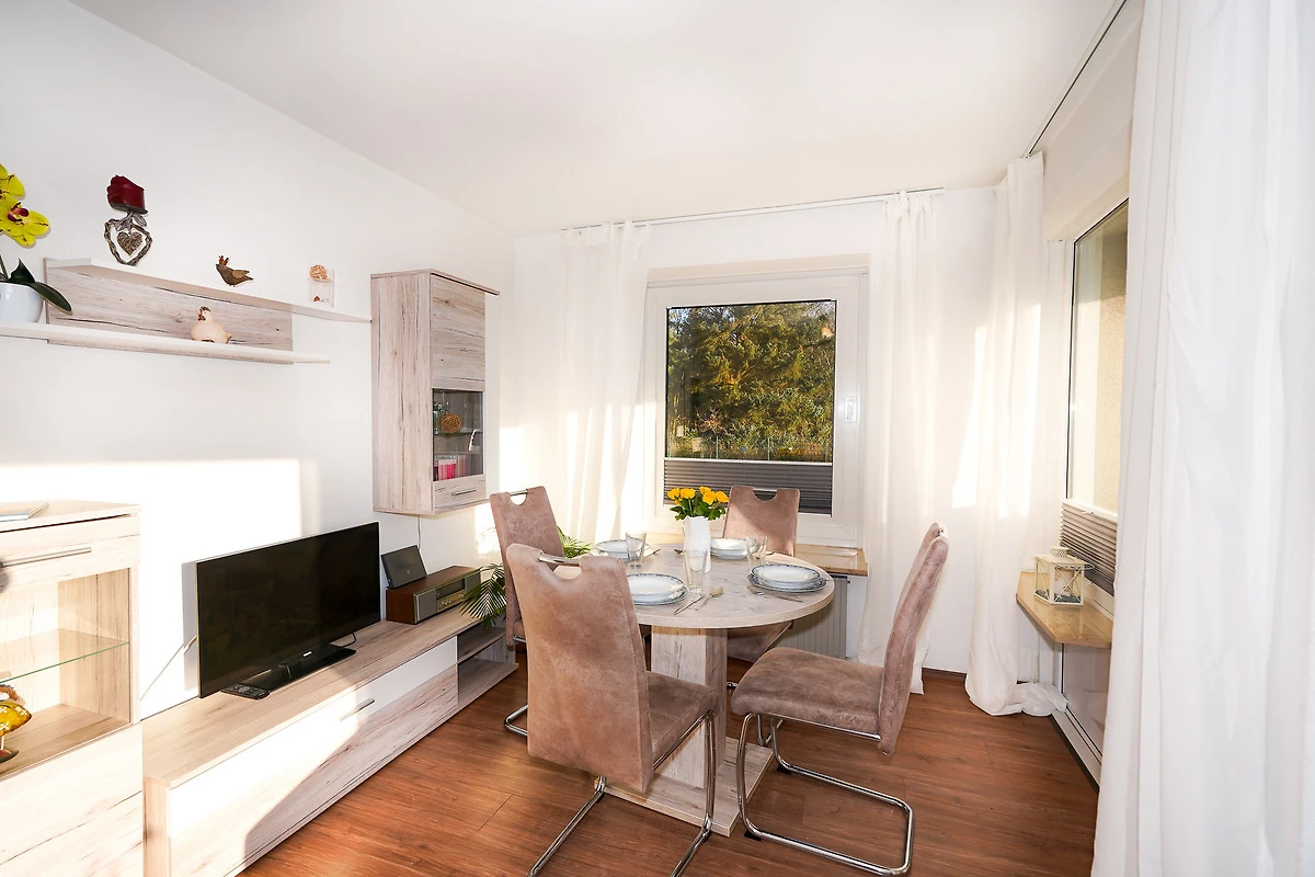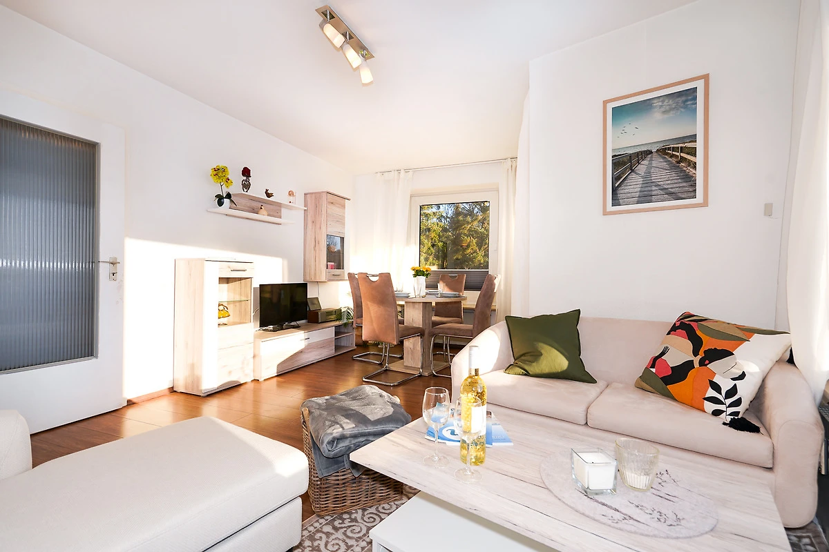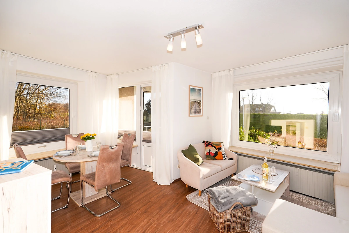 Das gemütlich eingerichtete Wohnzimmer bietet Ihnen ein Sofa, eine Schlafcouch (160 x 120 cm) und einen Esstisch mit 4 Stühlen. Ein SAT-Flat-TV und kostenloses W-LAN laden zu entspannten Abenden ein. Vom Wohnzimmer gelangen Sie direkt auf den Balkon.