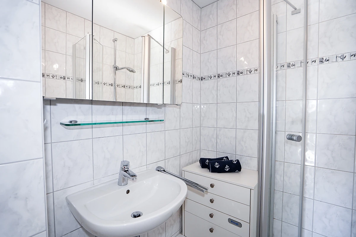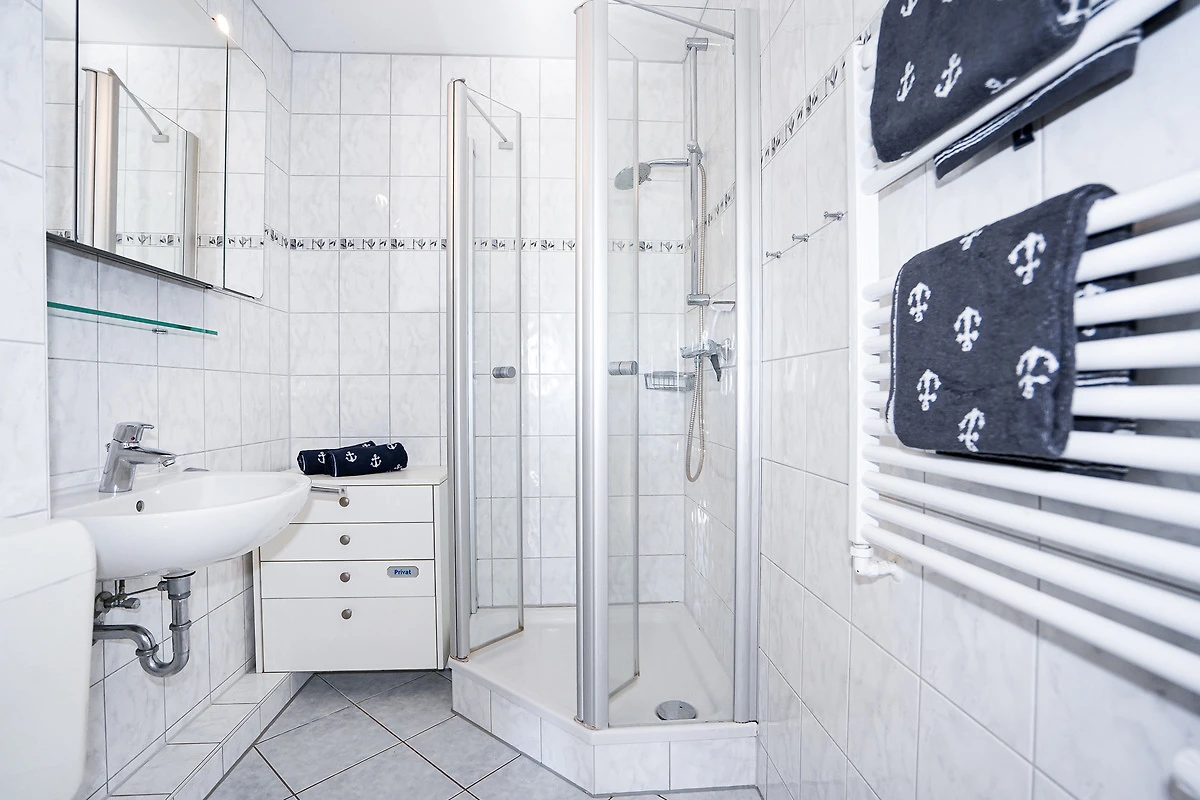 Das Badezimmer verfügt über WC, Waschbecken, Eckdusche, Handtuchheizkörper und viele Ablagemöglichkeiten. Das Schlafzimmer bietet Ihnen ein Boxspringbett (180 x 200 cm), Schubladenschränke und zwei Nachttische.