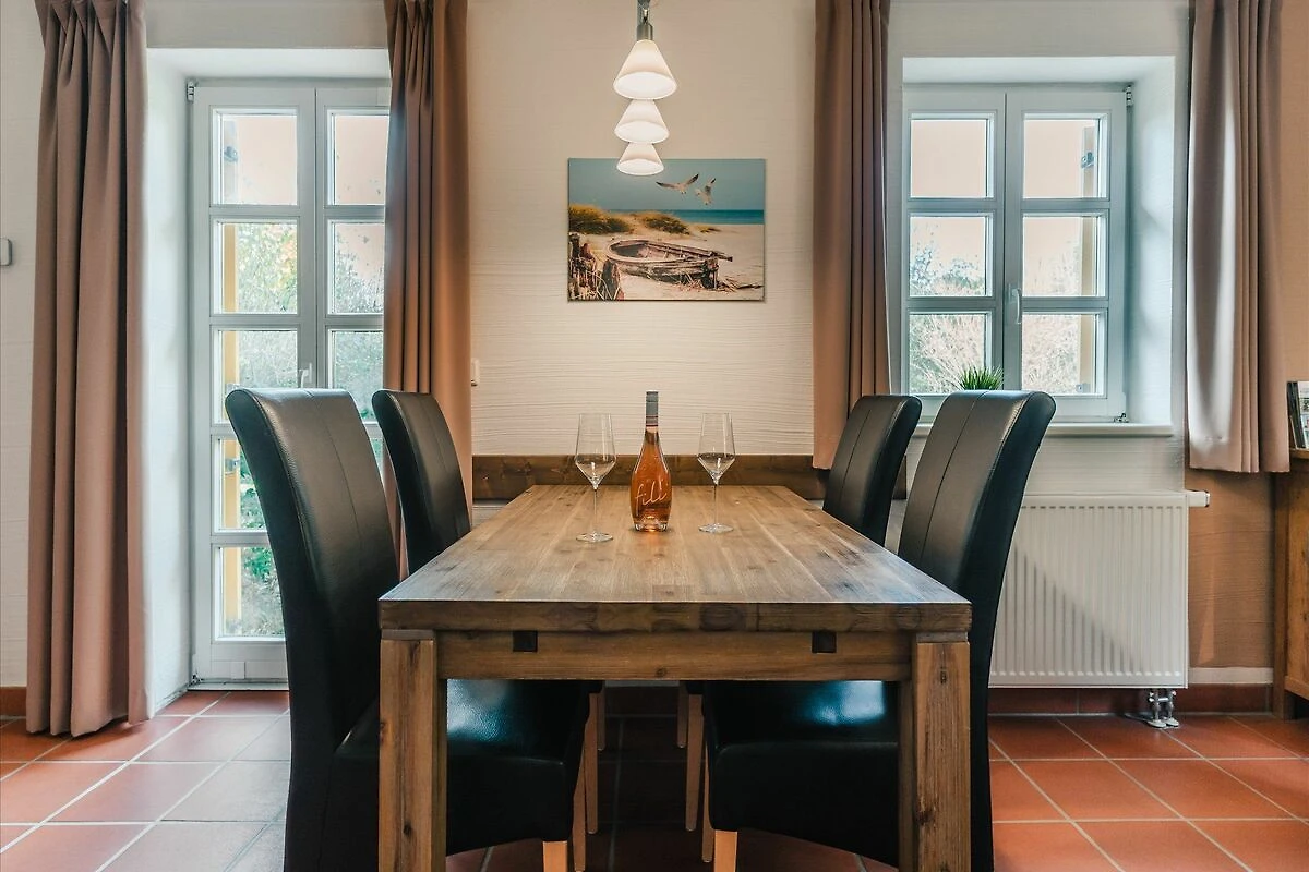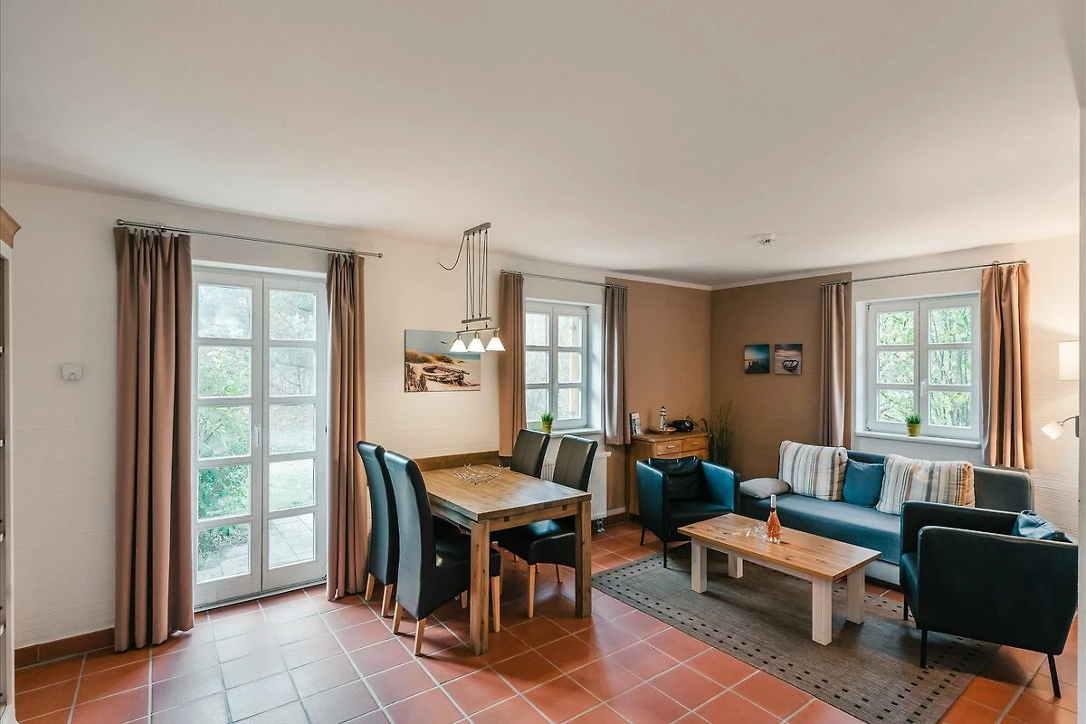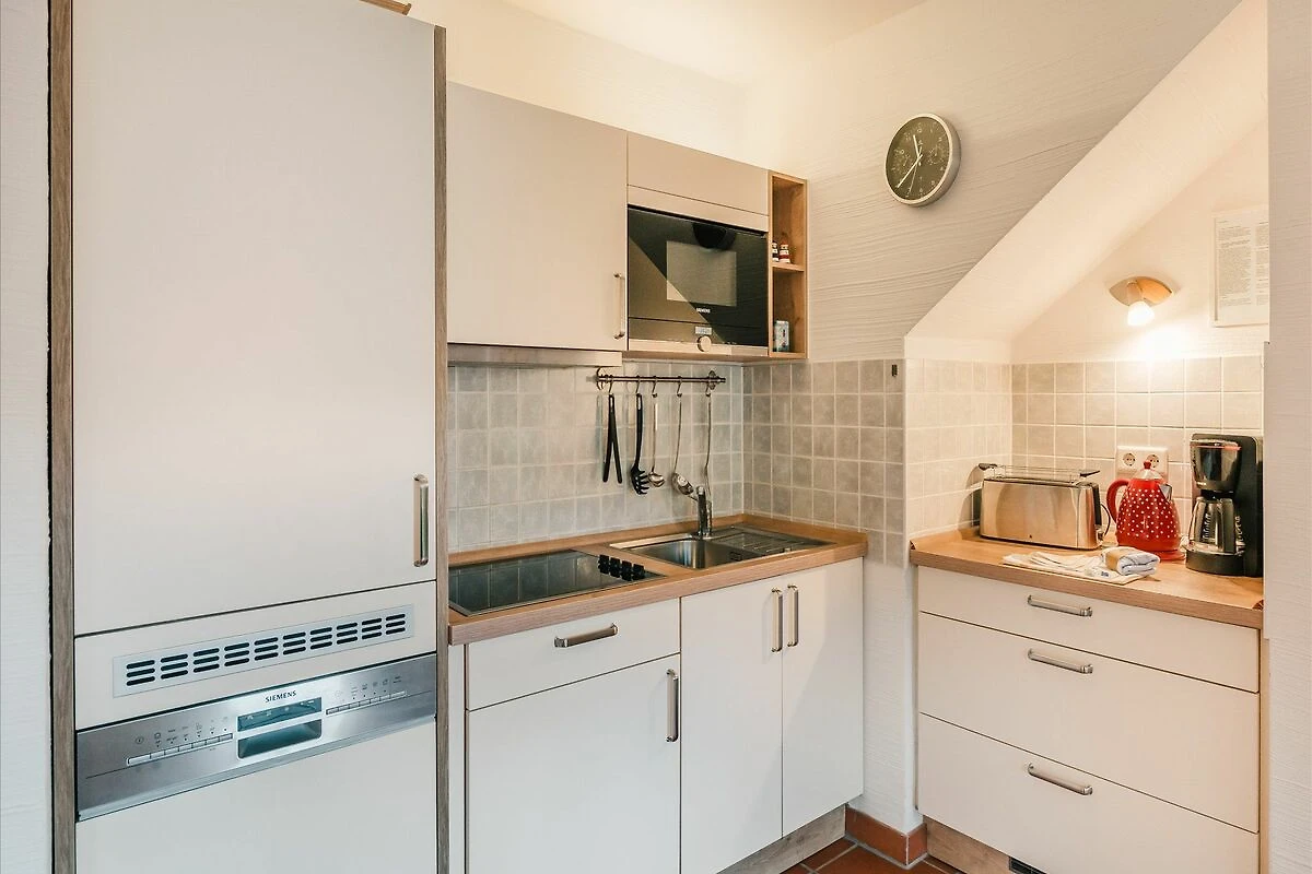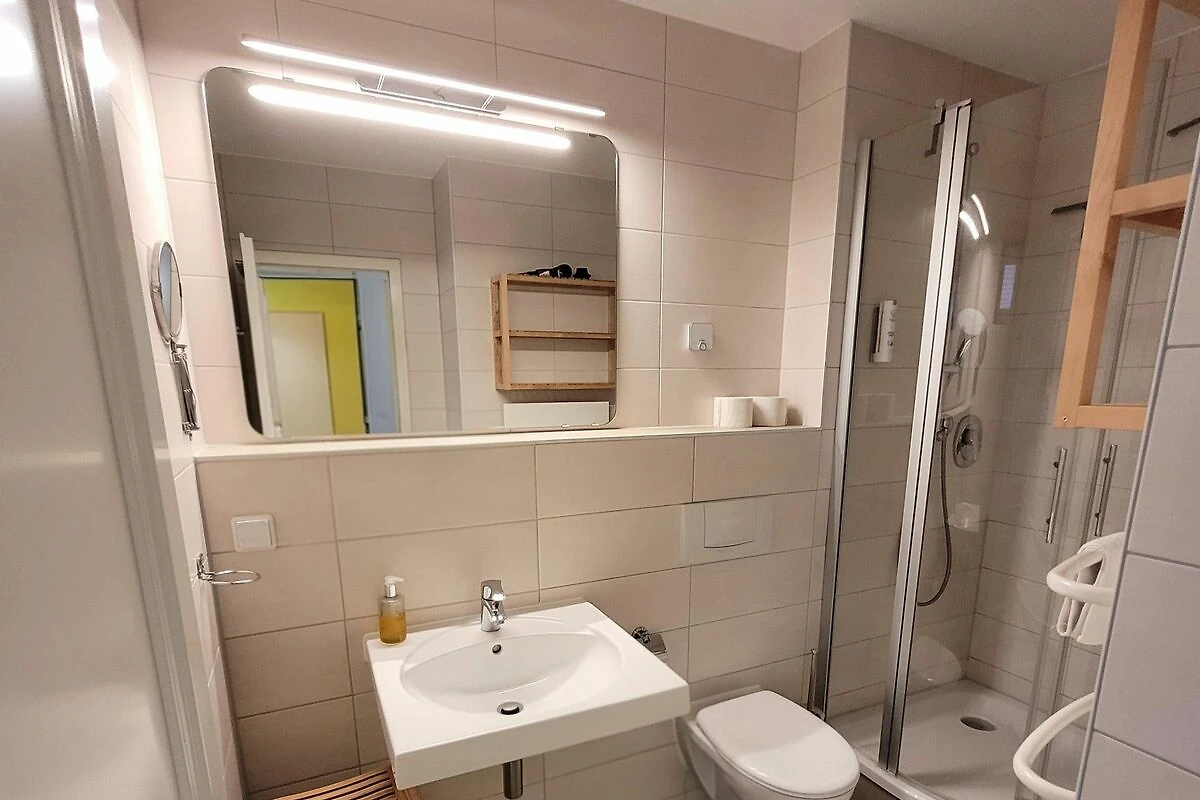 Diese komfortable Ferienwohnung lädt Sie zu einem Frühstück auf Ihrer privaten Terrasse ein. Der Wohnraum verbindet ein gemütliches Wohnzimmer mit einem Essbereich und einer voll ausgestatteten Küche. Vorhanden sind ein Geschirrspüler, ein Backofen mit Cerankochfeld, eine Kaffeemaschine, ein Wasserkocher und ein Toaster. Das Wohnzimmer punktet neben einem Schlafsofa auch mit einem LCD-TV. Im Schlafzimmer steht ein Doppelbett. Das Badezimmer überzeugt mit einer Dusche, einem Waschbecken, einem WC und einem großen Spiegel.