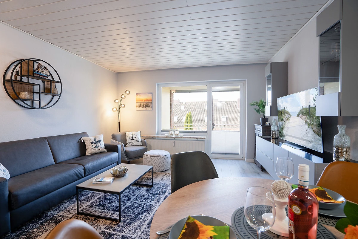 • Wohnbereich: Behagliches Wohnzimmer mit Ledersofa, Fernseher und Zugang zu einem kleinen Balkon.