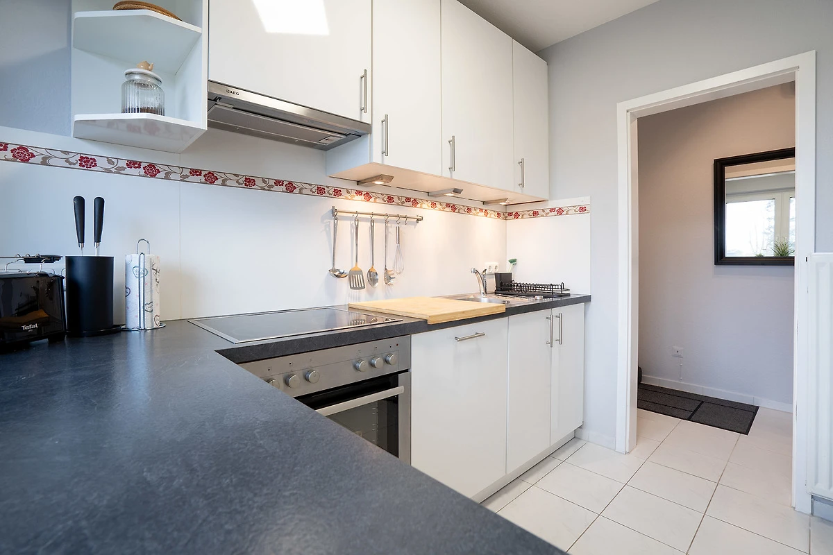 • Küche: Voll ausgestattete Küche mit Herd, Backofen, Kühlschrank und Geschirrspüler.