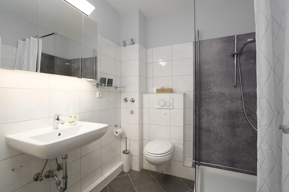 • Badezimmer: Dusche, WC, Waschbecken; Fön vorhanden.
