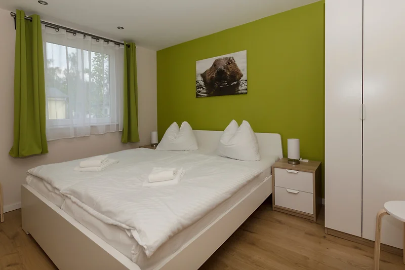 Das komfortable Ferienhaus Biber hat eine Wohnfläche von 45 m² und ist für 4 Personen eingerichtet. Es bietet 2 Schlafzimmer mit je 2 Betten. Eine moderne Einbauküche bietet viel Komfort. Das Bad hat eine ebenerdige Dusche und Fussbodenheizung. Im Wohnzimmer gibt es eine gemütliche Sofaecke und einen grossen Esstisch. Die überdachte Terrasse ermöglicht, dass man bei allen Wetterlagen geschützt, die Ruhe und Idylle in Lochow geniessen kann. Der Lochower See, mit Badestelle, befindet sich in 5 min Entfernung. WLAN und Telefon stehen kostenlos zur Verfügung. Der Parkplatz ist direkt vor dem Haus. Spielplatz, Sandkasten und Schaukel befinden sich auf dem Grundstück.
