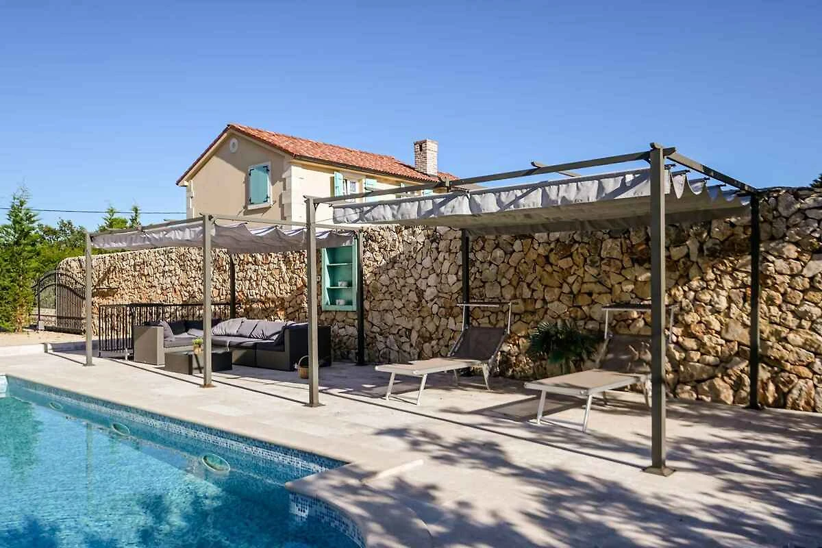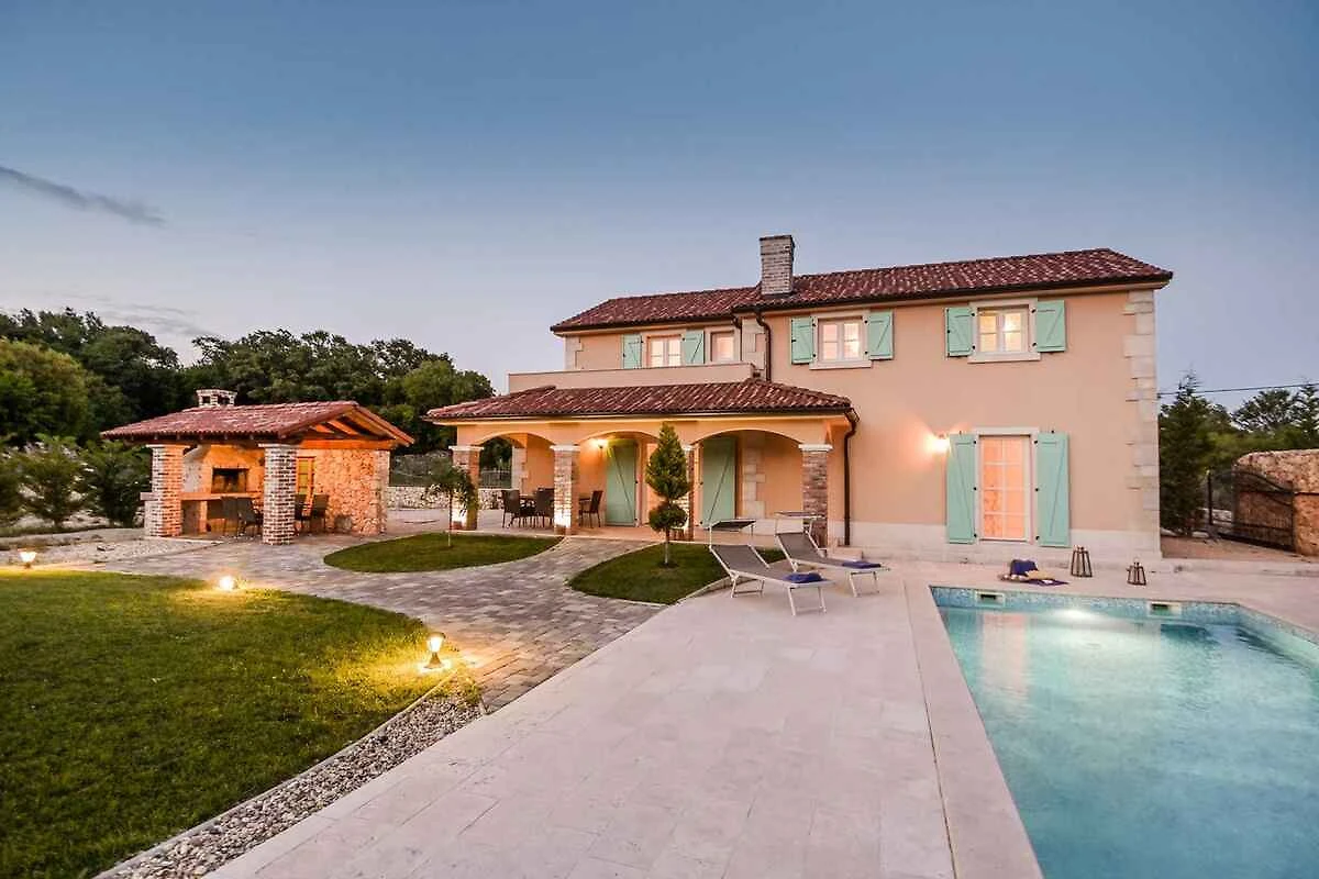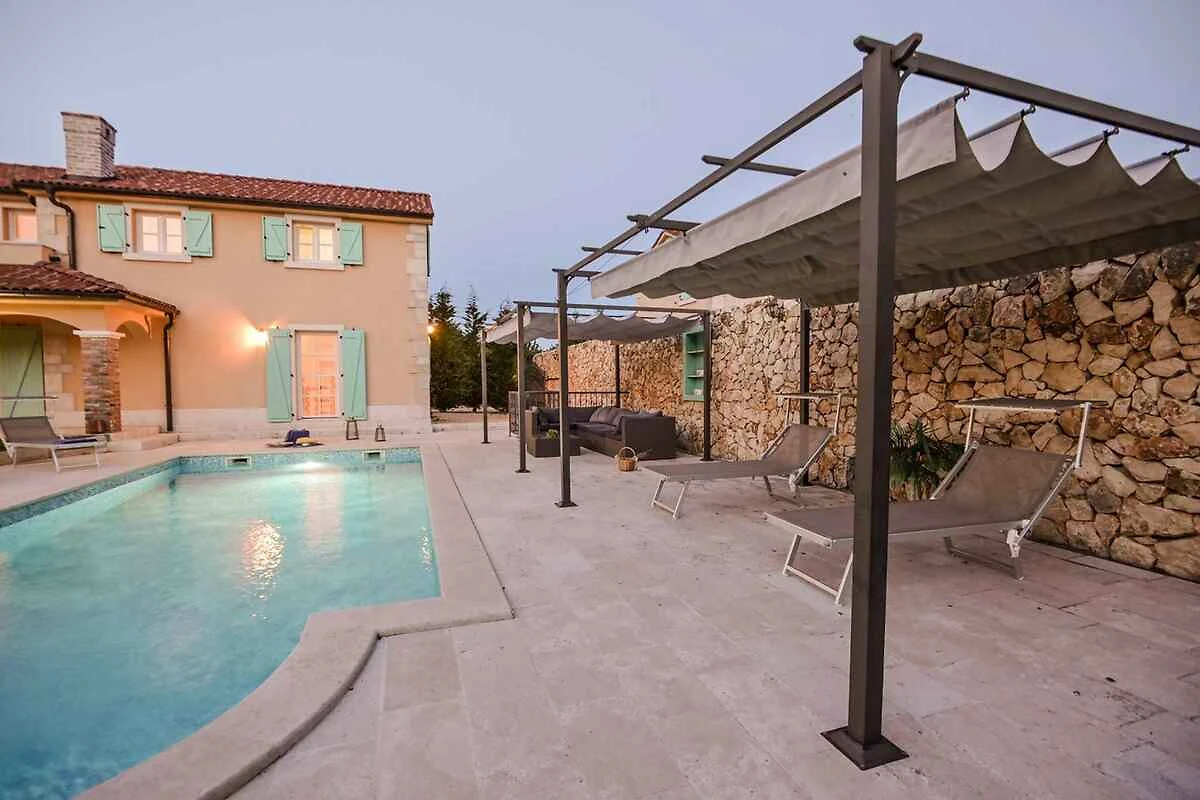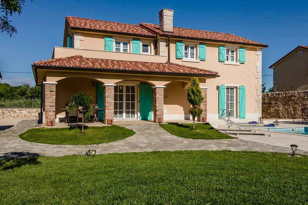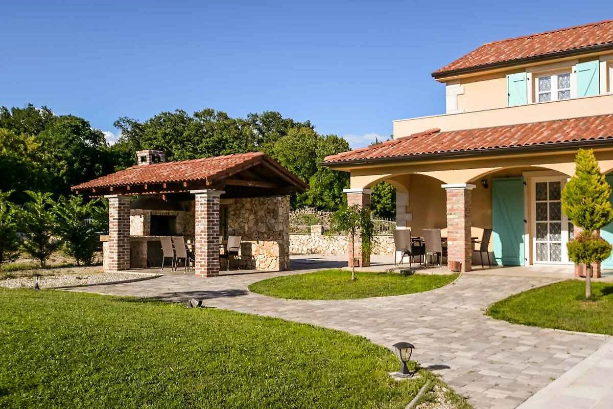 Dobrinj. Die Villa befindet sich auf einem geschlossenen Gartengrundstück mit Blumen, Sträuchern und Bäumen, von einem Zaun begrenzt. Ruhige, grüne Lage. Die Zufahrt erfolgt über eine Nebenstrasse (asphaltiert). Parkplatz auf dem Grundstück.